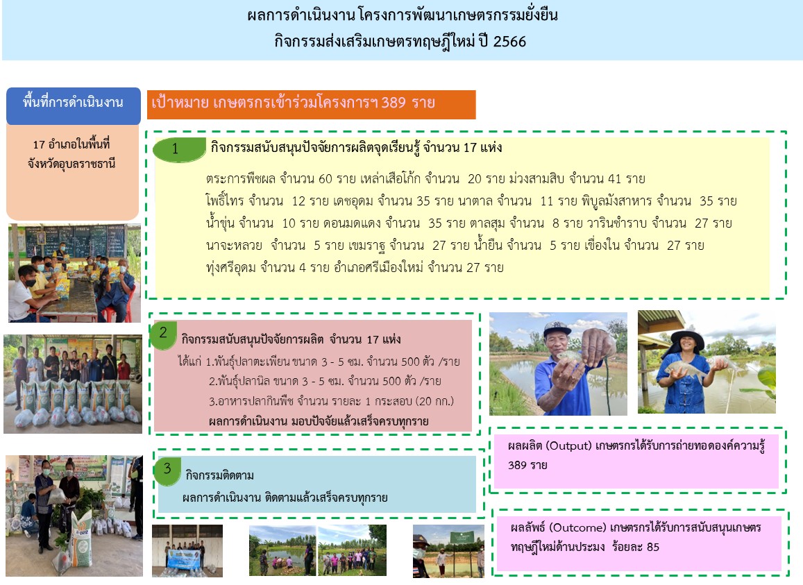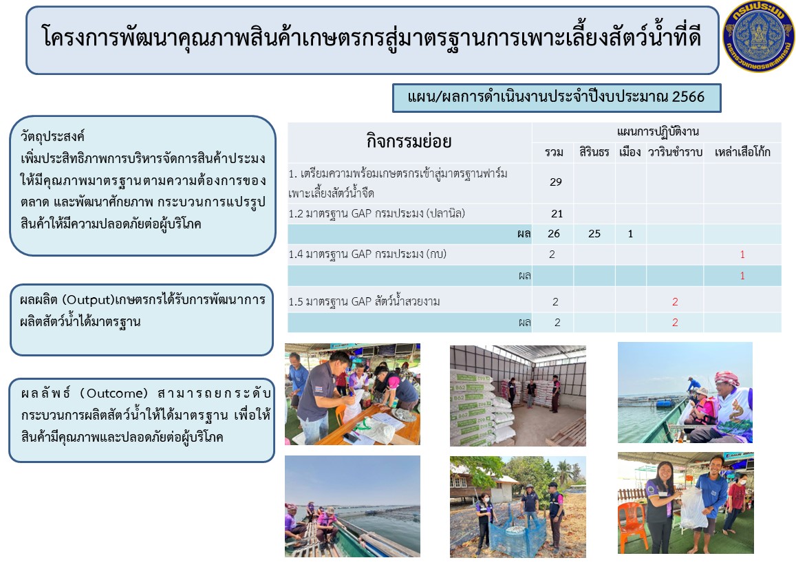 ในโอกาสนี้ สำนักงานประมงจังหวัด ได้นำเสนอรายงานโครงการภายใต้กิจกรรมยั่งยืน จำนวน 3 โครงการ ได้แก่ โครงการยกระดับมาตรฐานฟาร์ม GAP และโครงการส่งเสริมเกษตรกรทฤษฎีใหม่ ปี 2566 โครงการพัฒนาเกษตรกรรมยั่งยืน กิจกรรมพัฒนาเกษตรอินทรีย์ (ด้านการเพาะเลี้ยงสัตว์น้ำจืด) ประจำปี 2566 และโครงการคัดเลือกเกษตรกร และสถาบันเกษตรกรดีเด่นด้านการประมง