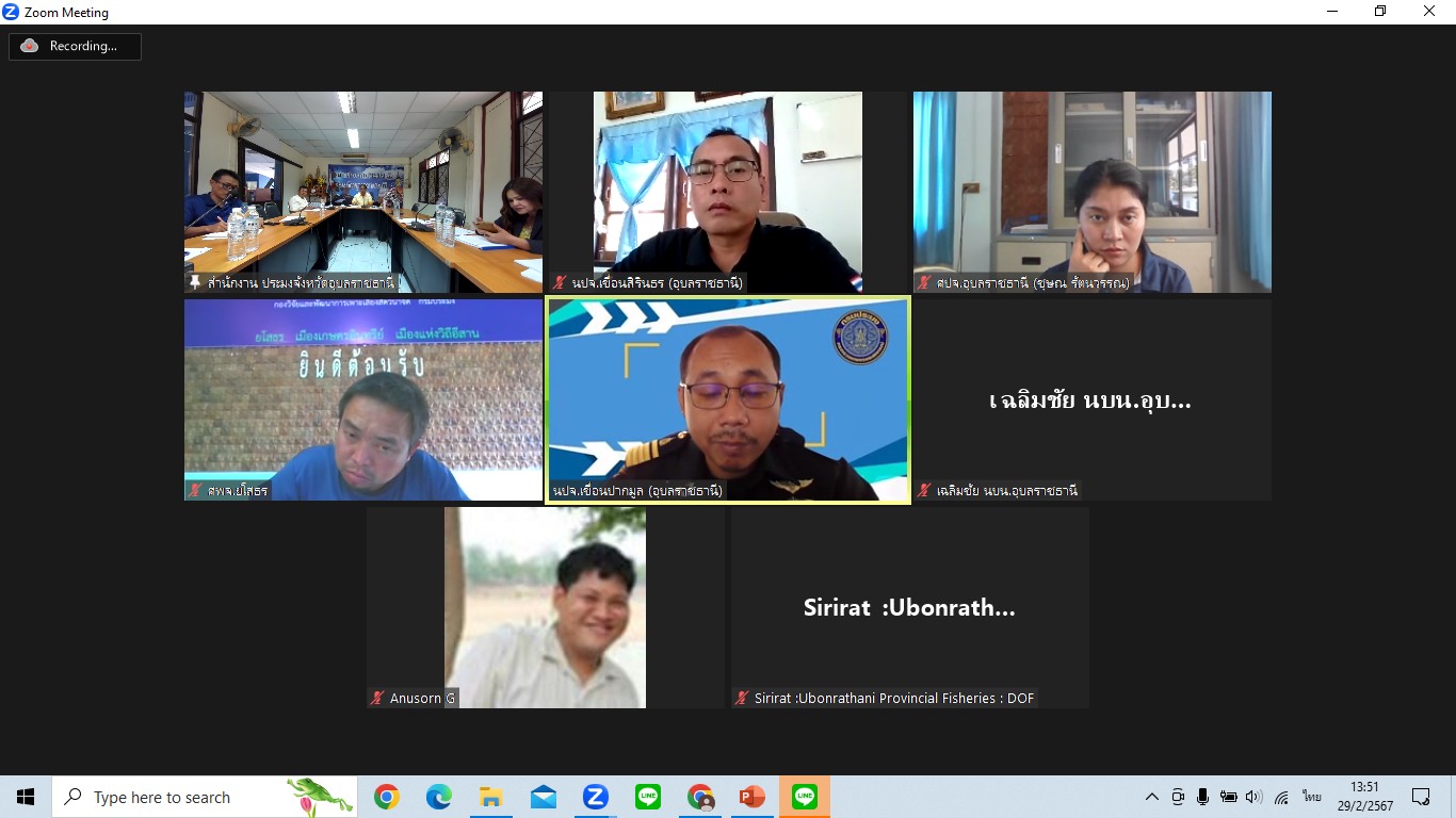 วันที่ 29 กุมภาพันธ์ 2567 เวลา 13.30 น. นายประชุม ดวนใหญ่ นักวิชาการประมงชำนาญการพิเศษ รักษาราชการแทน ประมงจังหวัดอุบลราชธานี การประมง พร้อมด้วย นายสุนทร รุ่งเรือง หัวหน้ากลุ่มบริหารจัดการด้านการประมงและนางเพชรรัตน์ สมเสนาะ หัวหน้ากลุ่มบริหารและยุทธศาสตร์ ร่วมประชุม เข้าร่วมประชุมคณะกรรมการขับเคลื่อนนโยบาย ของกรมประมง (FIsheries Co-ordinator : FC)  ครั้งที่ 2/2567 เพื่อรับฟังผลการปฏิบัติงาน อุปสรรคในการดำเนินงาน ตลอดจนหารือในการบูรณาการร่วมกันระหว่างหน่วยงานในสังกัดกรมประมง ผ่านระบบประชุมทางไกล Application ZOOM  ณ ห้องประชุมสำนักงานประมงจังหวัดอุบลราชธานี