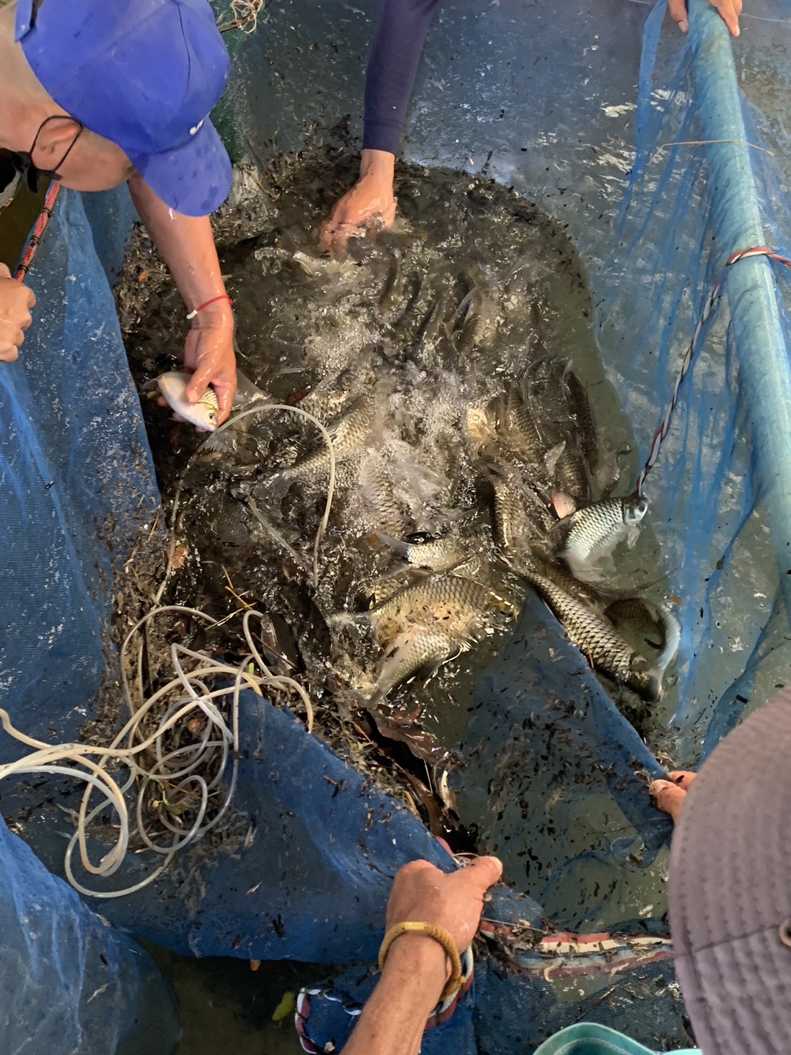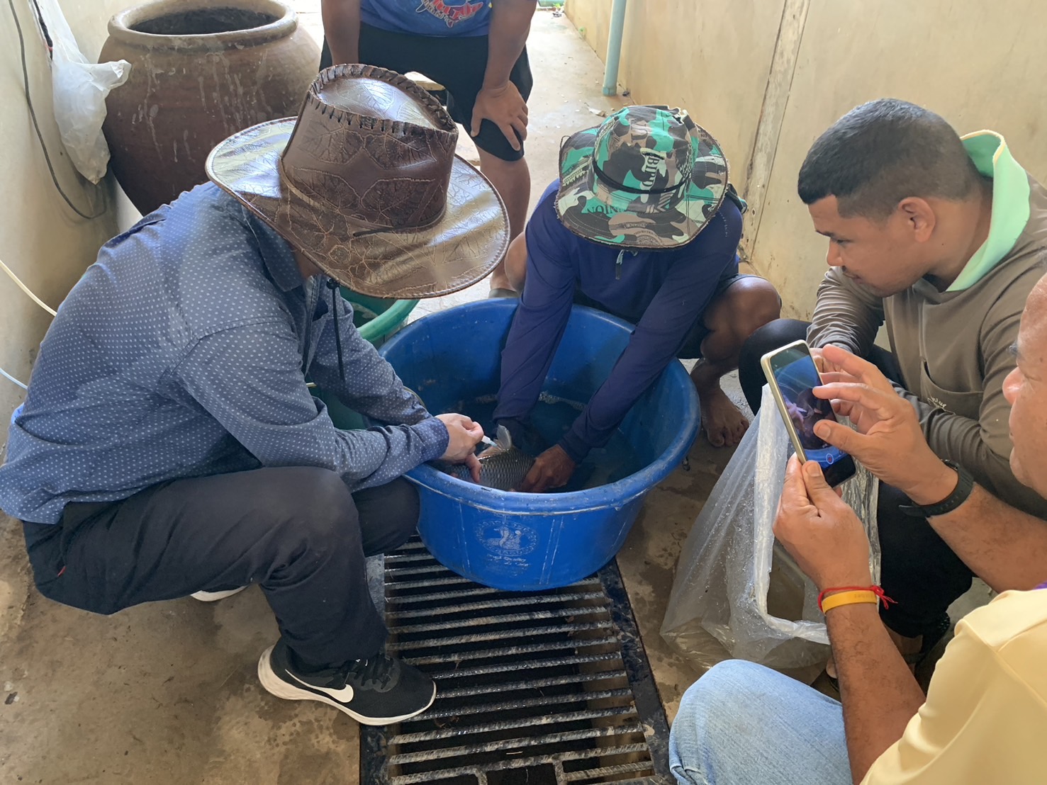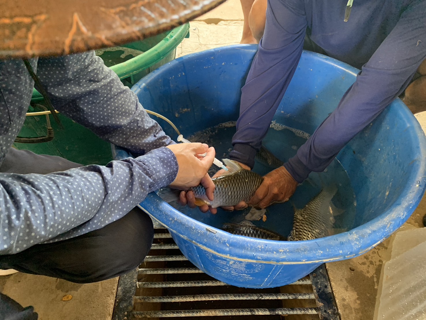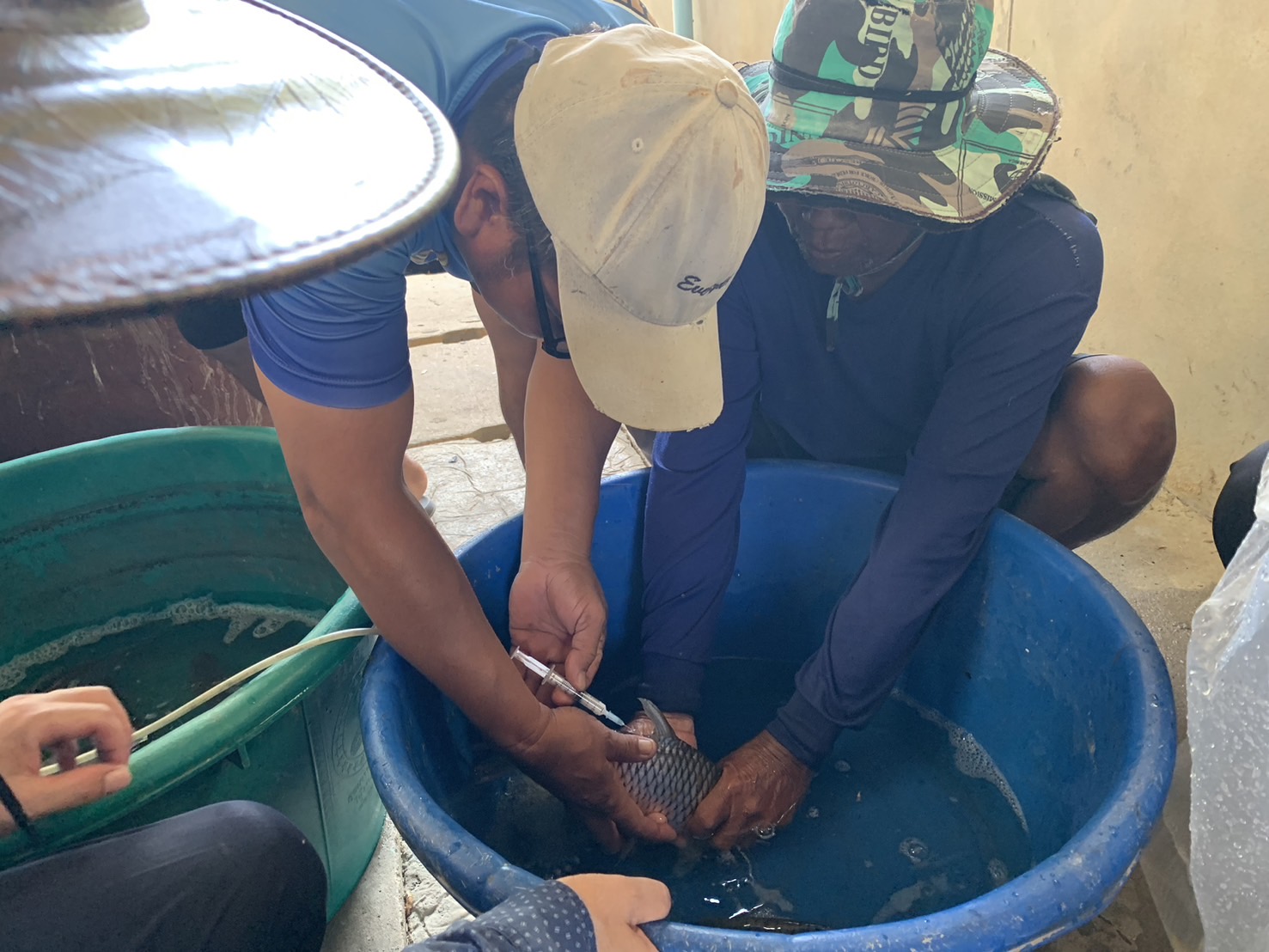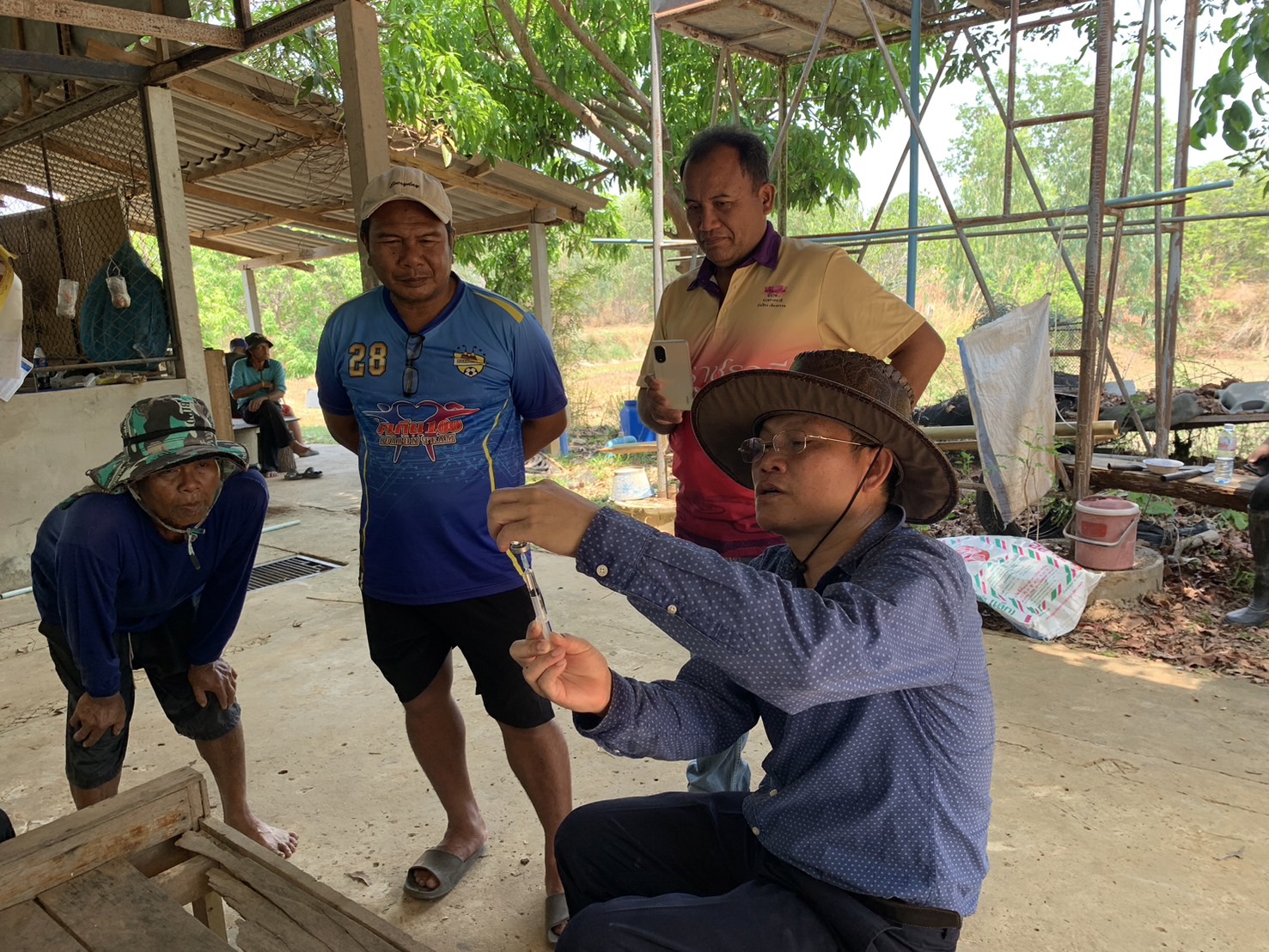 วันที่ 4 เมษายน 2567 นายวิทยา โกษาผล ประมงอำเภอเขื่องใน พร้อมด้วยว่าที่ร้อยตรีวุฒิชาติ เชื้อชม เจ้าพนักงานประมง กลุ่มพัฒนาและส่งเสริมอาชีพการประมง  สนง.ปจ.อบลราชธานี นำเกษตรกรพื้นที่ตำบลหัวดอน จำนวน 3 รายศึกษาดูงานการเพาะพันธุ์ปลาตะเพียนขาว ด้วยชุดเพาะพันธุ์ปลาเคลื่อนที่ กระชังผ้าโอล่อนแก้วในบ่อดิน ณ ฟาร์มตัวอย่างตามแนวพระราชดำริบ้านยางน้อย โดยใช้ฮอร์โมนสังเคราะห์ buserelin acetate ความเข้มข้น 15 ไมโครกรัม ร่วมกับ ยาเสริมฤทธิ์ Domperidone ต่อแม่ปลา 1 กิโลกรัม เพื่อกระตุ้นการตกไข่ของแม่ปลา จำนวน 12 ตัว น้ำหนักรวม 4.5 กิโลกรัม ใช้พ่อพันธุ์ปลา 24 ตัว คาดว่าปลาจะออกไข่เวลาประมาณ 16.00 น.