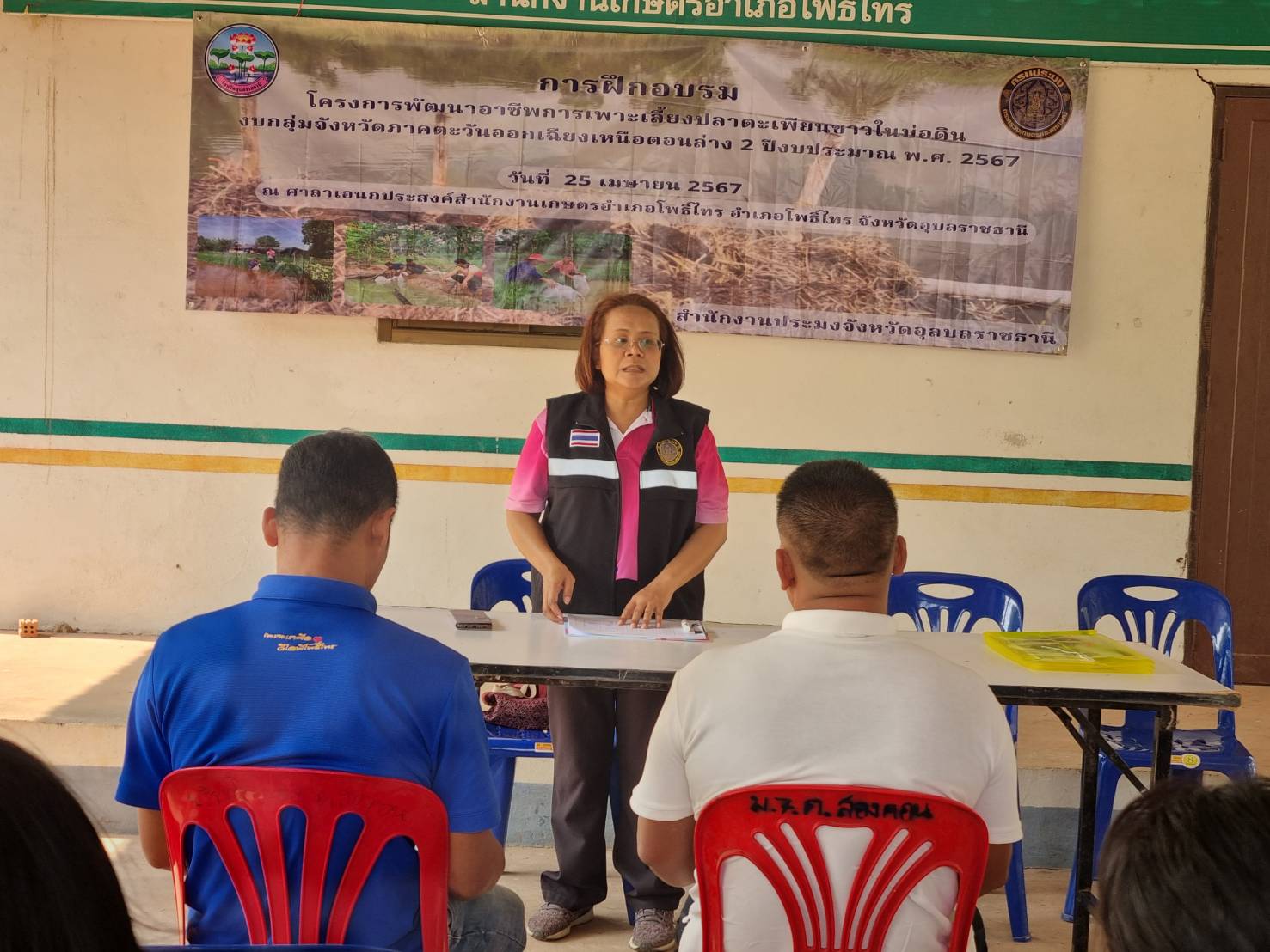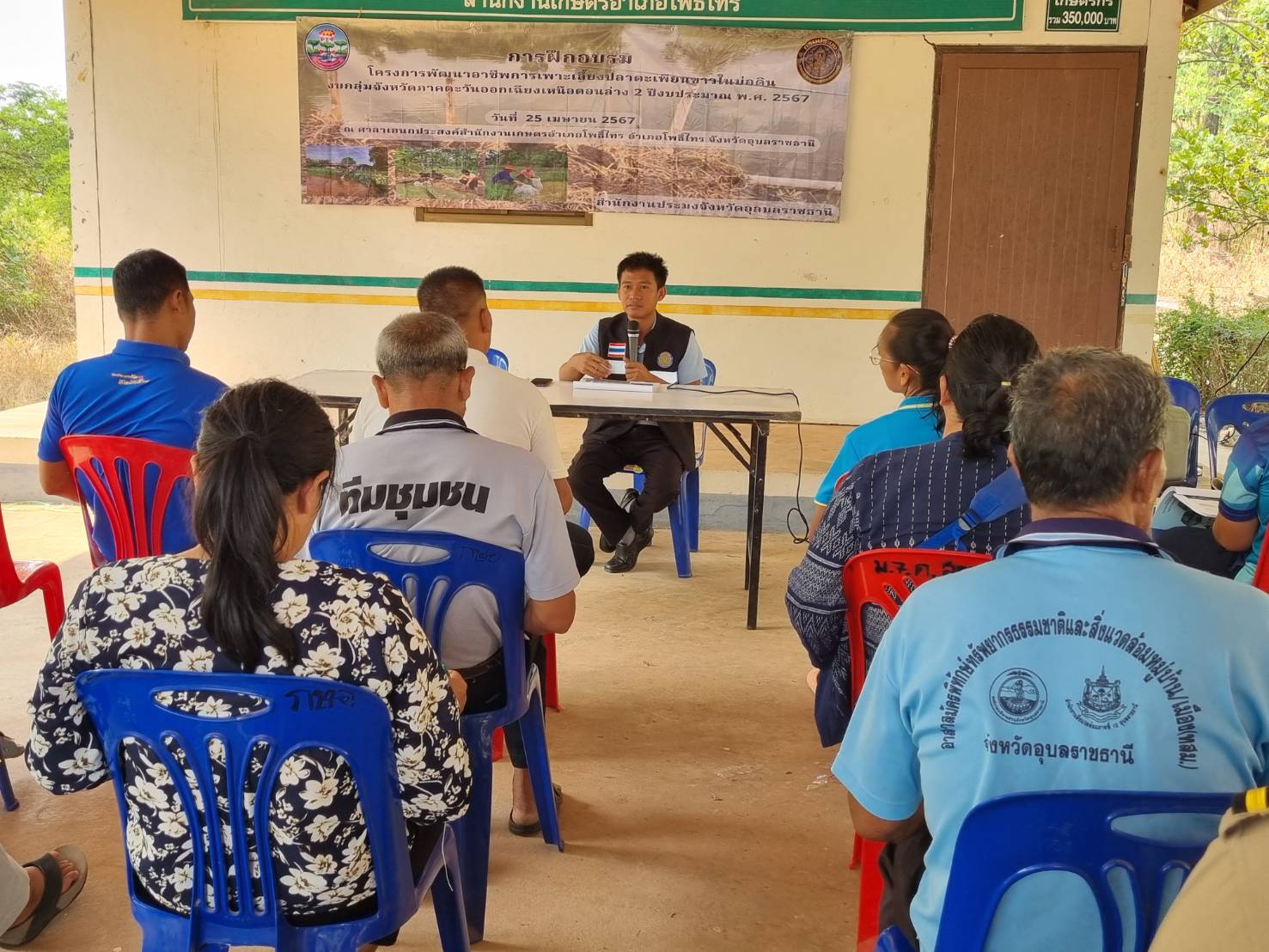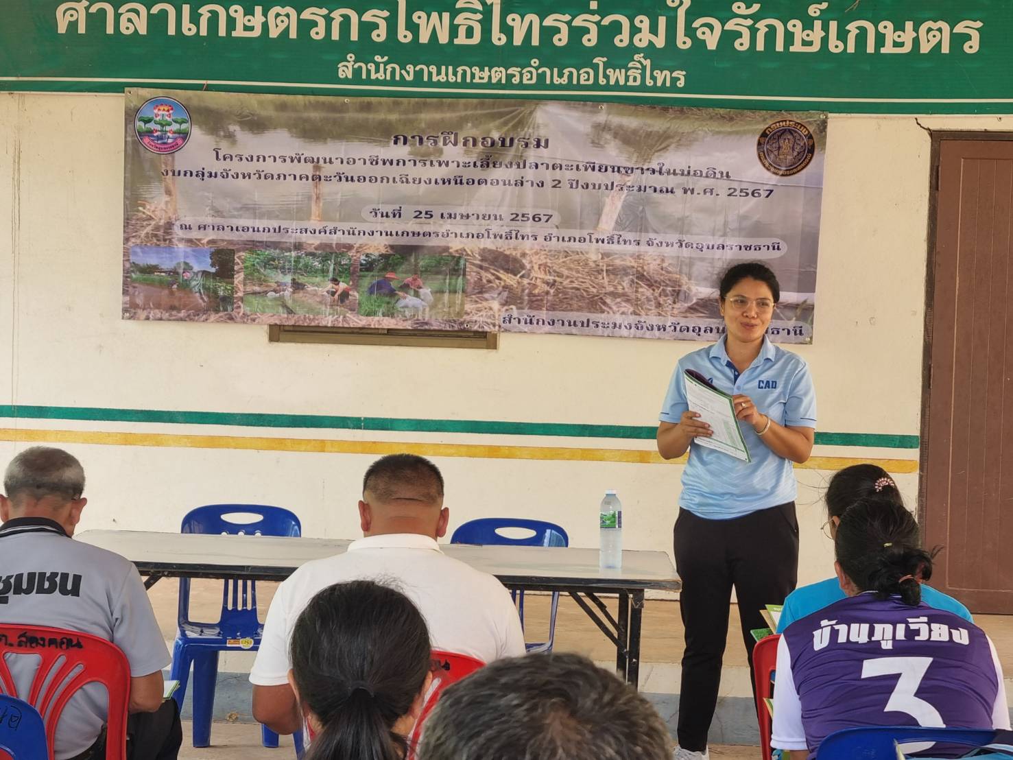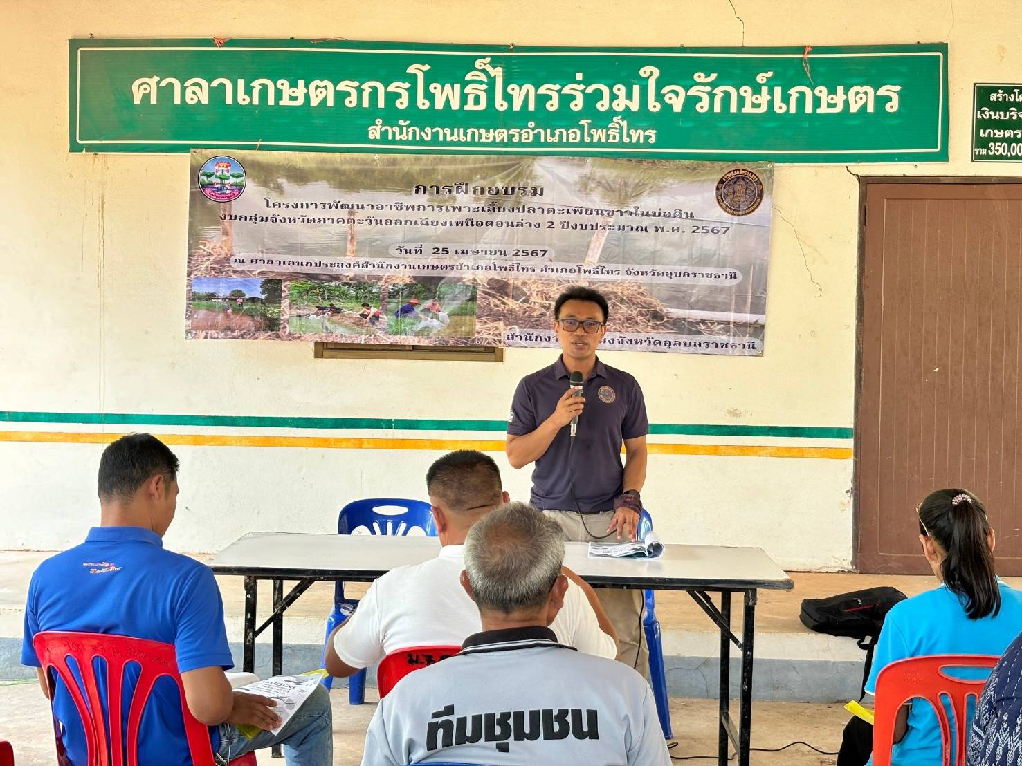 วันพฤหัสบดี ที่ 25 เมษายน 2567 สำนักงานประมงจังหวัดอุบลราชธานี นำโดยนางสาวปวริศา บุตรนามท้าว ประมงอำเภอโพธิ์ไทร นายณัฐวัตร นาจกระโทก นักวิชาการประมง กลุ่มพัฒนาและส่งเสริมอาชีพการประมง และนางสาวเบญจมาภรณ์ ทองไพจิตร นักวิชาการประมง กลุ่มบริหารและยุทธศาสตร์ ร่วมจัดกิจกรรมอบรมเกษตรกรที่เข้าร่วมโครงการพัฒนาอาชีพการเพาะเลี้ยงปลาตะเพียนขาวในบ่อดิน (งบกลุ่มจังหวัดภาคตะวันออกเฉียงเหนือตอนล่าง 2 ปีงบประมาณ 2567) จำนวน 20 ราย ณ ศาลาเกษตรกรโพธิ์ไทรร่วมใจรักษ์เกษตร อำเภอโพธิ์ไทร จังหวัดอุบลราชธานี