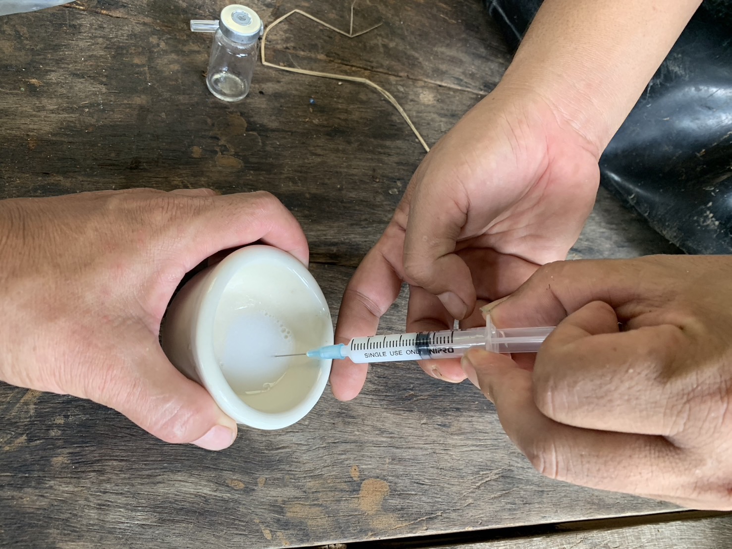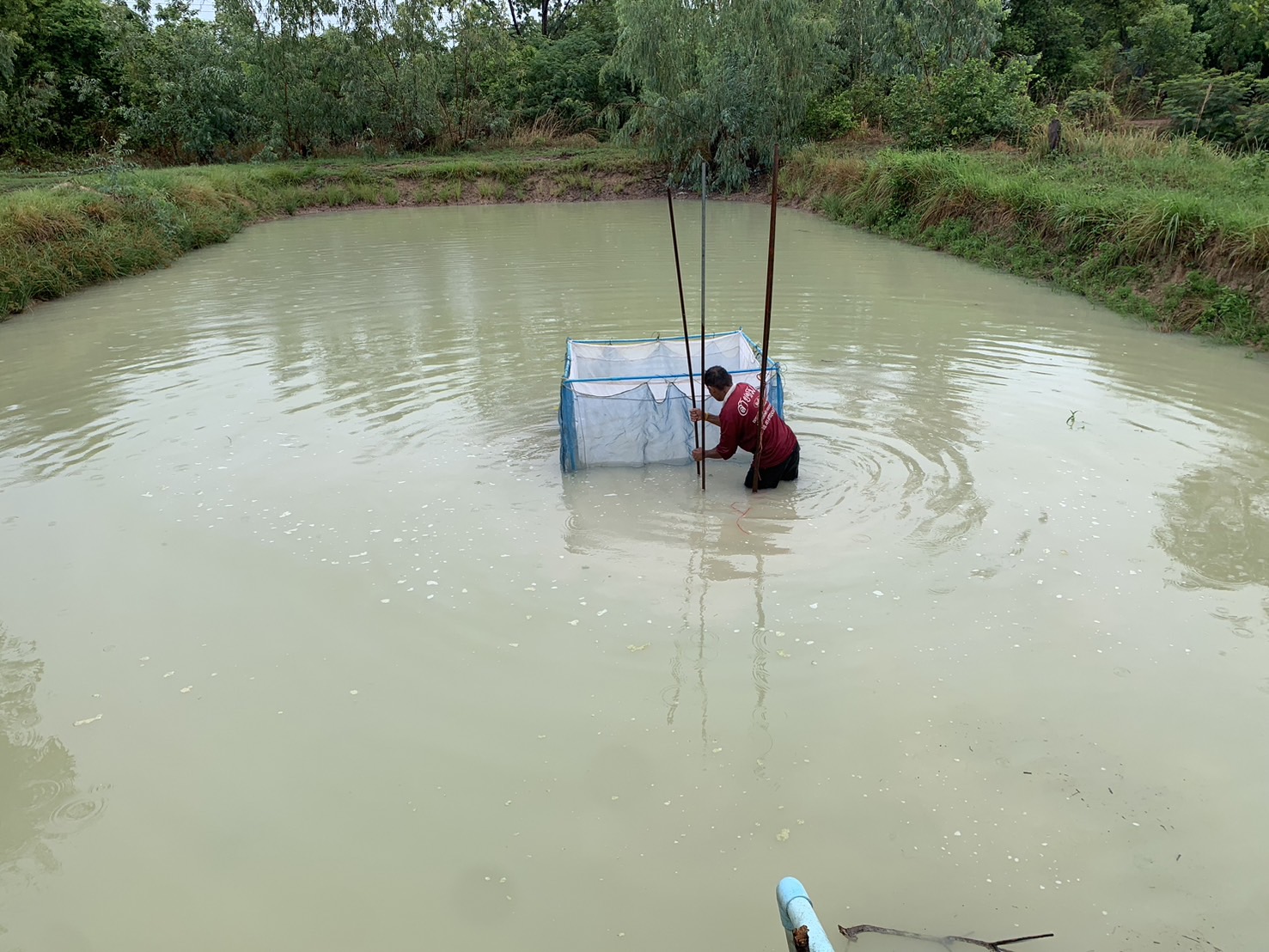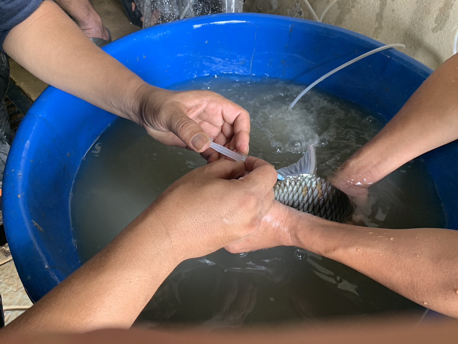 3. ดำเนินการเพาะพันธุ์ปลาตะเพียนขาวด้วยชุดเพาะพันธุ์ปลาเคลื่อนที่แบบกระชังผ้าโอล่อนแก้วในบ่อดิน(บ่ออนุบาล) รุ่นที่ 2 โดยใช้พ่อพันธุ์ปลา 24 ตัว แม่พันธุ์ปลา 12 ตัว อัตรา 2:1 กระตุ้นการตกไข่แม่ปลาด้วยฮอร์โมนสังเคราะห์อัตรา 15 ไมโครกรัมต่อแม่ปลา 1 กิโลกรัม ร่วมกับยาเสริมฤทธิ์ 5 มิลลิกรัมต่อแม่ปลา 1 กิโลกรัม