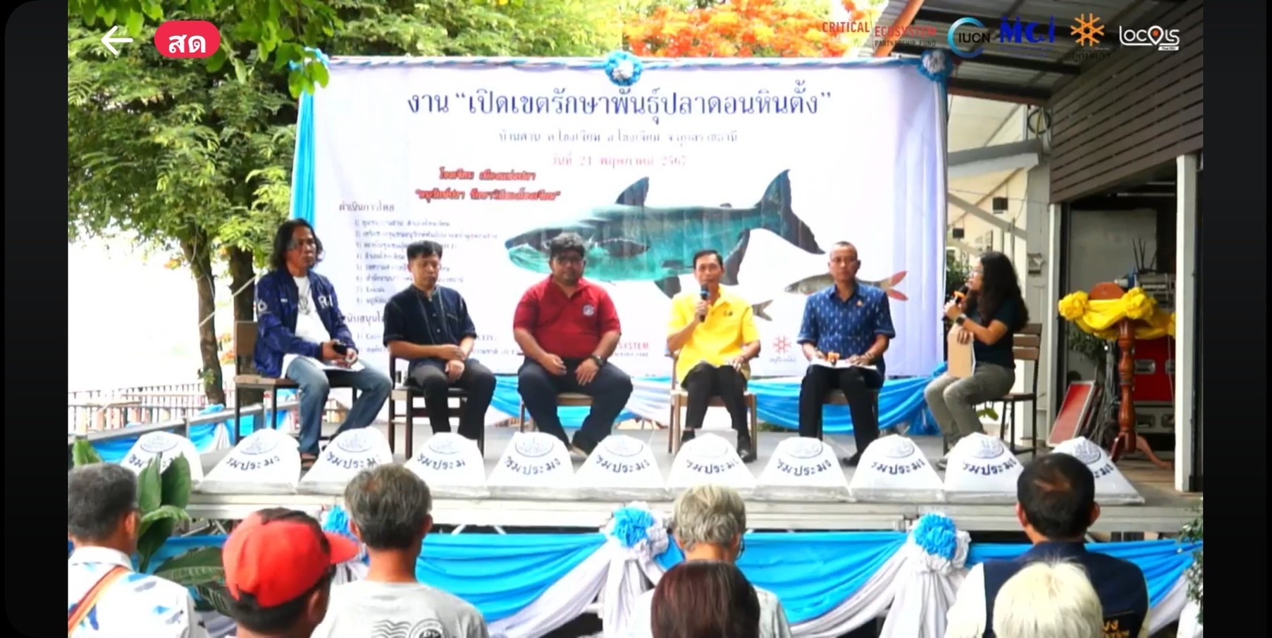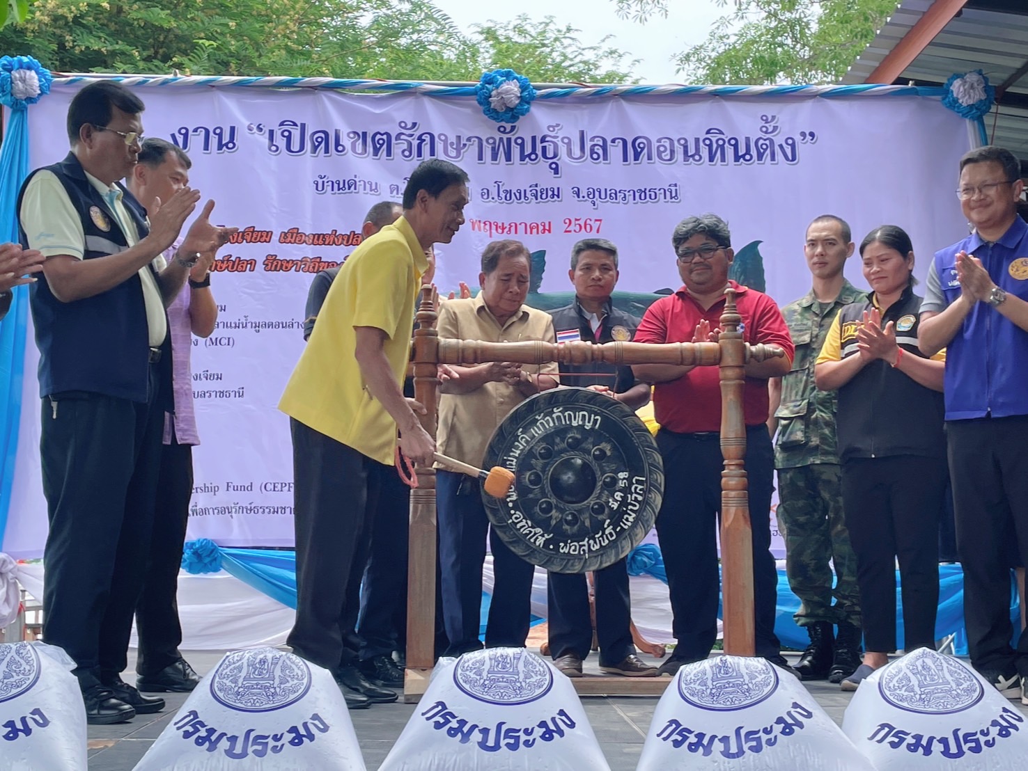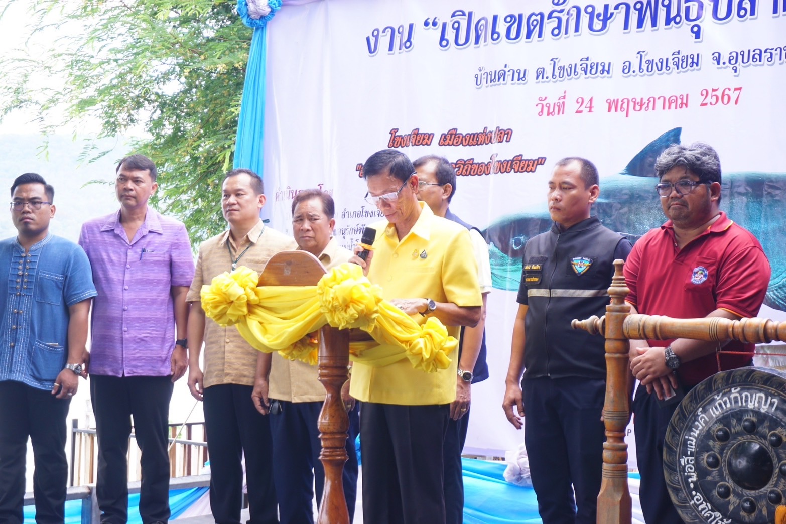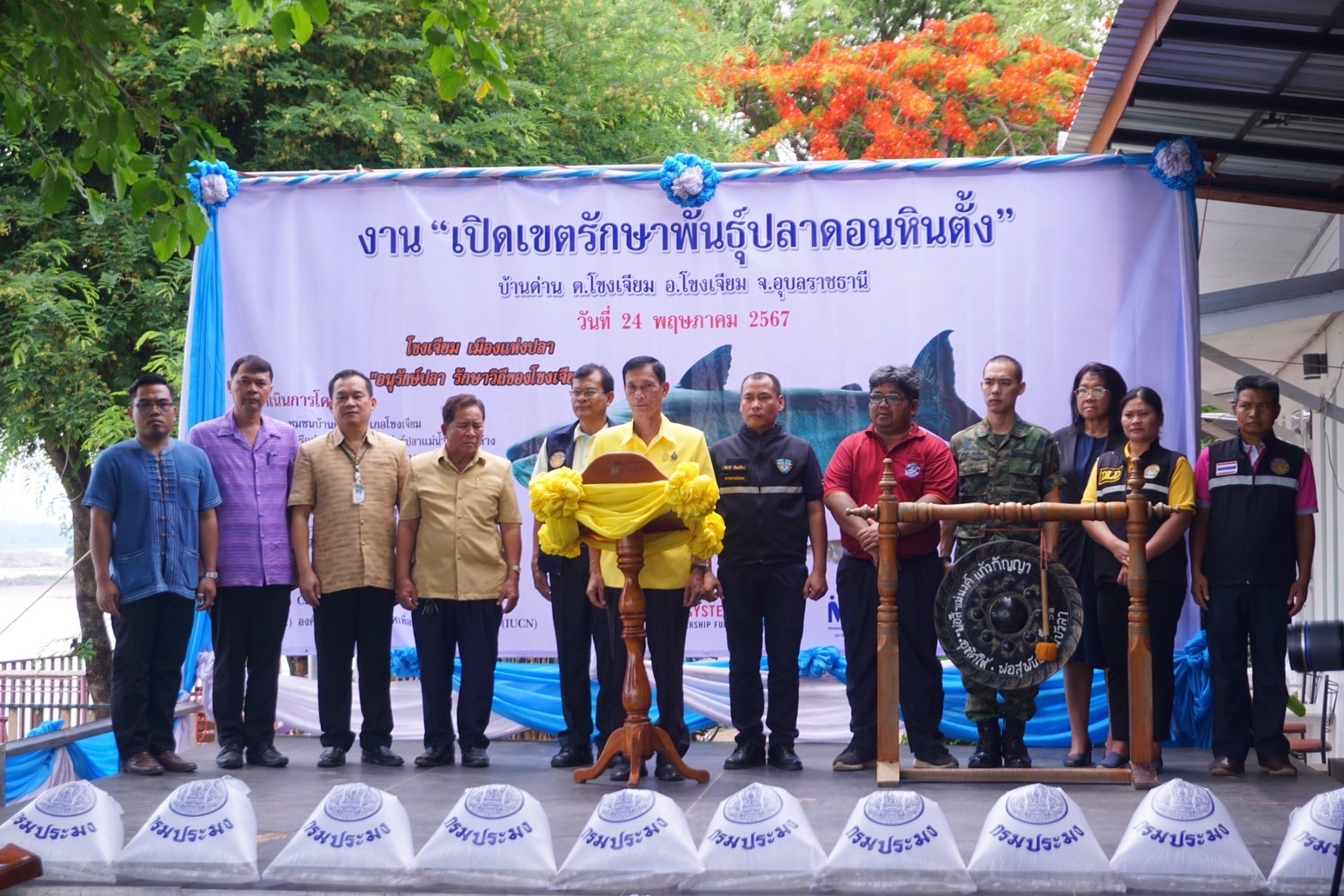 นายสุริยันต์ วรรณวงษ์ ประมงจังหวัดอุบลราชธานี เป็นประธาน "พิธีเปิดป้ายเขตพื้นที่รักษาพันธุ์สัตว์น้ำดอนหินตั้ง และกิจกรรมปล่อยพันธุ์สัตว์น้ำ เพื่ออนุรักษ์พันธุ์สัตว์น้ำ และเพิ่มผลผลิตในแหล่งน้ำ พร้อมทั้งร่วมเสวนา ความสำคัญของปลาในเเม่น้ำโขงและเเม่น้ำมูลตอนล่าง ต่อระบบนิเวศ เศรษฐกิจ วัฒนธรรมเมืองโขงเจียม ตลอดจนแนวทางการอนุรักษ์พันธุ์สัตว์น้ำในแม่น้ำโขง