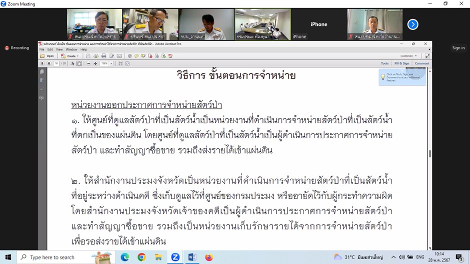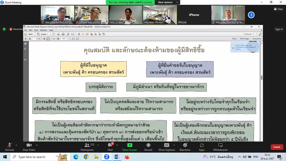 วันอังคารที่ 28 พฤษภาคม 2567 เวลา 09.30 - 12.00 น. ณ ห้องประชุมทูน่า ชั้น 6 อาคารจุฬาภรณ์ กรมประมง ผ่านโปรแกรม Zoom Cloud Meetings นายสุริยันต์ วรรณวงษ์ ประมงจังหวัดอุบลราชธานี พร้อมเจ้าหน้าที่ เข้าร่วมประชุมชี้แจงหลักเกณฑ์ เงื่อนไข ขั้นตอนการจำหน่ายและการชำระค่าใช้จ่ายการจำหน่ายสัตว์ป่าที่เป็นสัตว์น้ำ โดยมีเนื้อหาเกี่ยวกับ