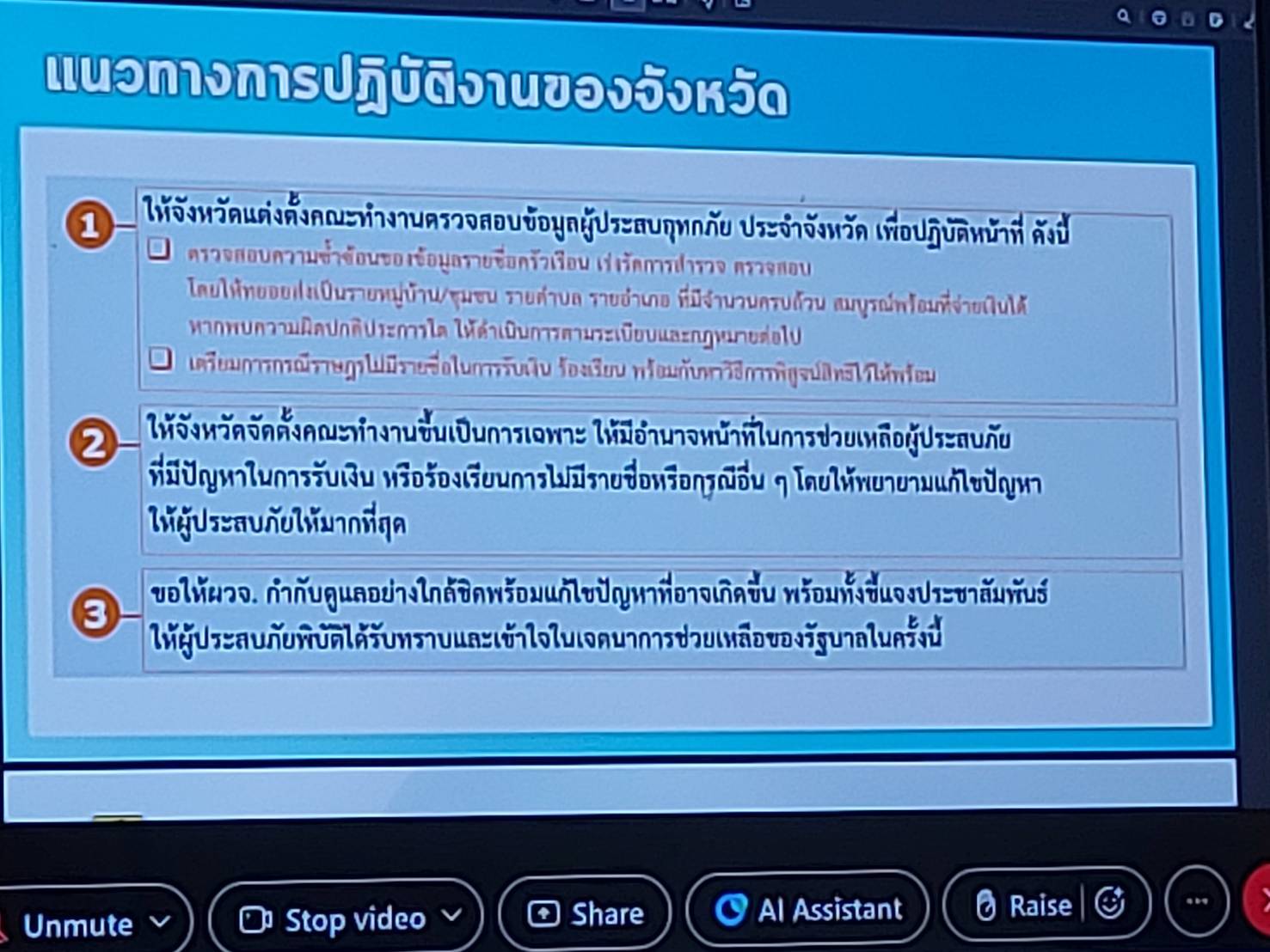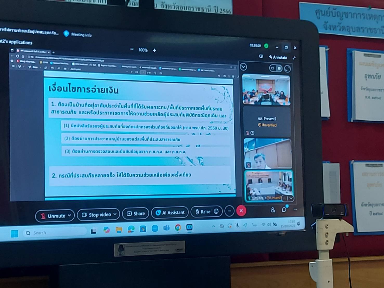 วันที่ 15 ตุลาคม 2568 เวลา 10.00 น. ประมงจังหวัดอุบลราชธานี มอบหมายให้นายสุนทร รุ่งเรือง หัวหน้ากลุ่มบริหารจัดการด้านการประมง ร่วมประชุมเพื่อรับฟังการชี้แจงแนวทางการให้ความช่วยเหลือผู้ประสบอุทกภัยในช่วงฤดูฝน ปี 2568 (ระหว่างวันที่ 15 พฤษภาคม ถึง วันที่ 6 คุลาคม 2568)  ณ ห้องบัญชาการป้องกันและบรรเทาสาธารณภัยแห่งชาติ อาคาร 3 ชั้น 5 ปภ. โดยมีนายชัยรัตน์ แก้วเพียงเพ็ญ รองอธิบดีกรมป้องกันและบรรเทาสาธารณภัย เป็นประธาน ผ่านระบบ Webex มายังห้องประชุมสำนักงานป้องกันและบรรเทาสาธารณภัยจังหวัดอุบลราชธานี ชั้น 2 ศาลากลางจังหวัดอุบลราชธานี โดยใช้เงินงบกลางตามมติคณะรัฐมนตรี ครัวเรือนละ 9,000 บาท ใน 2 กรณี ประกอบด้วย