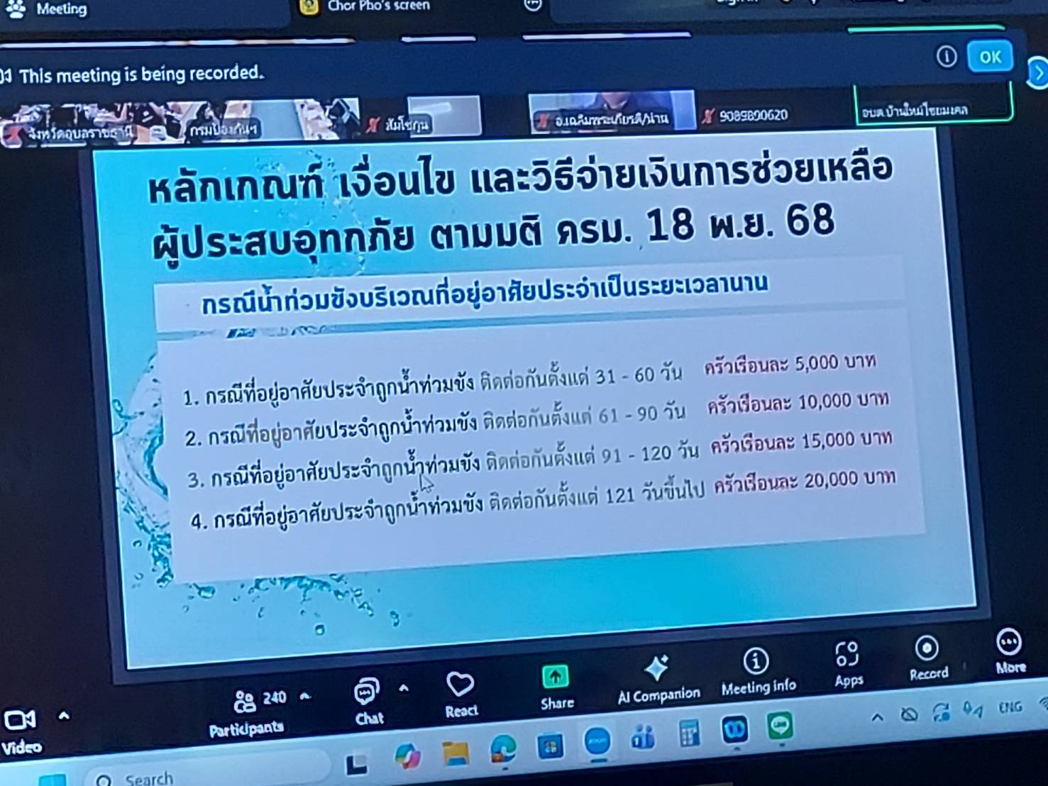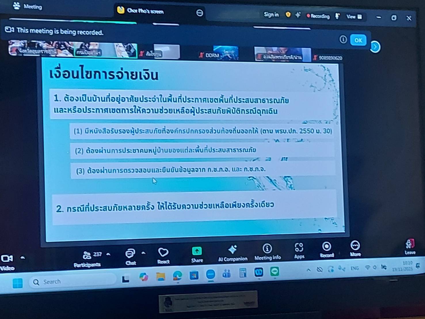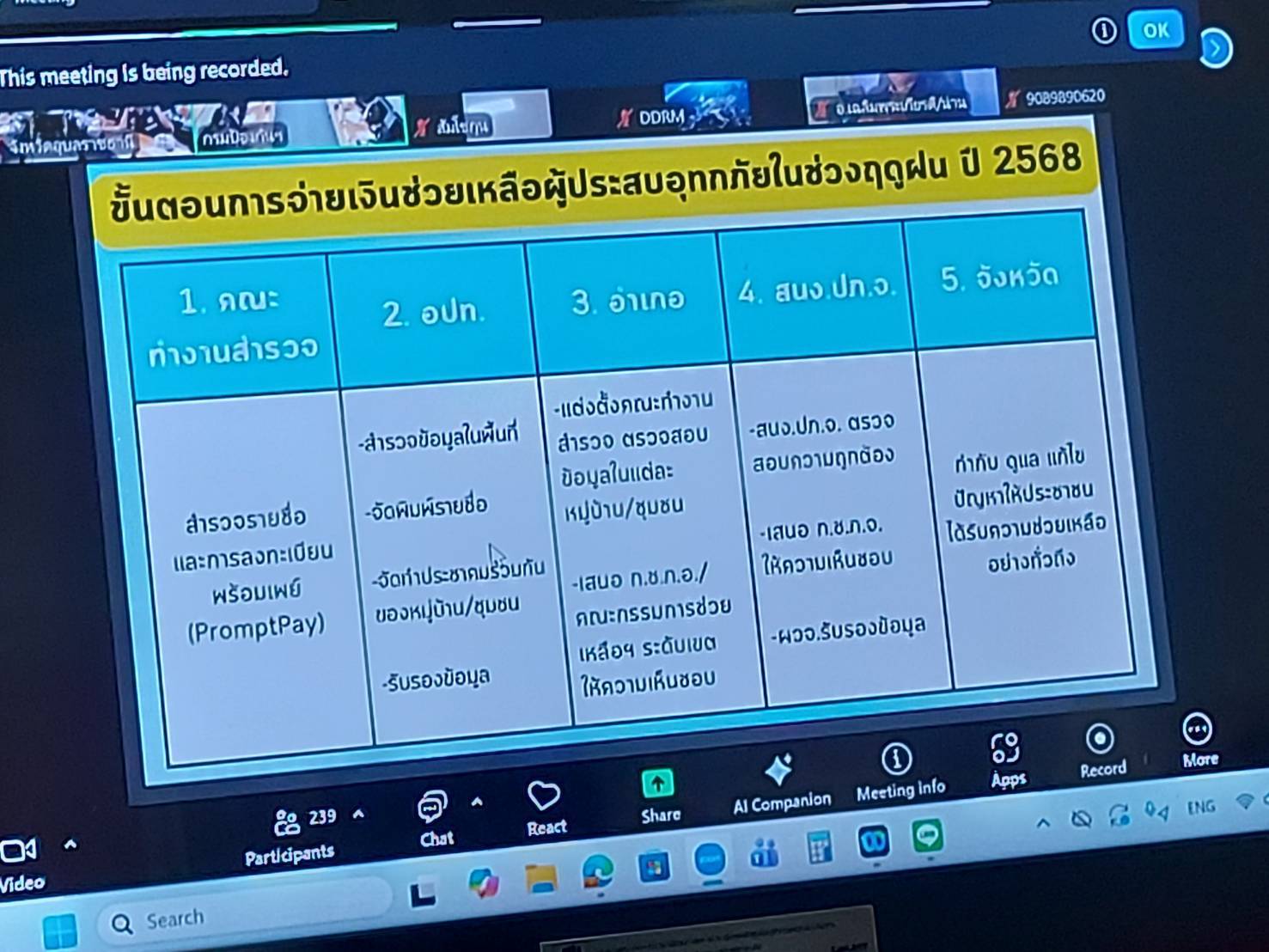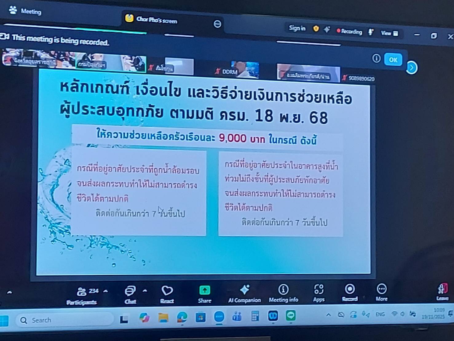 วันพุธที่ 19 พฤศจิกายน 2568 เวลา 10.00 น. ประมงจังหวัดอุบลราชธานี มอบหมายให้นายสุนทร รุ่งเรือง หัวหน้ากลุ่มบริหารจัดการด้านการประมง ร่วมประชุมแนวทางการให้ความช่วยเหลือผู้ประสบอุทกภัย ตามมติคณะรัฐมนตรี เมื่อวันที่ 18 พฤศจิกายน 2568 ผ่านระบบ Zoom Cloud Meeting ณ ห้องประชุม 3 อาคาร 3 ชั้น 3 กรมป้องกันและบรรเทาสาธารณภัย กรุงเทพฯ โดยมีนายธีรพัฒน์ คัชมาตย์ อธิบดีกรมป้องกันและบรรเทาสาธารภัย เป็นประธาน โดยมีรายละเอียด (เพิ่มเติม) ประกอบด้วย