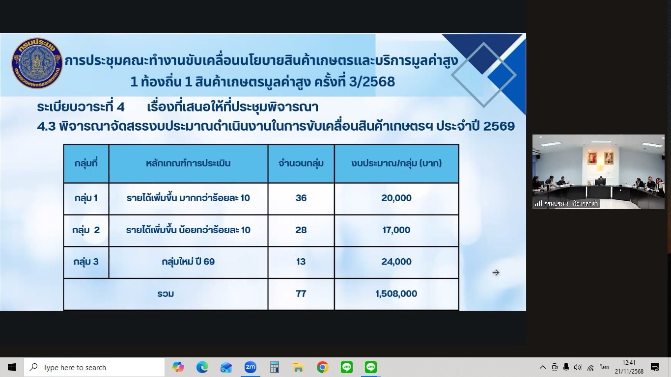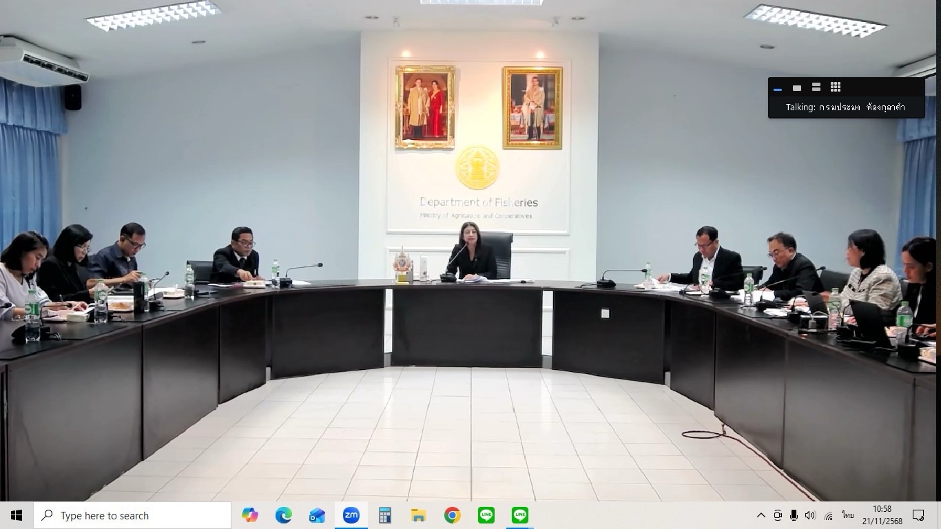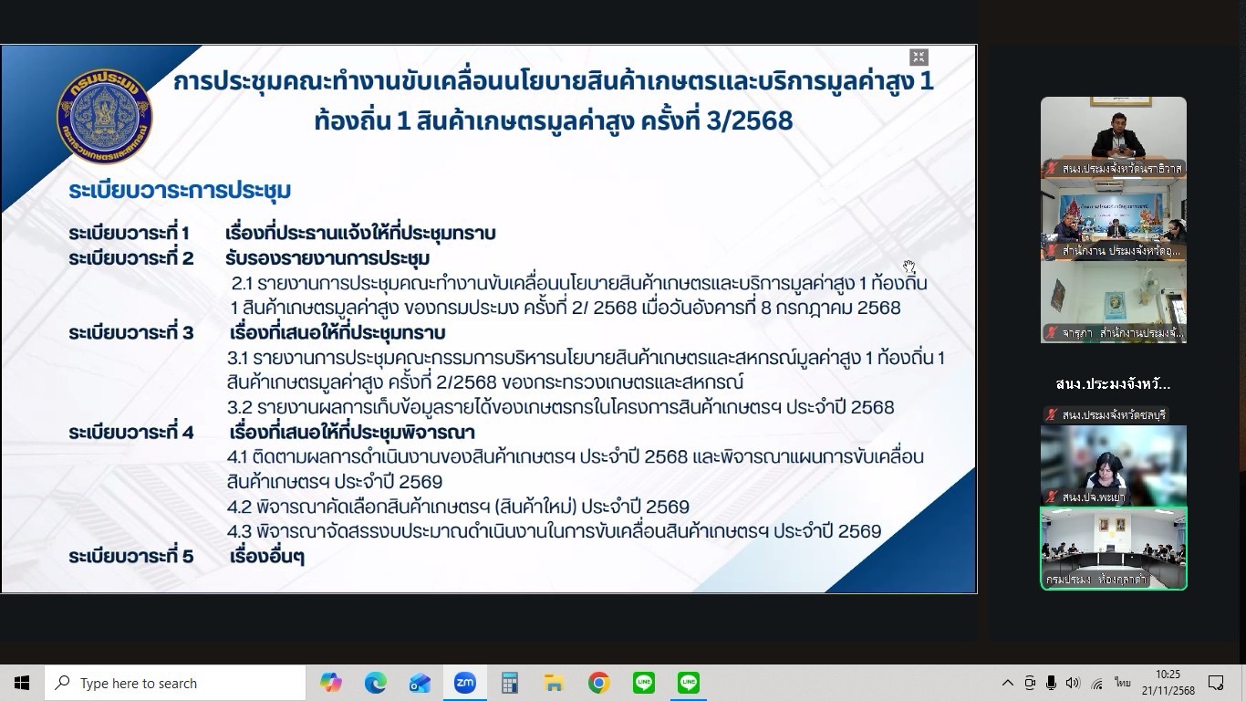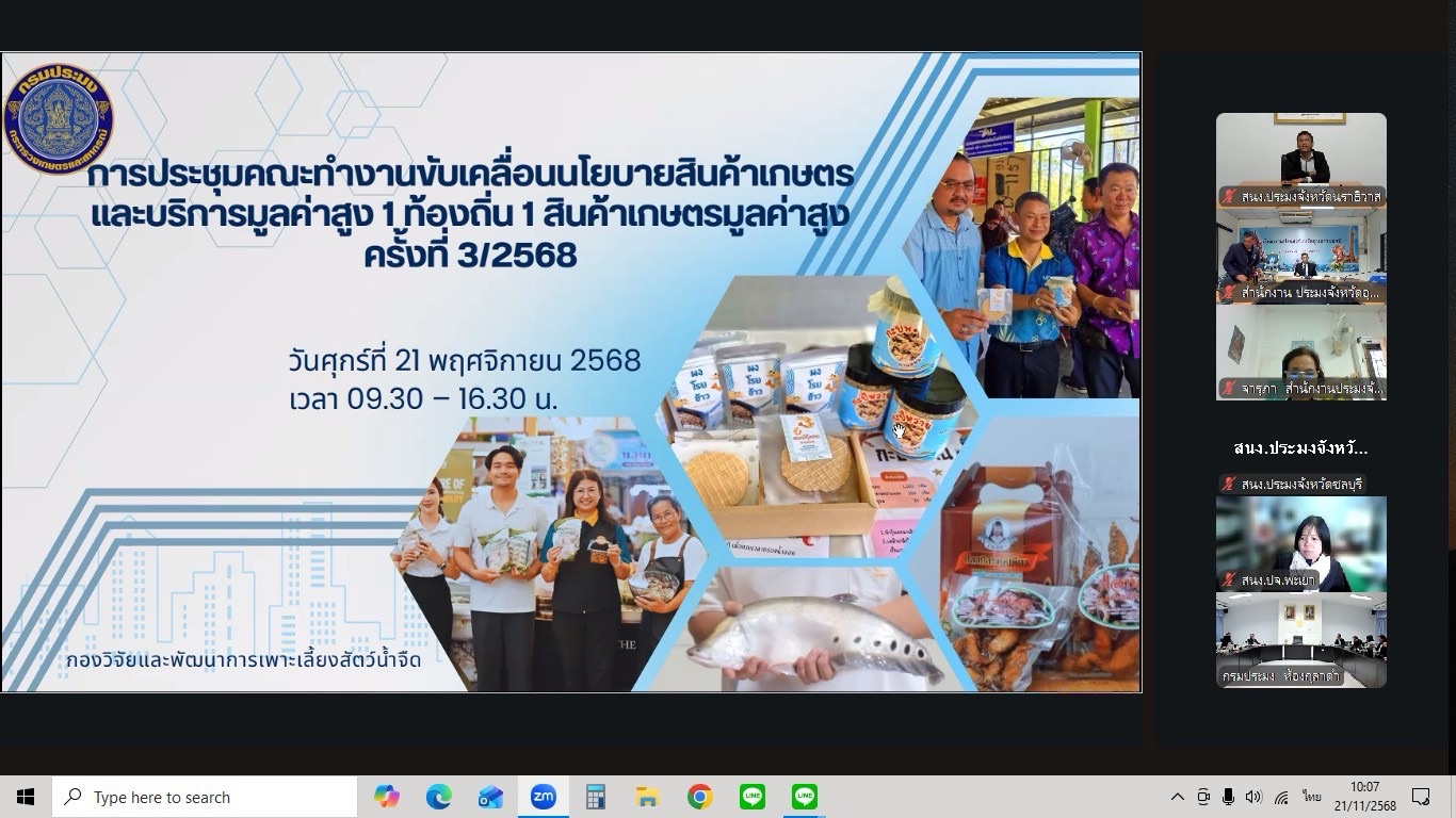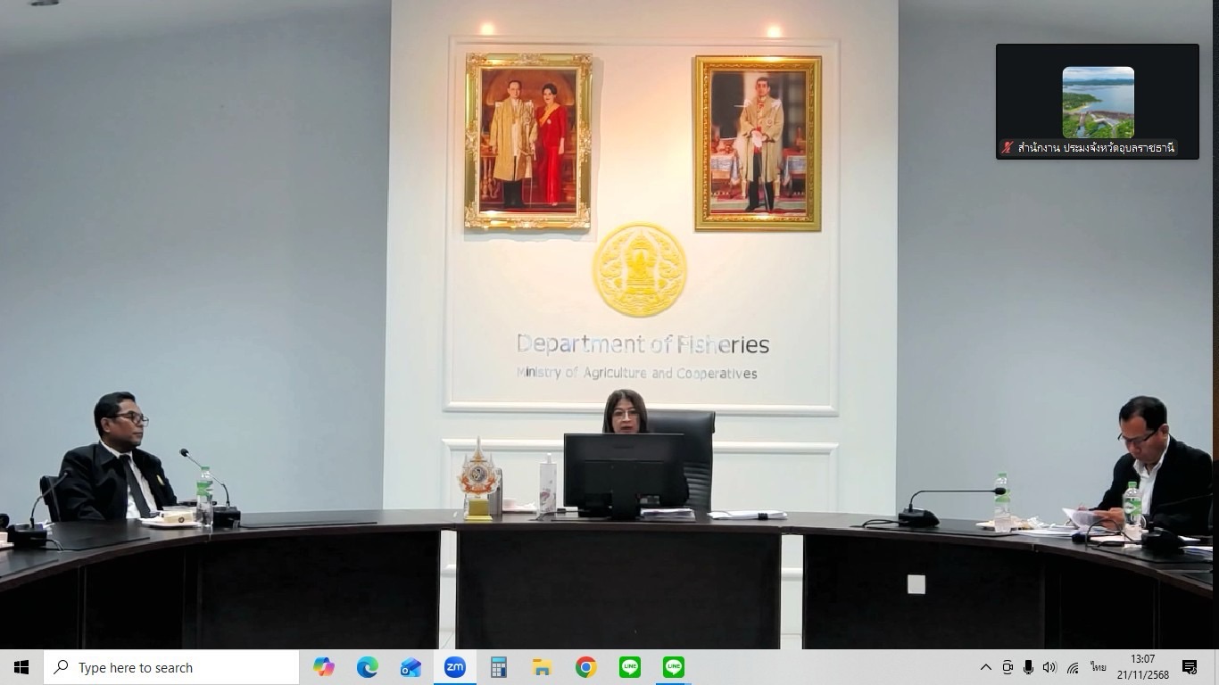 วันที่ 21 พฤศจิกายน 2568 เวลา 10.00 น. นายสุริยันต์ วรรณวงษ์ ประมงจังหวัดอุบลราชธานี พร้อมด้วยนางสาวบรรจง สิมสา ตำแหน่ง เจ้าพนักงานประมงปฏิบัติงาน ว่าที่ ร.ต.วุฒิชาติ  เชื้อชม ตำแหน่ง เจ้าพนักงานประมง และนางสาวเสาวภรณ์  ภูมิคำ ตำแหน่ง เจ้าพนักงานประมง เข้าร่วมประชุมคณะทำงานขับเคลื่อนนโยบายสินค้าเกษตรมูลค่าสูง 1 ท้องถิ่น 1 สินค้าเกษตรมูลค่าสูง ครั้งที่ 3/2568 เพื่อติดตามผลการดำเนินงานในการขับเคลื่อนนโยบายสินค้าเกษตรมูลค่าสูง 1 ท้องถิ่น 1 สินค้าเกษตรมูลค่าสูง ประจำปีงบประมาณ 2568 และพิจารณาคัดเลือกสินค้าเกษตรและบริการมูลค่าสูง 1 ท้องถิ่น 1 สินค้าเกษตรมูลค่าสูง ประจำปีงบประมาณ 2569 เป็นรายสินค้า ผ่านระบบการประชุมทางไกล Zoom meeting ณ สำนักงานประมงจังหวัดอุบลราชธานี โดยมีนางฐิติพร หลาวประเสริฐ อธิบดีกรมประมง เป็นประธานในที่ประชุม