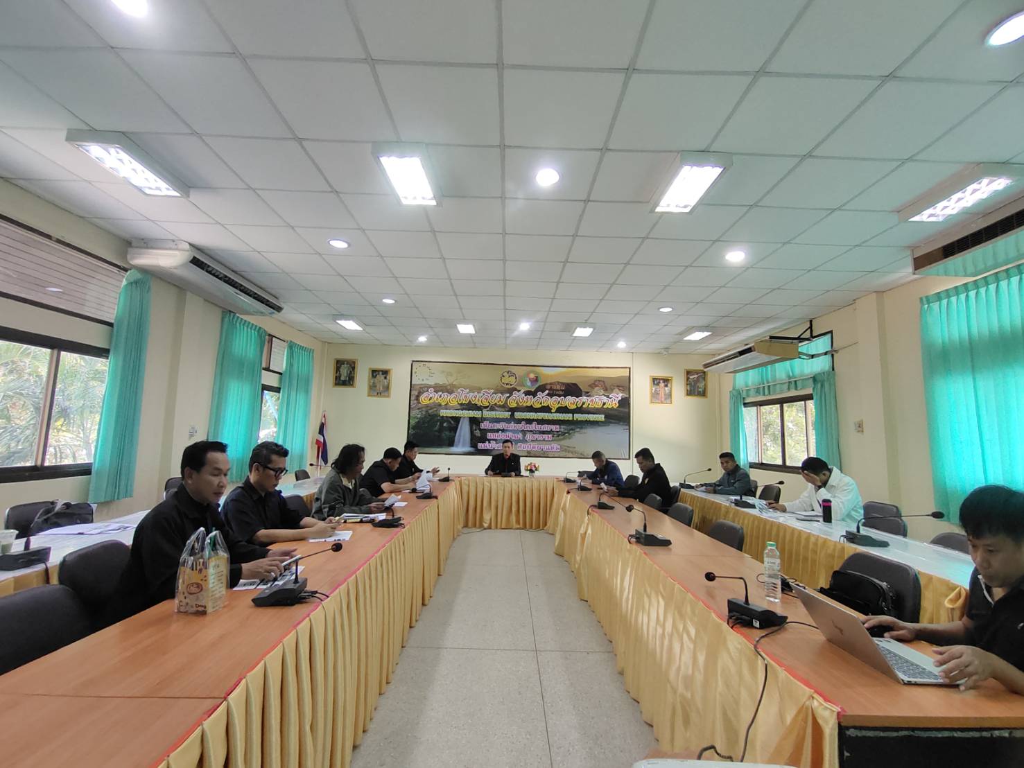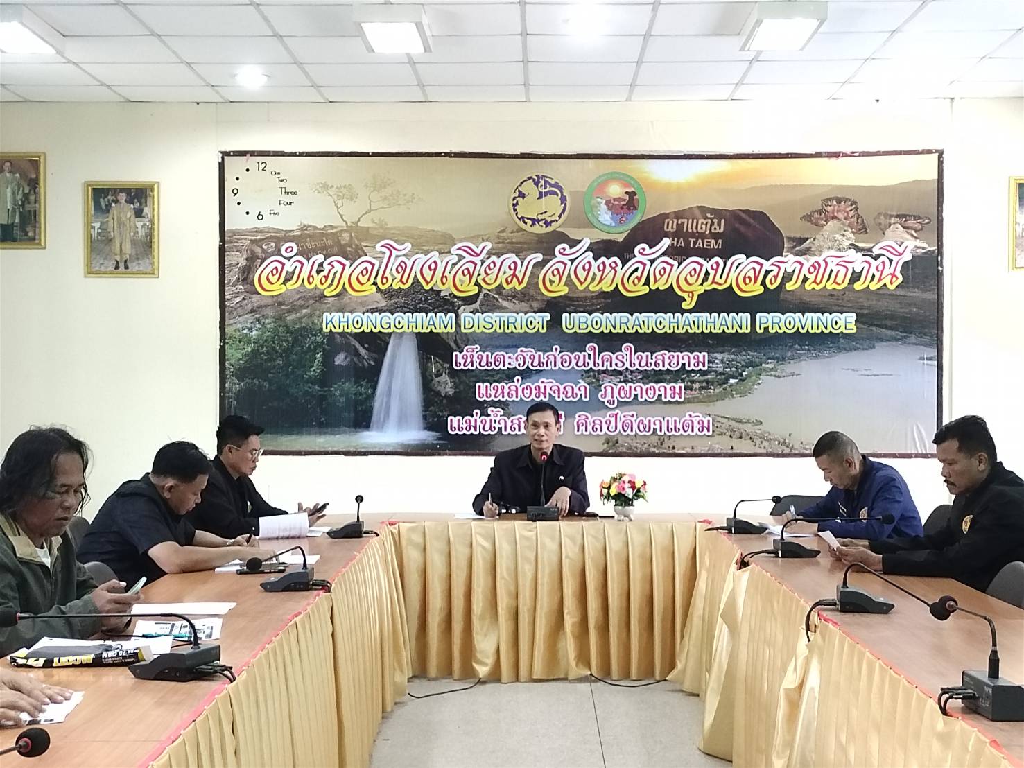 การประชุมมีนายสุริยันต์ วรรณวงษ์ ประมงจังหวัดอุบลราชธานี เป็นประธาน มีผู้แทนหน่วยงานราชการและองค์กรท้องถิ่นร่วมด้วย ได้แก่ นายเลิศชาย หอมหวล ปลัดอำเภอหัวหน้าฝ่ายความมั่นคง นายก้องสกล แก้วกัญญา นายกเทศมนตรีบ้านด่านโขงเจียม นายมัสด้า กอมณี ผู้ใหญ่บ้านบ้านด่าน ตำบลโขงเจียม หัวหน้าส่วนราชการ และคณะทำงาน