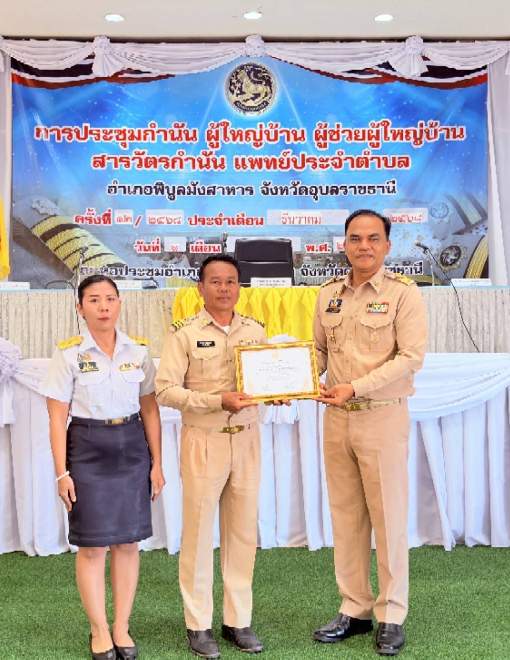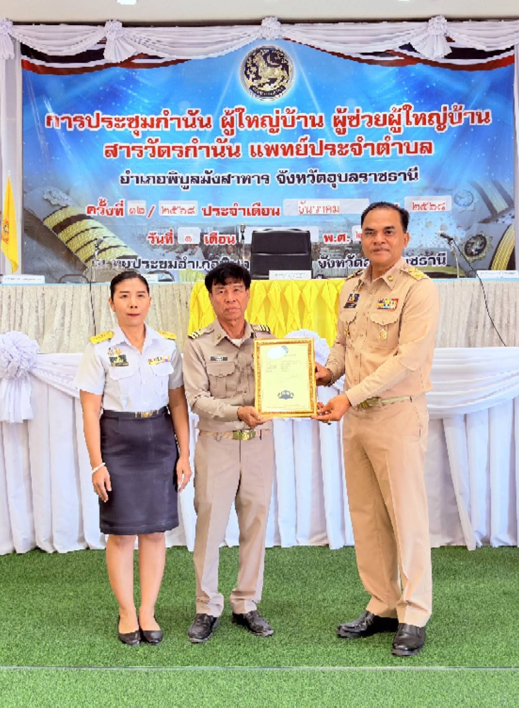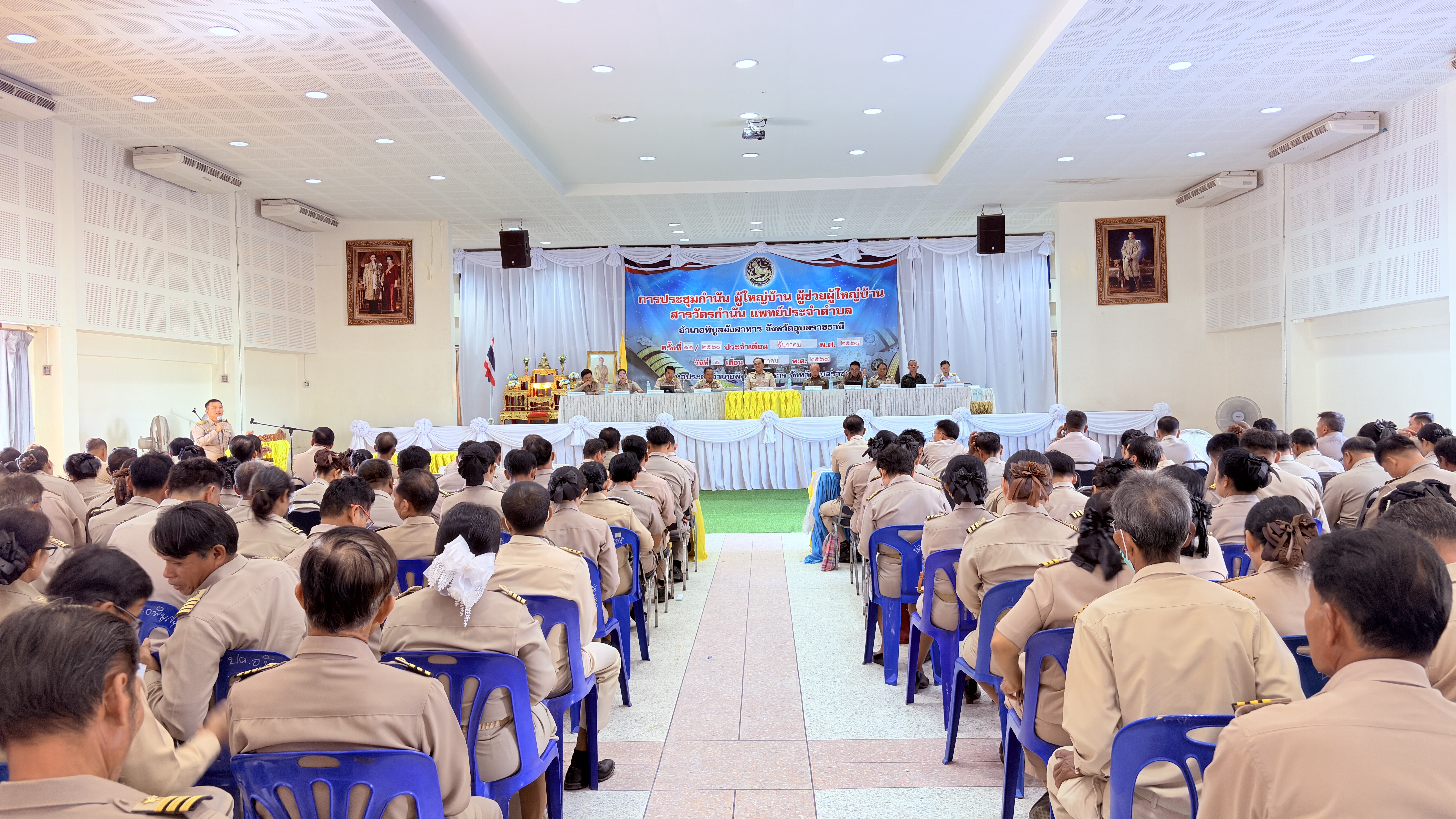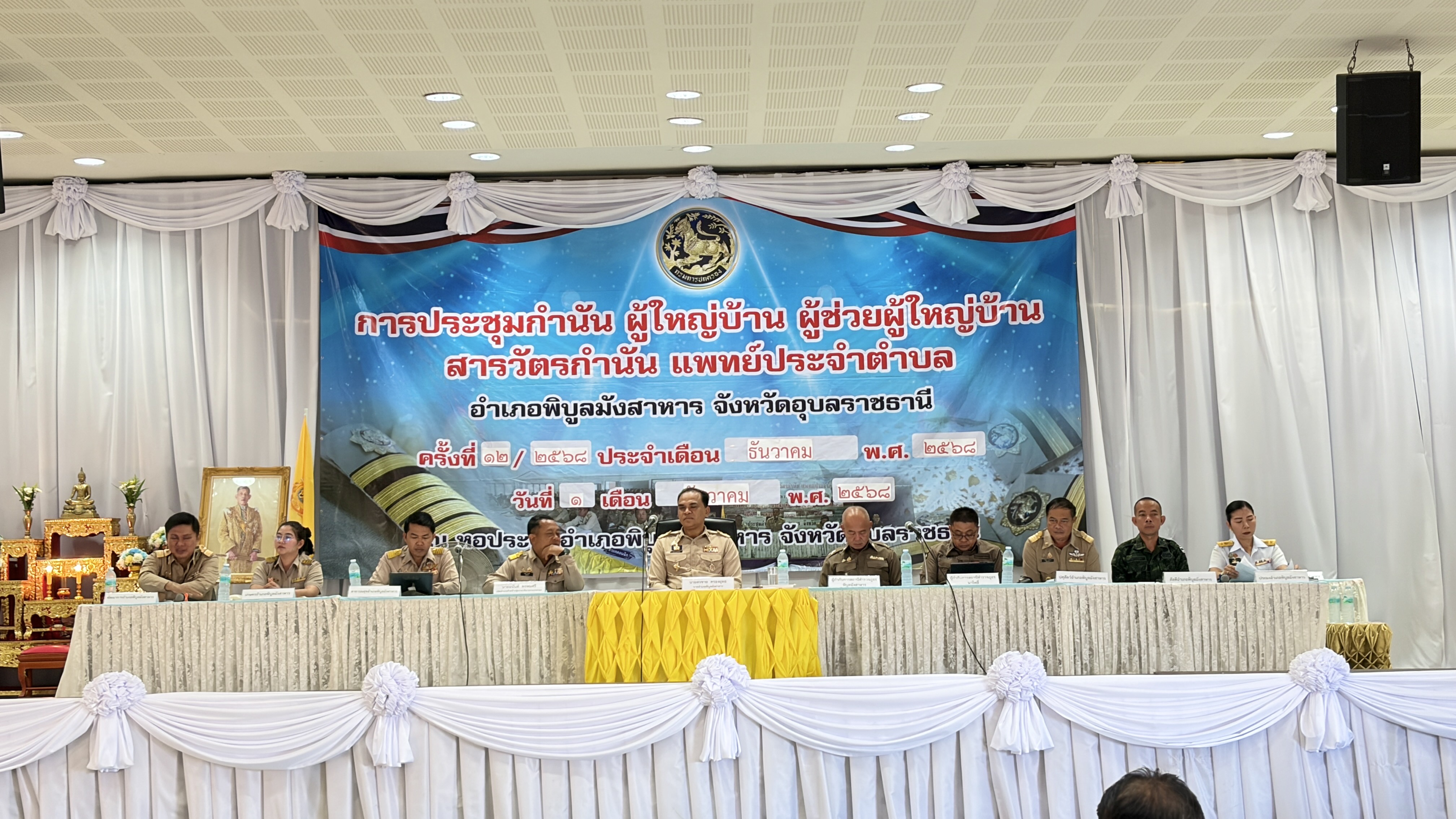 เวลา 09.00 น. ร่วมประชุม กำนัน ผู้ใหญ่บ้าน แพทย์ประจำตำบล สารวัตรกำนัน และผู้ช่วยผู้ใหญ่บ้าน ณ  หอประชุมอำเภอพิบูลมังสาหาร โดยมีนายสรชาย ครองยุทธ นายอำเภอพิบูลมังสาหาร เป็นประธาน