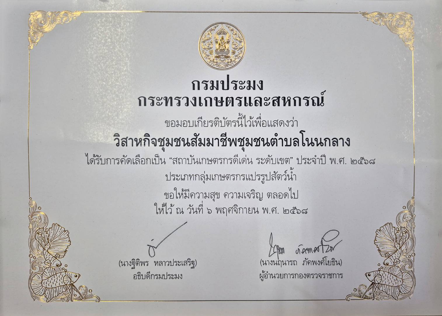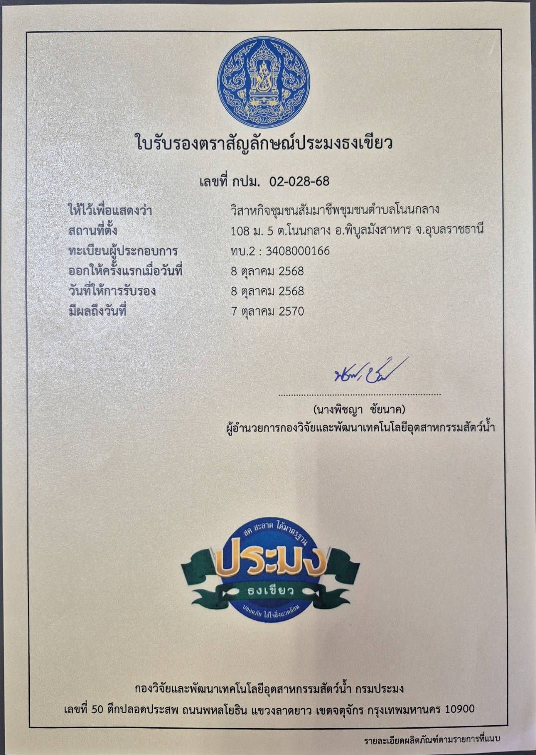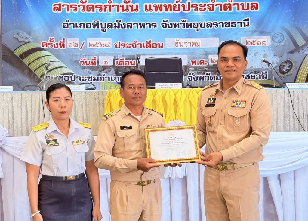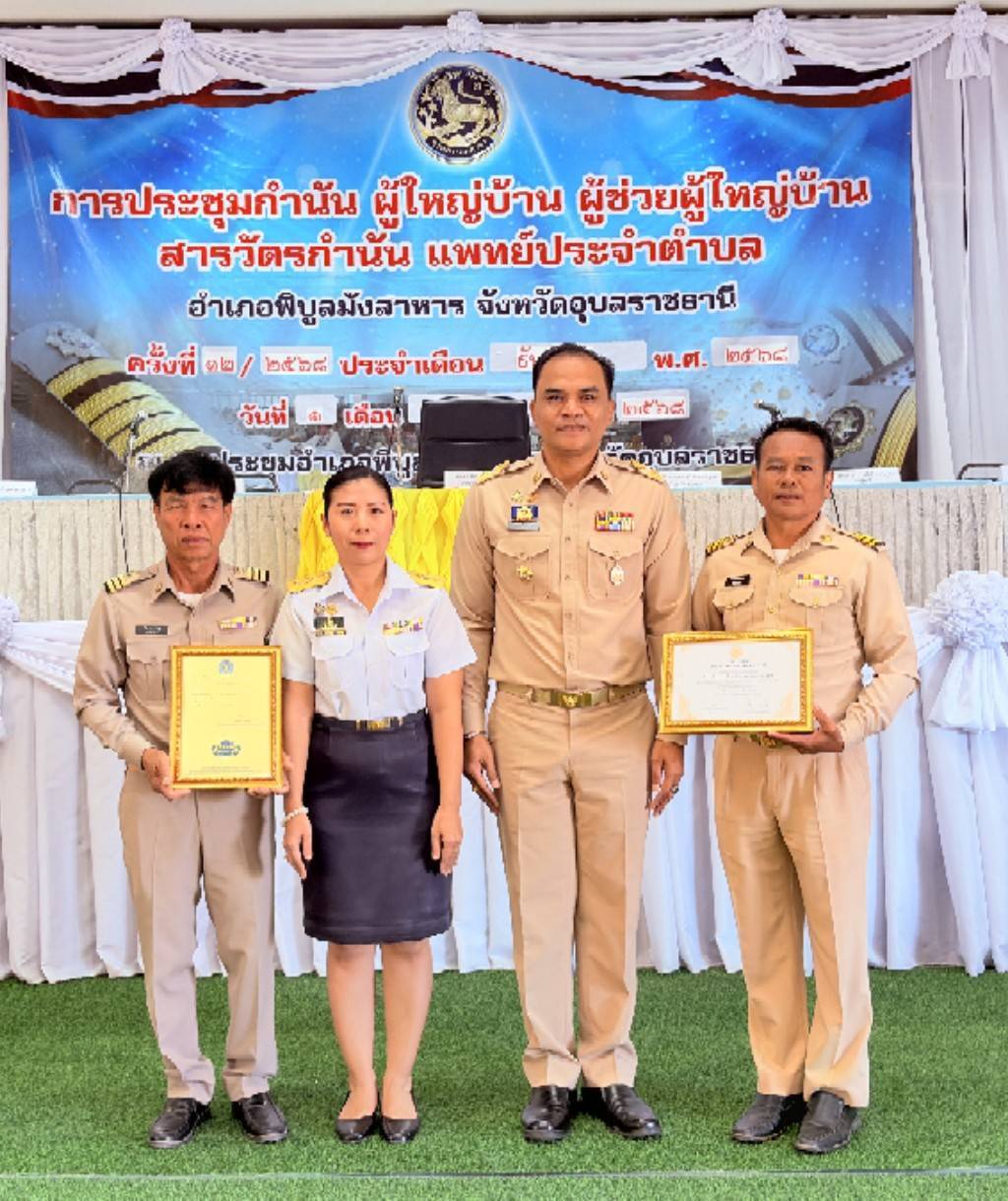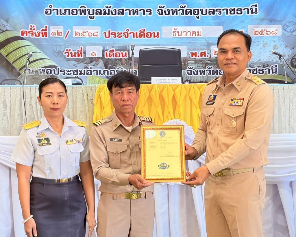 ซึ่งในวันนี้ ประมงอำเภอพิบูลมังสาร ได้นำนายอำนาจ ดาดสันเทียะ ประธาน และสมาชิกองค์กรชุมชนประมงท้องถิ่นวิสาหกิชุมชนสัมมาชีพชุมชนตำบลโนนกลาง หมู่ที่ 5 ตำบลโนนกลาง อำเภอพิบูลมังสาหาร จังหวัดอุบลราชธานี เข้ารับมอบเกียรติบัตร “สถาบันเกษตรกรดีเด่น ระดับเขต” ประจำปี พ.ศ. 2568 ประเภทกลุ่มเกษตรกรแปรรูปสัตว์น้ำ และรับมอบ “ใบรับรองตราสัญลักษณ์ประมงธงเขียว” จากนายอำเภอพิบูลมังสาหาร