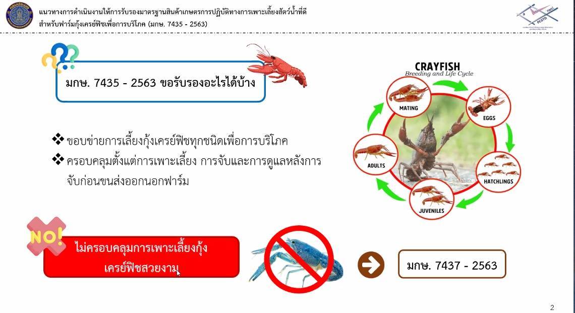 โดยมีวัตถุประสงค์เพื่อให้เจ้าหน้าที่กรมประมงผู้ปฏิบัติงานส่งเสริมการเพาะเลี้ยงสัตว์น้ำ มีความรู้ความเข้าใจในหลักการปฏิบัติทางการเพาะเลี้ยงสัตว์น้ำที่ดีตามมาตรฐานสินค้าเกษตร มกษ. 7435-2563 สำหรับฟาร์มกุ้งเครย์ฟิชเพื่อบริโภค  ให้สามารถถ่ายทอดความรู้และส่งเสริมเกษตรกรให้ปฏิบัติตามที่มาตรฐานกำหนดได้อย่างมีประสิทธิภาพและบรรลุเป้าหมายด้านมาตรฐานการผลิตสัตว์น้ำที่มีคุณภาพต่อไป