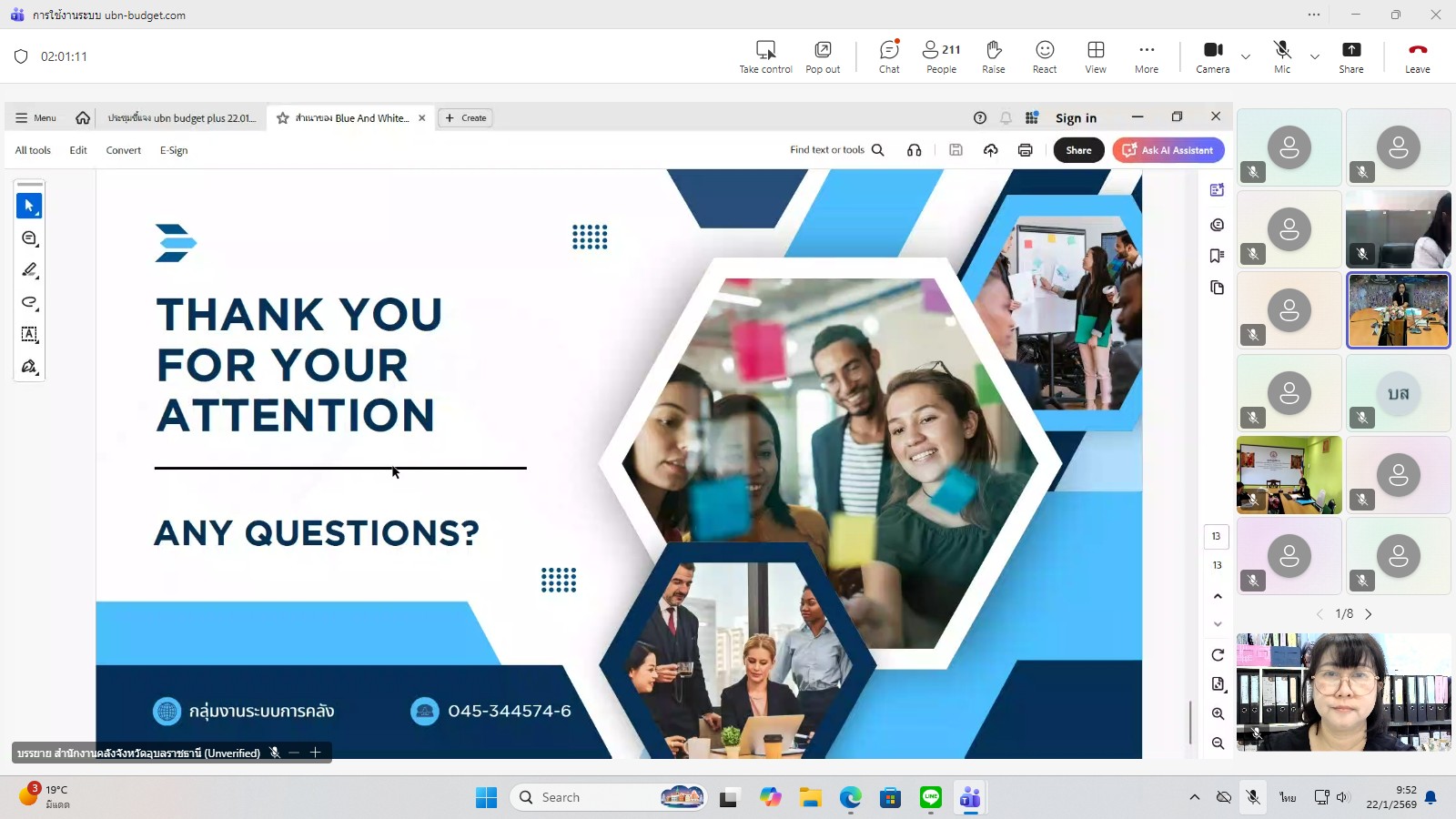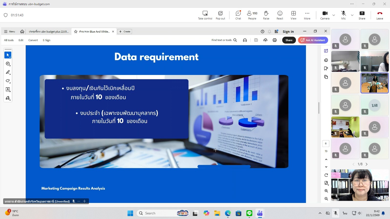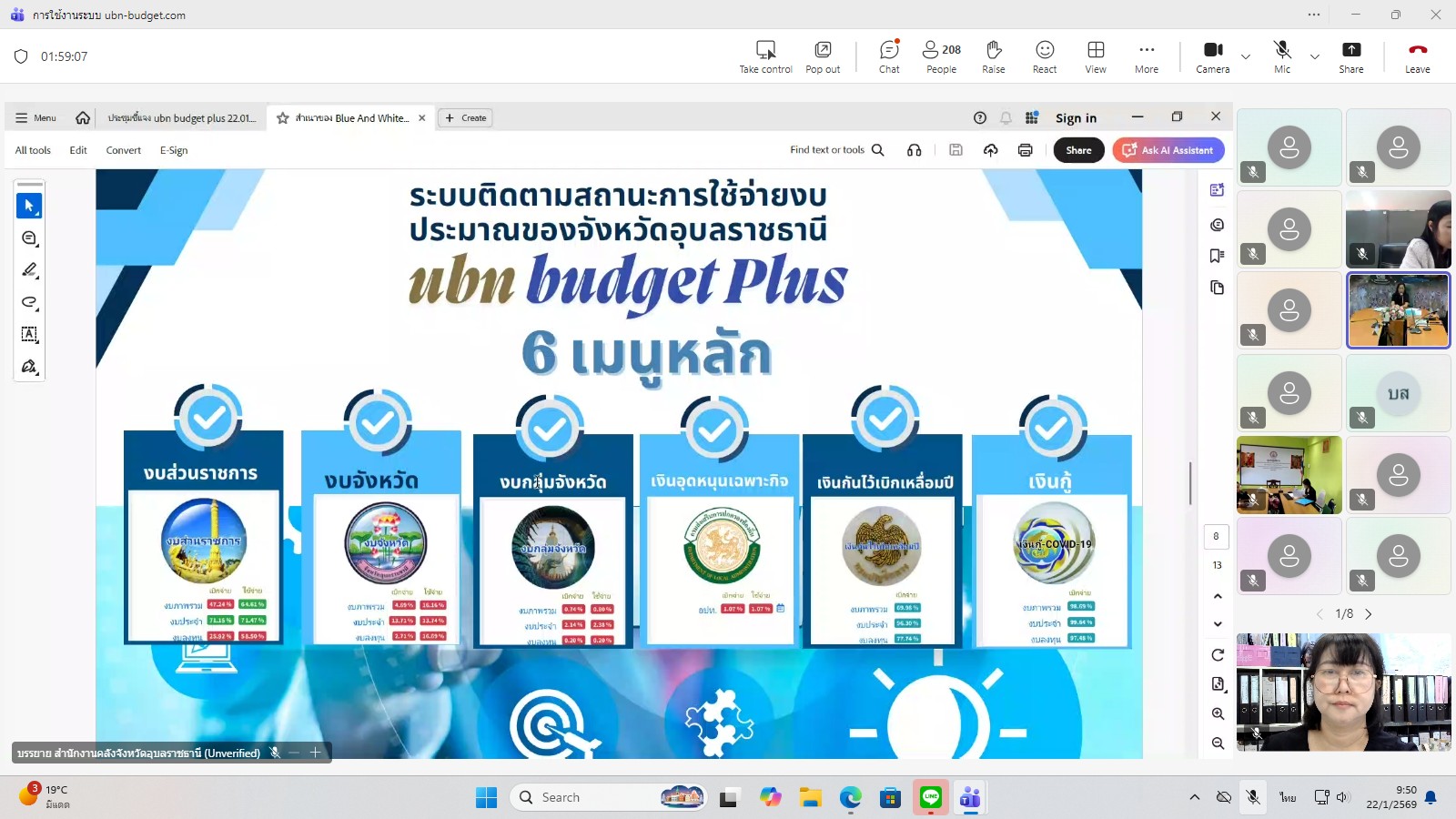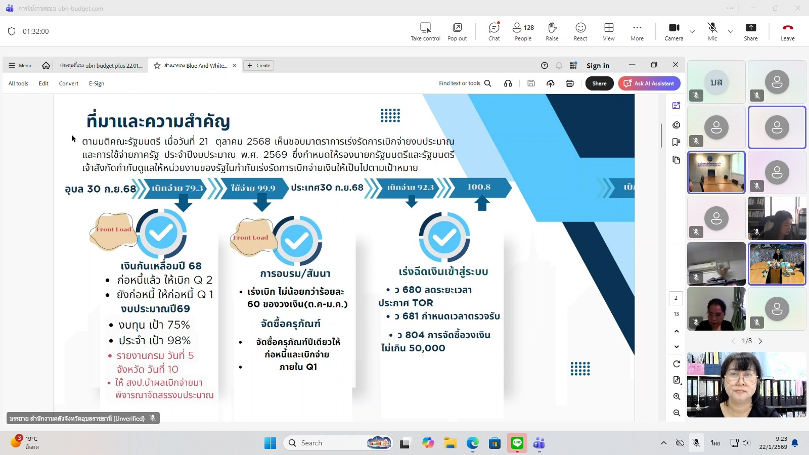 วันพฤหัสบดีที่ 22 มกราคม พ.ศ. 2569  เวลา 09.30 – 12.00 น. นายสุริยันต์ วรรณวงษ์ ประมงจังหวัดอุบลราชธานี มอบหมายให้ นางสาวจิณภัค ประจันต์ เจ้าพนักงานการเงินและบัญชีชำนาญงาน พร้อมด้วย นายกนกพล ดุมแก้ว นักวิชาการประมง ร่วมอบรมการใช้งานระบบติดตามการใช้จ่ายงบประมาณจังหวัด ubn-budget โดยสำนักงานคลังจังหวัดอุบลราชธานี กลุ่มงานระบบการคลัง ณ สำนักงานประมงจังหวัดอุบลราชธานี ผ่านระบบสื่อสารออนไลน์ Microsoft Teams โดยมี นางสาวเฉลิมรัตน์ เรืองวราคม คลังจังหวัดอุบลราชธานี เป็นประธาน