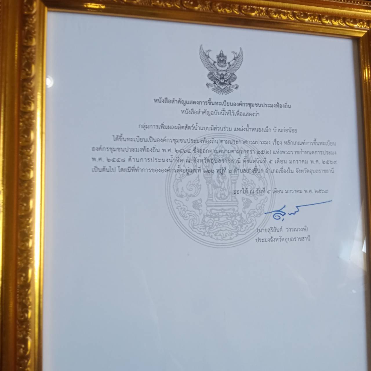 - เวลา 09.00 น. ร่วมประชุมกำนัน ผู้ใหญ่บ้าน ครั้งที่ 2/2569 ประจำเดือนมกราคม 2569 ณ หอประชุมอำเภอเขื่องใน จังหวัดอุบลราชธานี จัดพิธีมอบหนังสือสำคัญการจัดตั้งองค์การชุมชนประมงท้องถิ่นกลุ่มเพิ่มผลผลิตสัตว์น้ำแหล่งน้ำหนองเม็ก บ้านก่อน้อย ตำบลยางขี้นก