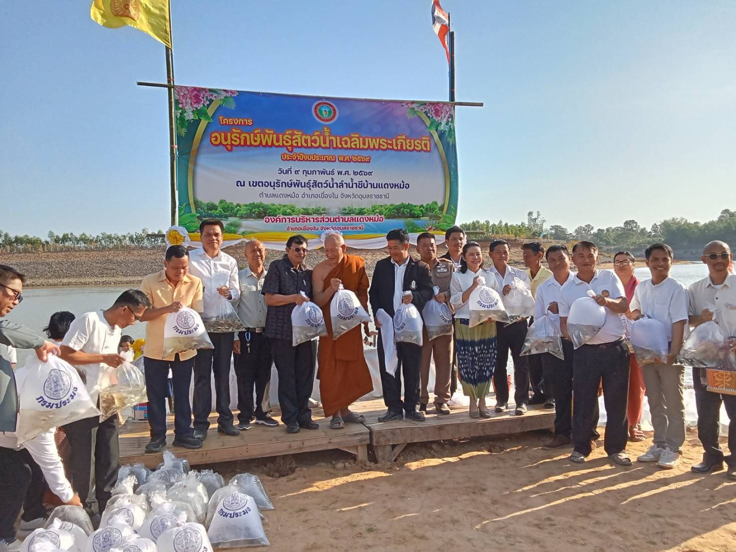 วันที่ 9 กุมภาพันธ์ 2569 เวลา 07.30 น. นายสุริยันต์ วรรณวงษ์ มอบหมายให้ นายสุนทร รุ่งเรือง หัวหน้ากลุ่มบริหารจัดการด้านการประมง สำนักงานประมงจังหวัดอุบลราชธานี พร้อมด้วยนายวิทยา โกษาผล ประมงอำเภอเขื่องใน ร่วมพิธีปล่อยพันธุ์สัตว์น้ำเฉลิมพระเกียรติ ณ บริเวณเขตพื้นที่รักษาพันธุ์สัตว์น้ำแม่น้ำชีบ้านแดงหม้อ ตำบลแดงหม้อ อำเภอเขื่องใน จังหวัดอุบลราชธานี จัดโดย อบต.แดงหม้อ โดยมีนายสุนทร รุ่งเรือง เป็นประธานเปิดงาน มีส่วนราชการอำเภอเขื่องใน ผู้แทนมหาวิทยาลัยราชภัฎอุบลราชธานี (ศูนย์เรียนรู้บ้านยางน้อย) ผู้บริหารสถานศึกษาและประชาชนในพื้นที่ ร่วมปล่อยพันธุ์สัตว์น้ำที่ได้นับการสนับสนุนพันธุ์ปลาตะเพียนขาว จากศูนย์วิจัยและและพัฒนาประมงน้ำจืดอุบลราชธานี จำนวน 50 ถุง (10,000 ตัว) ที่จัดหาพันธุ์ปลาบึก ปลาเทโพ และปลาตะเพียนืโดย อบต แดงหม้อ จำนวน 100 ถุง (10,000 ตัว) และที่ประชาชนนำพันธุ์สัตว์น้ำพื้นถิ่นร่วมปล่อยในแหล่งน้ำชีดังกล่าว