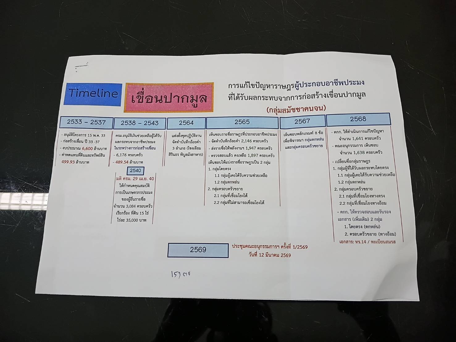 โดยที่ประชุมของคณะอนุกรรมการฯ มีมติเห็นชอบการตรวจสอบและรับรองเอกสารของราษฎรผู้ประกอบอาชีพประมงที่ได้รับผลกระทบจากการก่อสร้างเขื่อนปากมูล จังหวัดอุบลราชธานี กลุ่มสมัชชาคนจน(เพิ่มเติม) เฉพาะ 2 กลุ่ม ประกอบด้วย