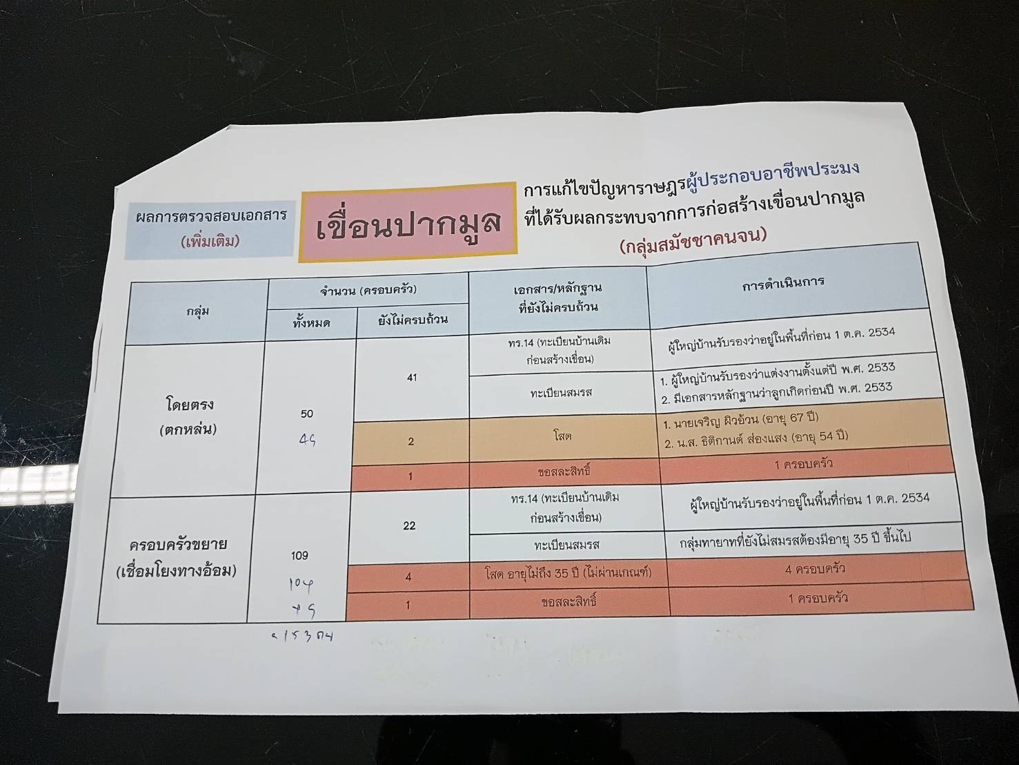 (2) กลุ่มครอบครัวขยาย (เชื่อมโยงทางอ้อม)  จำนวน 104 ราย รวมรายชื่อราษฎรผู้ประกอบอาชีพประมงที่ได้รับผลกระทบ (เพิ่มเติม) ของกลุ่มสมัชชาคนจน  จำนวน 153 ราย