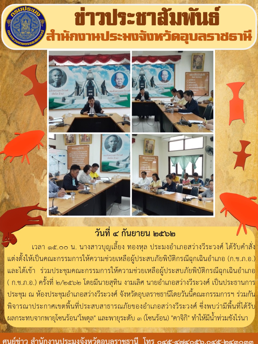วันอังคารที่ 4 เดือนกันยายน 2562 เวลา 15.00 น. นางสาวบุญเลี้ยง ทองหุล ประมงอำเภอสว่างวีระวงศ์ ได้รับคำสั่งแต่งตั้งให้เป็นคณะกรรมการให้ความช่วยเหลือผู้ประสบภัยพิบัติกรณีฉุกเฉินอำเภอ (ก.ช.ภ.อ.) และได้เข้า  ร่วมประชุมคณะกรรมการให้ความช่วยเหลือผู้ประสบภัยพิบัติกรณีฉุกเฉินอำเภอ( ก.ช.ภ.อ.) ครั้งที่ 2/2562 โดยมีนายสุทิน งามเลิศ นายอำเภอสว่างวีระวงศ์ เป็นประธานการประชุม ณ ห้องประชุมอำเภอสว่างวีระวงศ์ จังหวัดอุบลราชธานี