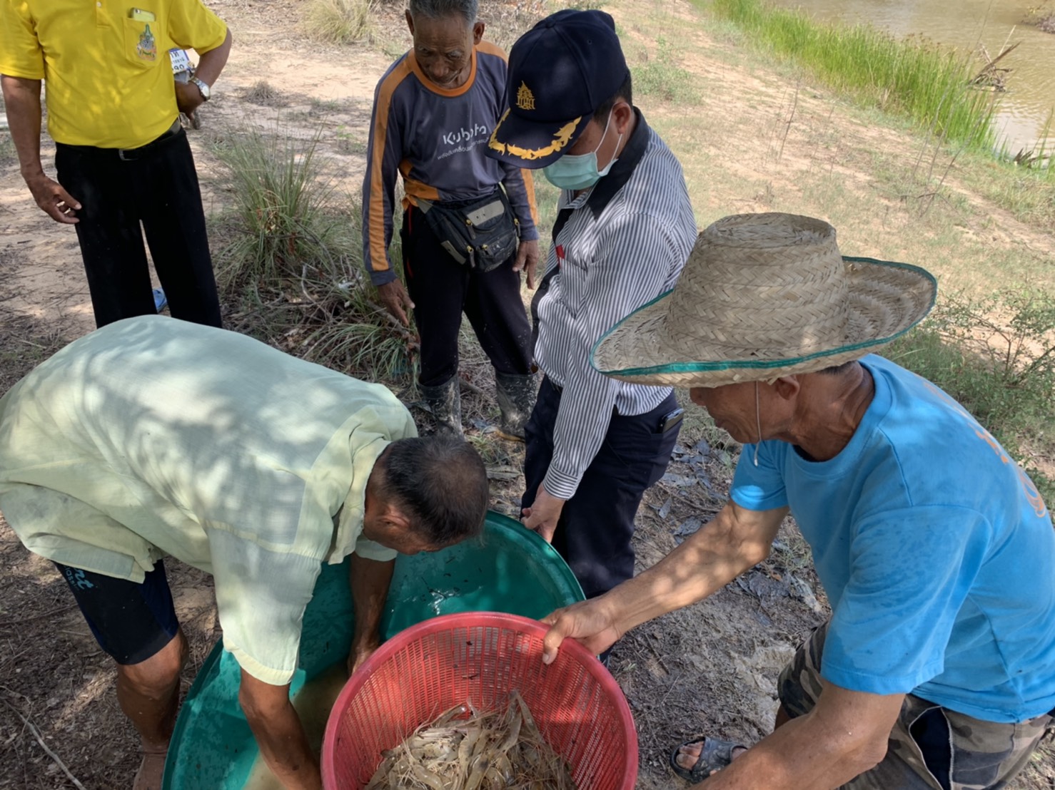 การติดตามการเจริญเติบโตของกุ้งก้ามกราม ตามแผนปฏิบัติการฟื้นฟูเยียวยาผู้ประสบภัยฯ ปี 62  "โครงการสร้างรายได้จากอาชีพประมงในแหล่งน้ำขุมชน"