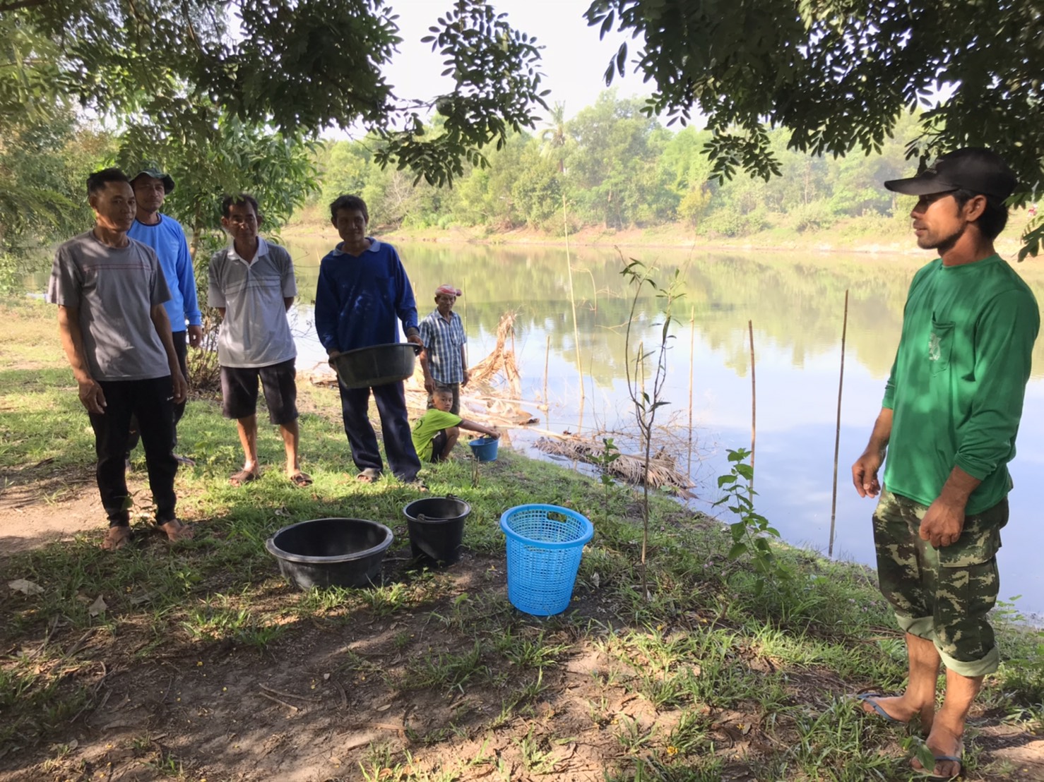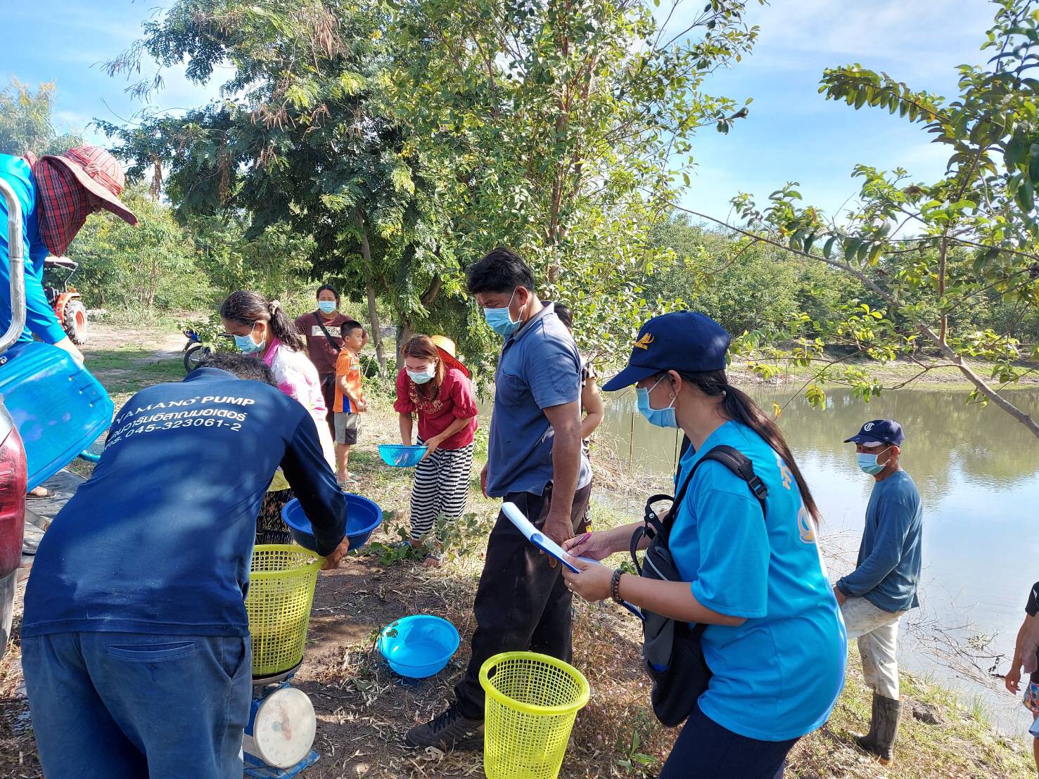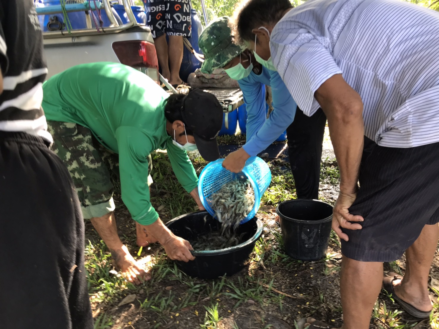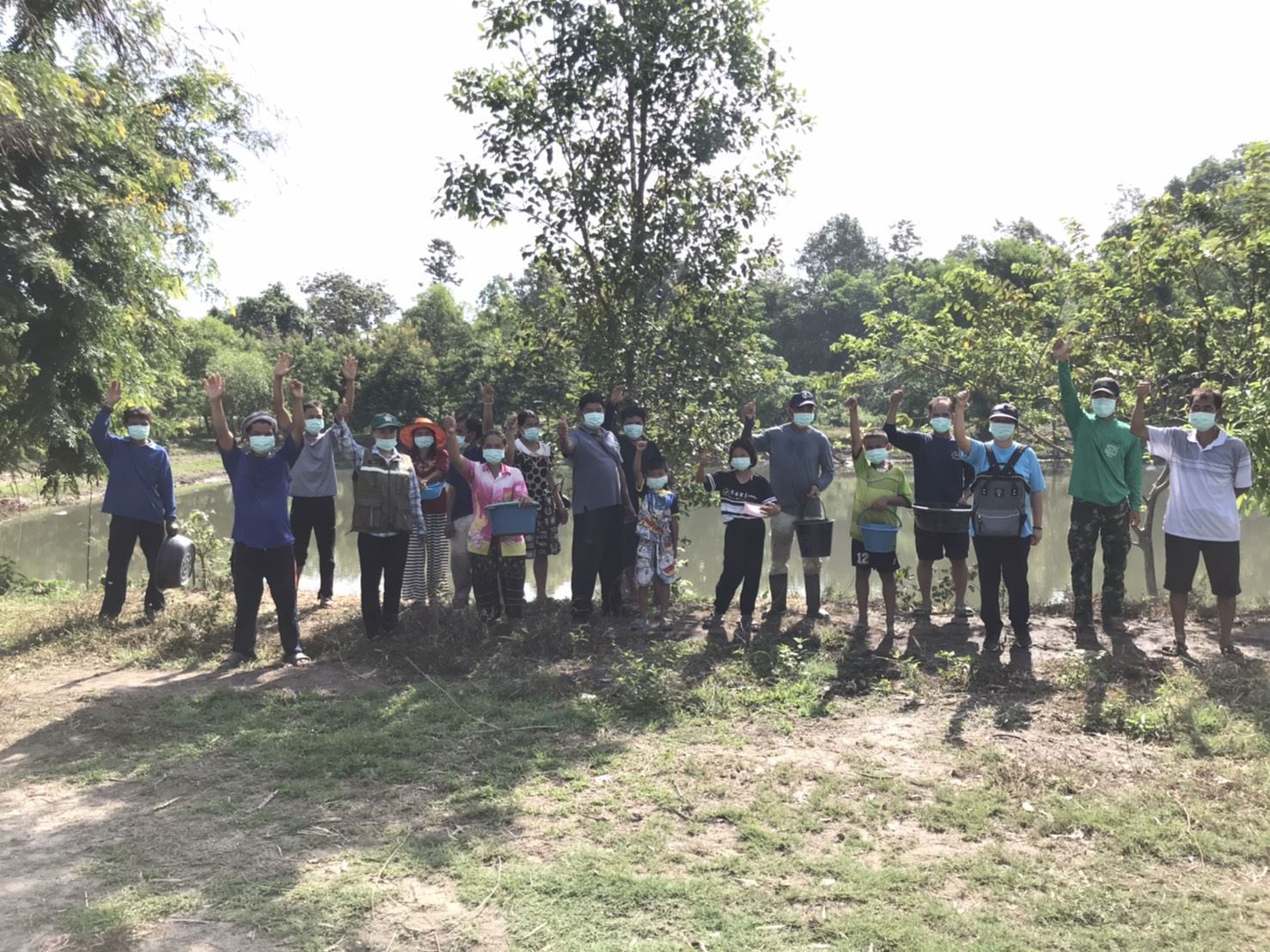 หัวหน้ากลุ่มบริหารและยุทธศาสตร์ ละคณะกรรมการบริหารจัดการแหล่งน้ำชุมชนหนองชาดวมกันปล่อยลูกพันธุ์กุ้งกราม ตามแผนปฏิบัติการฟื้นฟูเยียวยา เกษตรกรผู้ประสบภัยฝนทิ้งช่วง และอุทกภัยปี 2562