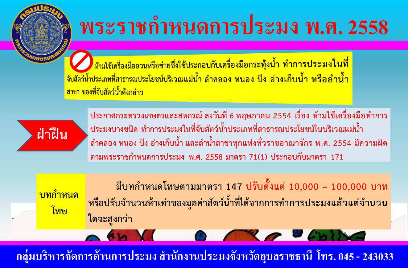 สำนักงานประมงจังหวัดอุบลราชธานี แจ้งประชาสัมพันธ์ให้เกษตรกรผู้เพาะเลี้ยงสัตว์น้ำ ชาวประมง และประชาชนทั่วไปในพื้นที่ได้รับทราบข้อมูลกฏหมายด้านการประมง ในการใช้เครื่องมือเพื่อการประมง ดังนี้