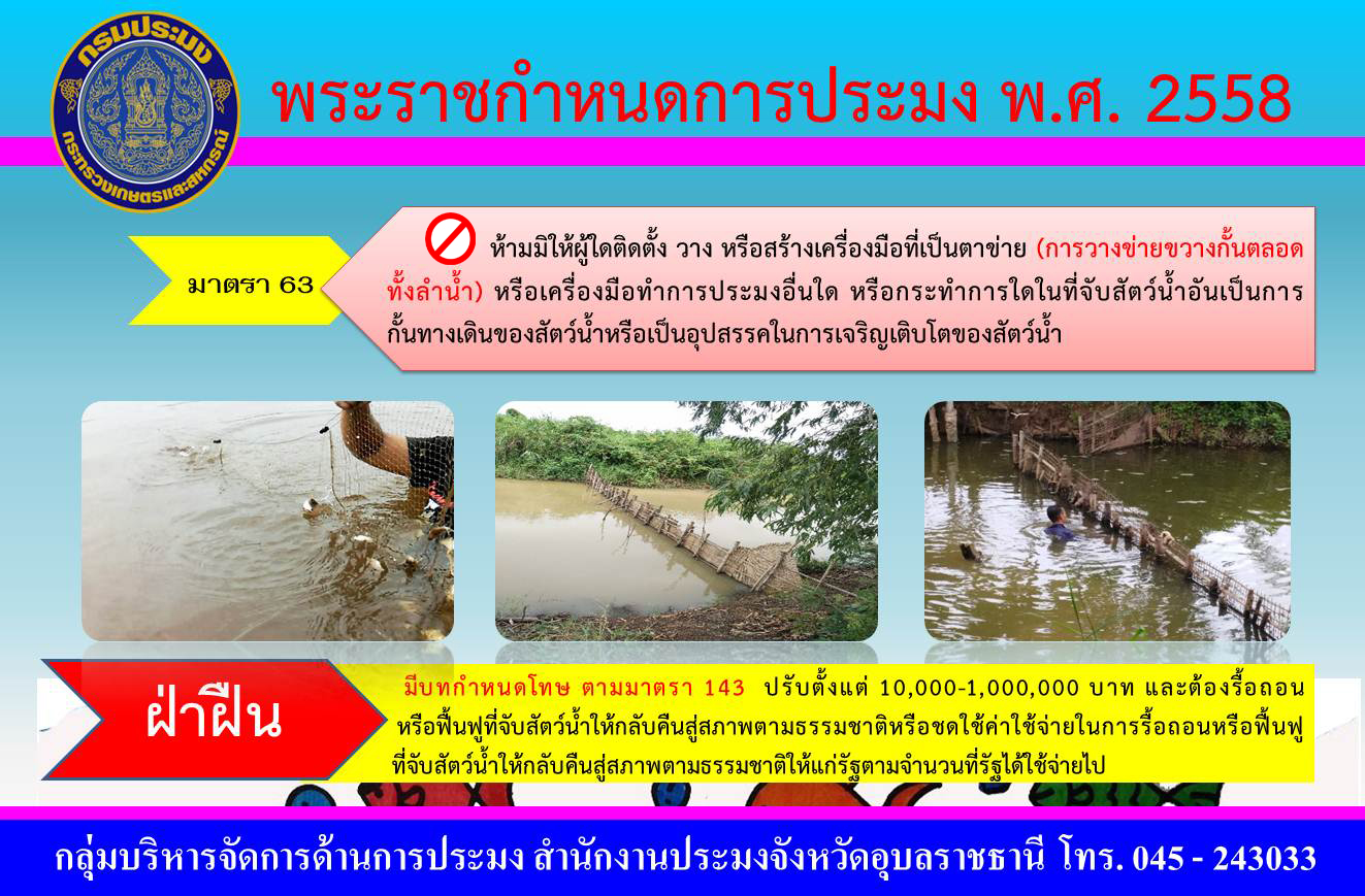 มาตรา 63 ห้ามมิให้ผู้ใดติดตั้ง วาง หรือสร้างเครื่องมืที่เป็นตาข่าย (วางข่ายขวางตลอดทั้งลำน้ำ) อันเป็นการกั้นทางเดินสัตว์น้ำฯ