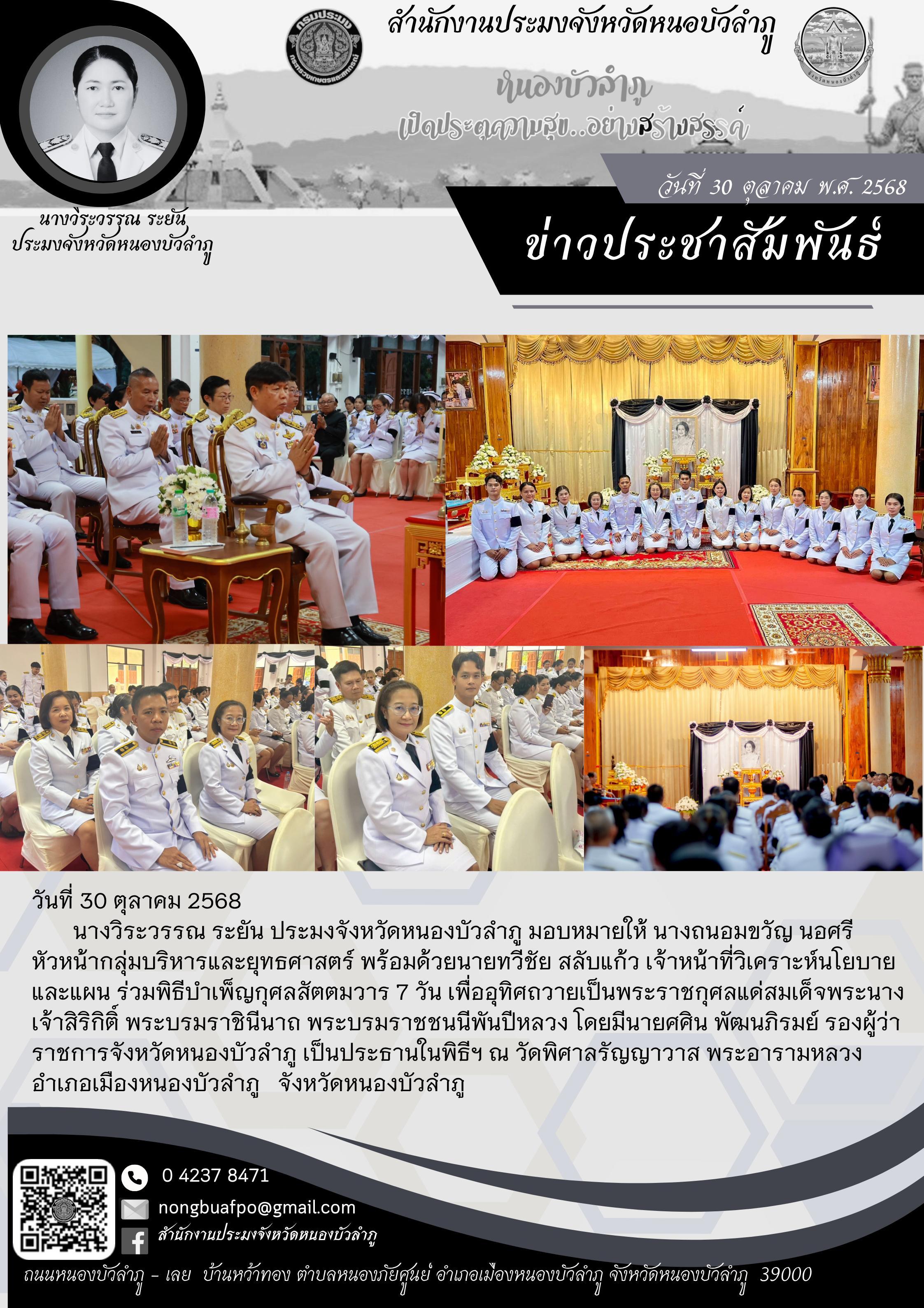 นางวิระวรรณ ระยัน ประมงจังหวัดหนองบัวลำภู มอบหมายให้ นางถนอมขวัญ นอศรี หัวหน้ากลุ่มบริหารและยุทธศาสตร์ พร้อมด้วยนายทวีชัย สลับแก้ว เจ้าหน้าที่วิเคราะห์นโยบายและแผน ร่วมพิธีบำเพ็ญกุศลสัตตมวาร 7 วัน เพื่ออุทิศถวายเป็นพระราชกุศลแด่สมเด็จพระนางเจ้าสิริกิติ์ พระบรมราชินีนาถ พระบรมราชชนนีพันปีหลวง โดยมีนายศศิน พัฒนภิรมย์ รองผู้ว่าราชการจังหวัดหนองบัวลำภู เป็นประธานในพิธีฯ ณ วัดพิศาลรัญญาวาส พระอารามหลวง อำเภอเมืองหนองบัวลำภู จังหวัดหนองบัวลำภู
