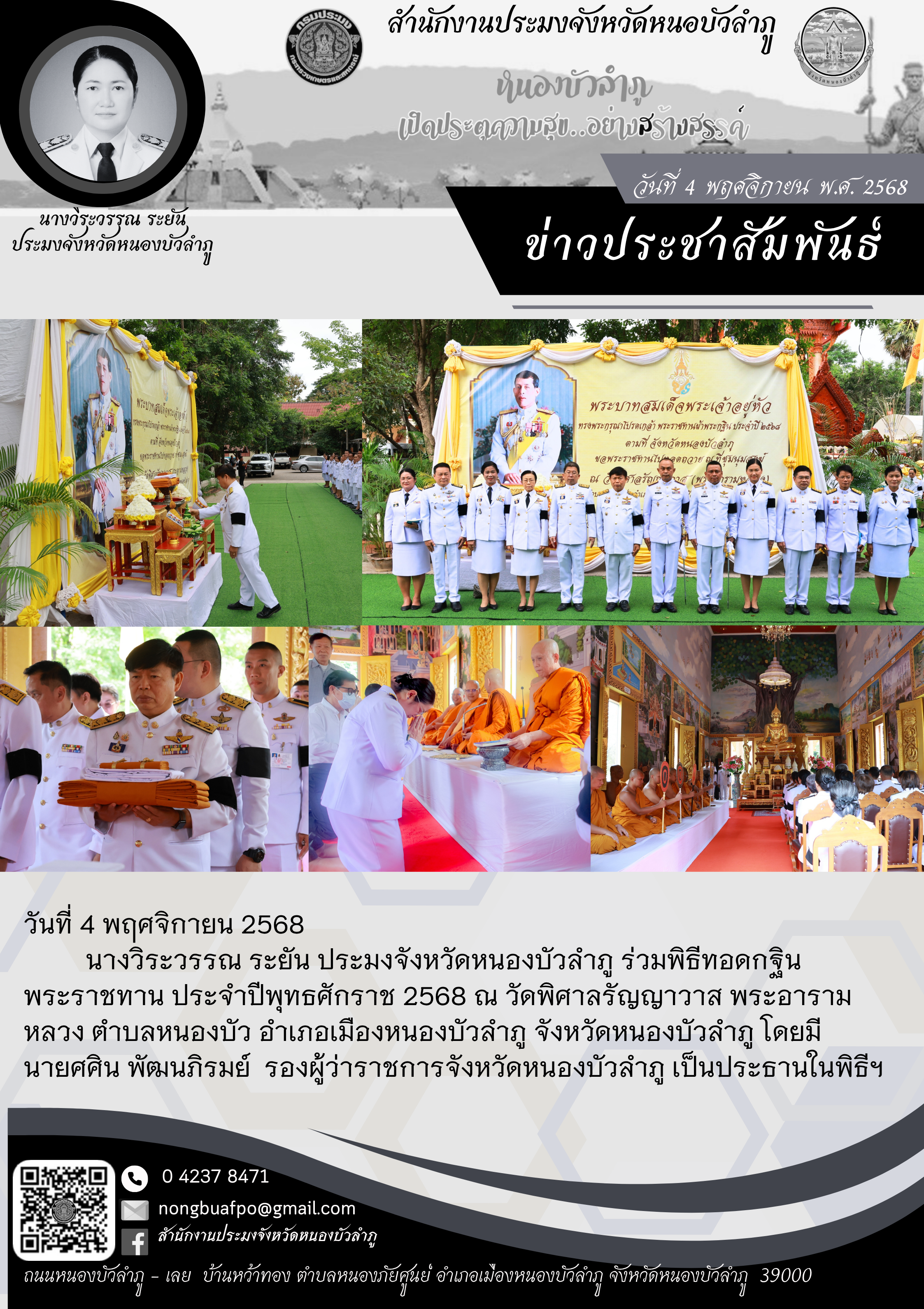 นางวิระวรรณ ระยัน ประมงจังหวัดหนองบัวลำภู ร่วมพิธีทอดกฐินพระราชทาน ประจำปีพุทธศักราช 2568 ณ วัดพิศาลรัญญาวาส พระอารามหลวง ตำบลหนองบัว อำเภอเมืองหนองบัวลำภู จังหวัดหนองบัวลำภู โดยมี นายศศิน พัฒนภิรมย์ รองผู้ว่าราชการจังหวัดหนองบัวลำภู เป็นประธานในพิธีฯ