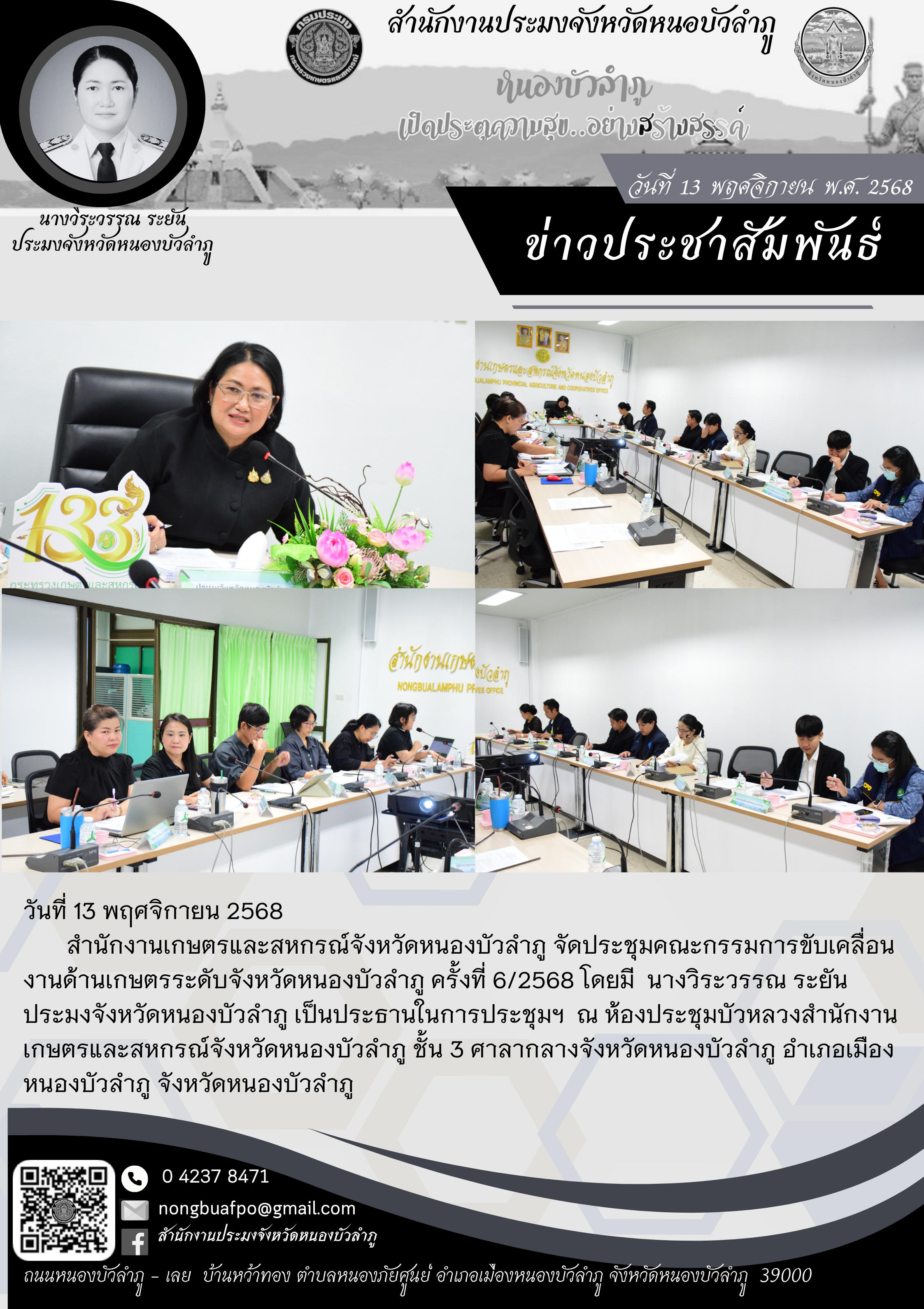 สำนักงานเกษตรและสหกรณ์จังหวัดหนองบัวลำภู จัดประชุมคณะกรรมการขับเคลื่อนงานด้านเกษตรระดับจังหวัดหนองบัวลำภู ครั้งที่ 6/2568 โดยมี นางวิระวรรณ ระยัน ประมงจังหวัดหนองบัวลำภู เป็นประธานในการประชุมฯ ณ ห้องประชุมบัวหลวงสำนักงานเกษตรและสหกรณ์จังหวัดหนองบัวลำภู ชั้น 3 ศาลากลางจังหวัดหนองบัวลำภู อำเภอเมืองหนองบัวลำภู จังหวัดหนองบัวลำภู