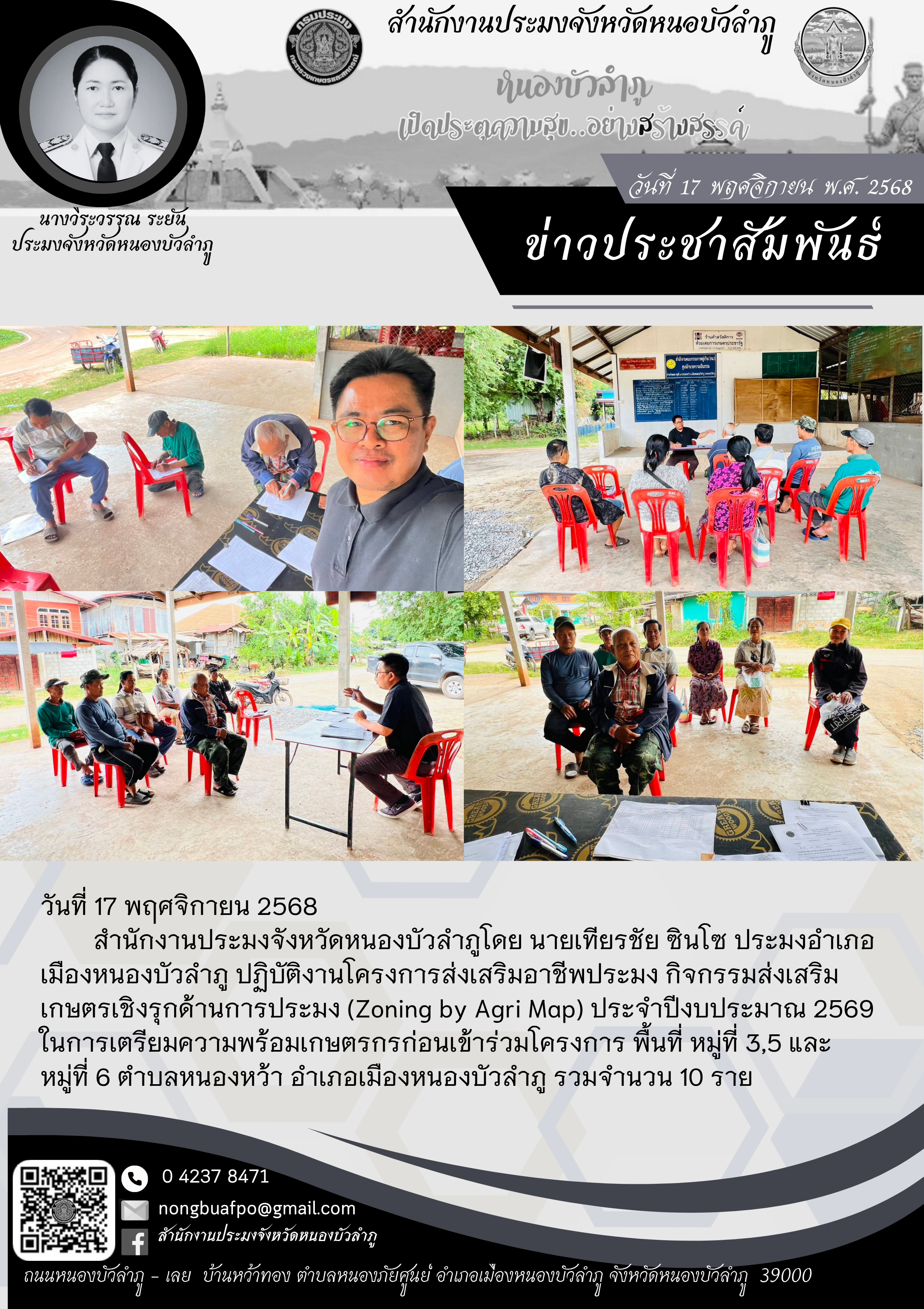 สำนักงานประมงจังหวัดหนองบัวลำภูโดย นายเทียรชัย ซินโซ ประมงอำเภอเมืองหนองบัวลำภู ปฏิบัติงานโครงการส่งเสริมอาชีพประมง กิจกรรมส่งเสริมเกษตรเชิงรุกด้านการประมง (Zoning by Agri Map) ประจำปีงบประมาณ 2569 ในการเตรียมความพร้อมเกษตรกรก่อนเข้าร่วมโครงการ พื้นที่ หมู่ที่ 3,5 และหมู่ที่ 6 ตำบลหนองหว้า อำเภอเมืองหนองบัวลำภู รวมจำนวน 10 ราย