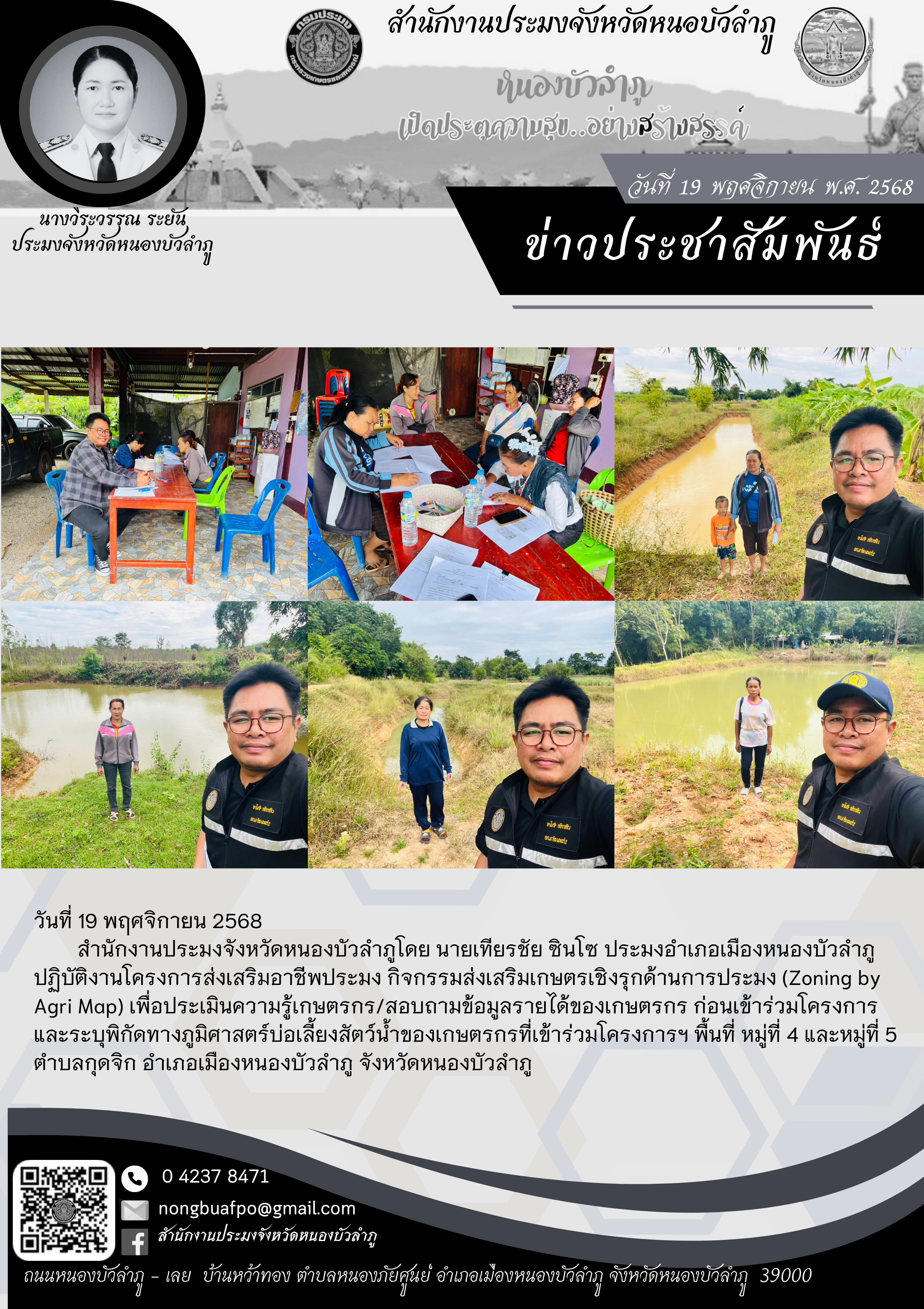 สำนักงานประมงจังหวัดหนองบัวลำภูโดย นายเทียรชัย ซินโซ ประมงอำเภอเมืองหนองบัวลำภู ปฏิบัติงานโครงการส่งเสริมอาชีพประมง กิจกรรมส่งเสริมเกษตรเชิงรุกด้านการประมง (Zoning by Agri Map) เพื่อประเมินความรู้เกษตรกร/สอบถามข้อมูลรายได้ของเกษตรกร ก่อนเข้าร่วมโครงการ และระบุพิกัดทางภูมิศาสตร์บ่อเลี้ยงสัตว์น้ำของเกษตรกรที่เข้าร่วมโครงการฯ พื้นที่ หมู่ที่ 4 และหมู่ที่ 5 ตำบลกุดจิก อำเภอเมืองหนองบัวลำภู จังหวัดหนองบัวลำภู