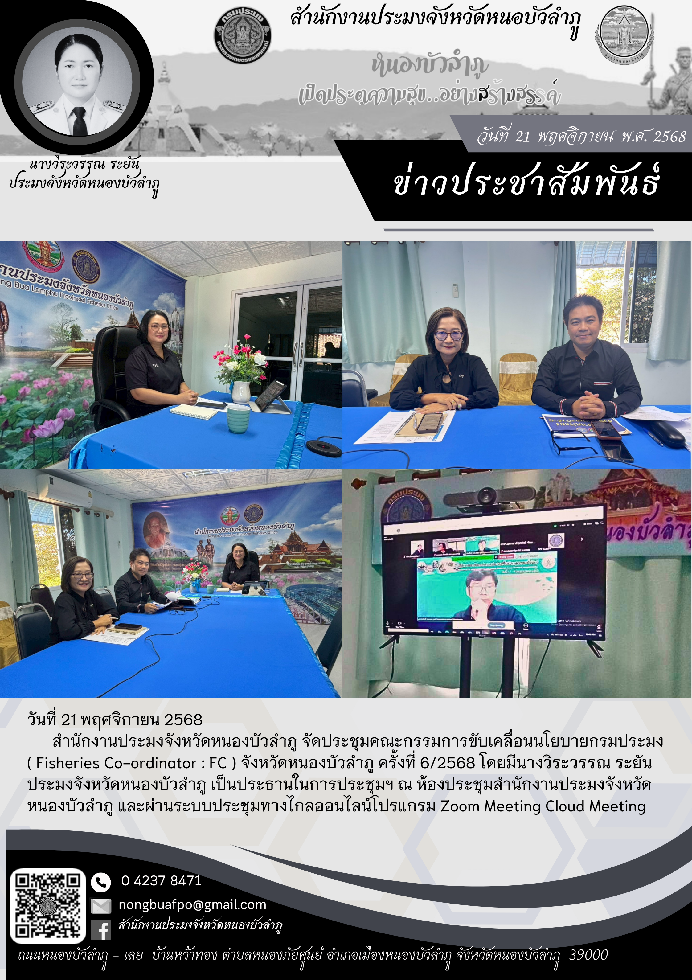 สำนักงานประมงจังหวัดหนองบัวลำภู จัดประชุมคณะกรรมการขับเคลื่อนนโยบายกรมประมง ( Fisheries Co-ordinator : FC ) จังหวัดหนองบัวลำภู ครั้งที่ 6/2568 โดยมีนางวิระวรรณ ระยันประมงจังหวัดหนองบัวลำภู เป็นประธานในการประชุมฯ ณ ห้องประชุมสำนักงานประมงจังหวัดหนองบัวลำภู และผ่านระบบประชุมทางไกลออนไลน์โปรแกรม Zoom Meeting Cloud Meeting