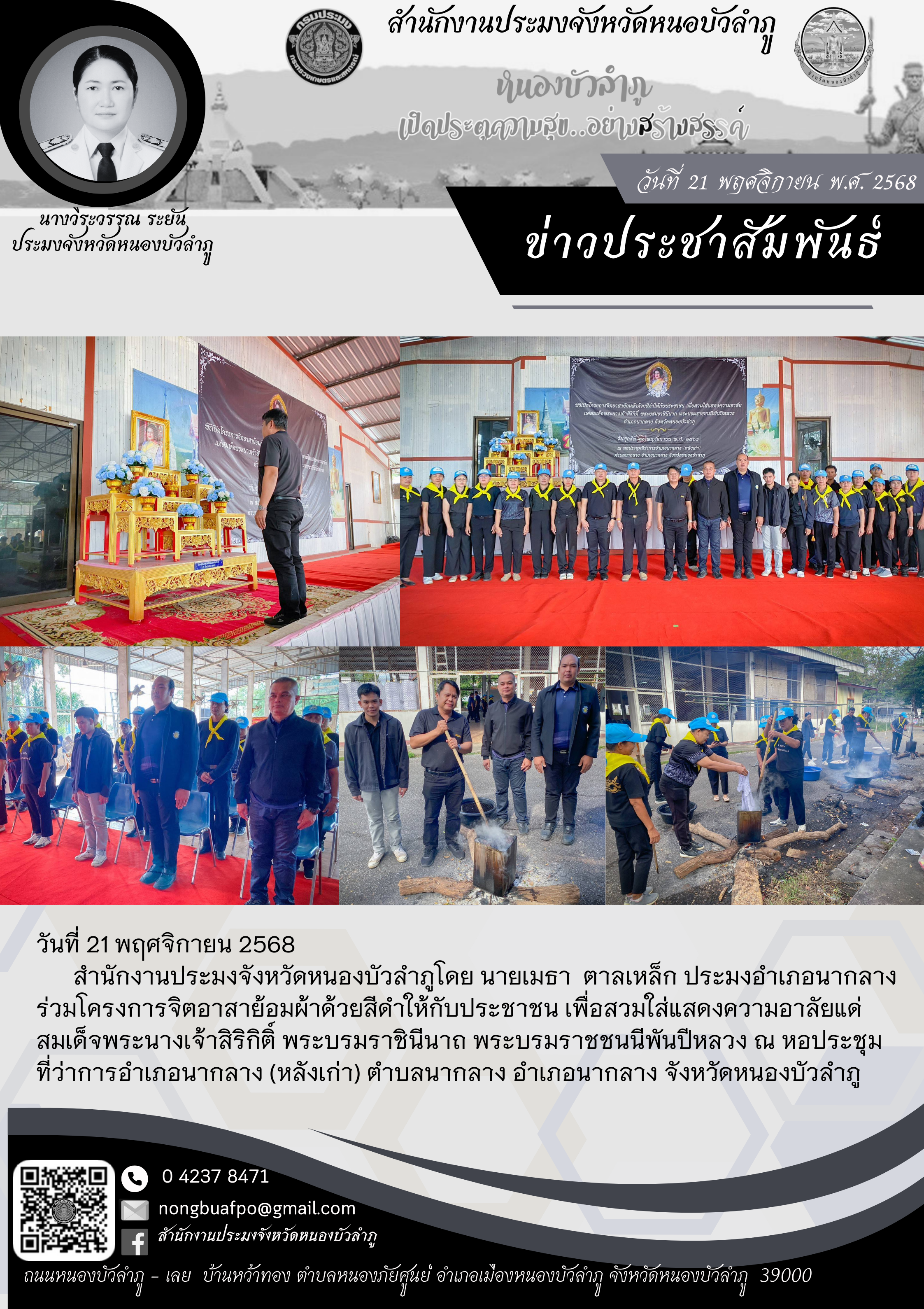 สำนักงานประมงจังหวัดหนองบัวลำภูโดย นายเมธา ตาลเหล็ก ประมงอำเภอนากลาง ร่วมโครงการจิตอาสาย้อมผ้าด้วยสีดำให้กับประชาชน เพื่อสวมใส่แสดงความอาลัยแด่สมเด็จพระนางเจ้าสิริกิติ์ พระบรมราชินีนาถ พระบรมราชชนนีพันปีหลวง ณ หอประชุม ที่ว่าการอำเภอนากลาง (หลังเก่า) ตำบลนากลาง อำเภอนากลาง จังหวัดหนองบัวลำภู