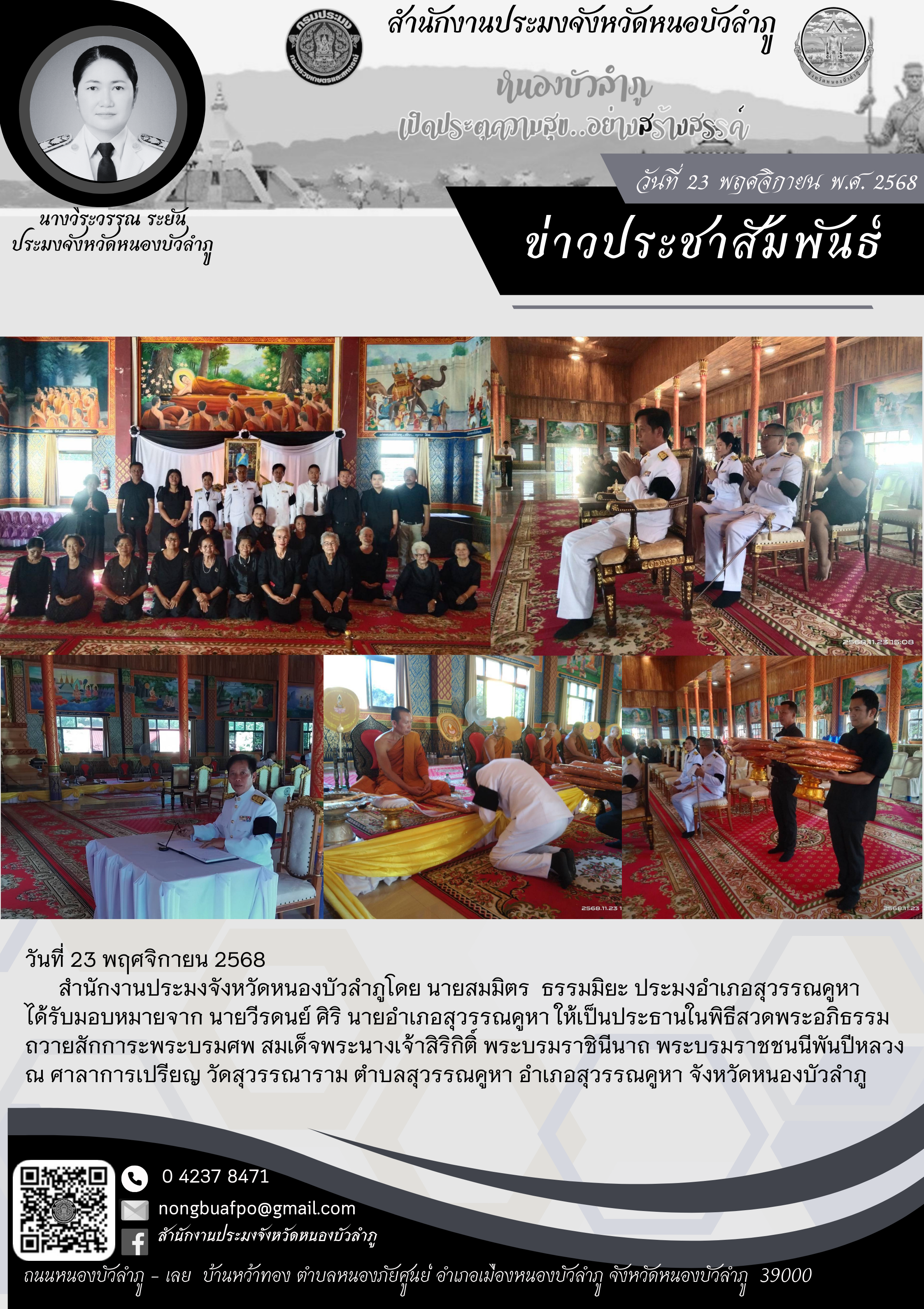 สำนักงานประมงจังหวัดหนองบัวลำภูโดย นายสมมิตร ธรรมมิยะ ประมงอำเภอสุวรรณคูหา ได้รับมอบหมายจาก นายวีรดนย์ ศิริ นายอำเภอสุวรรณคูหา ให้เป็นประธานในพิธีสวดพระอภิธรรมถวายสักการะพระบรมศพ สมเด็จพระนางเจ้าสิริกิติ์ พระบรมราชินีนาถ พระบรมราชชนนีพันปีหลวง ณ ศาลาการเปรียญ วัดสุวรรณาราม ตำบลสุวรรณคูหา อำเภอสุวรรณคูหา จังหวัดหนองบัวลำภู