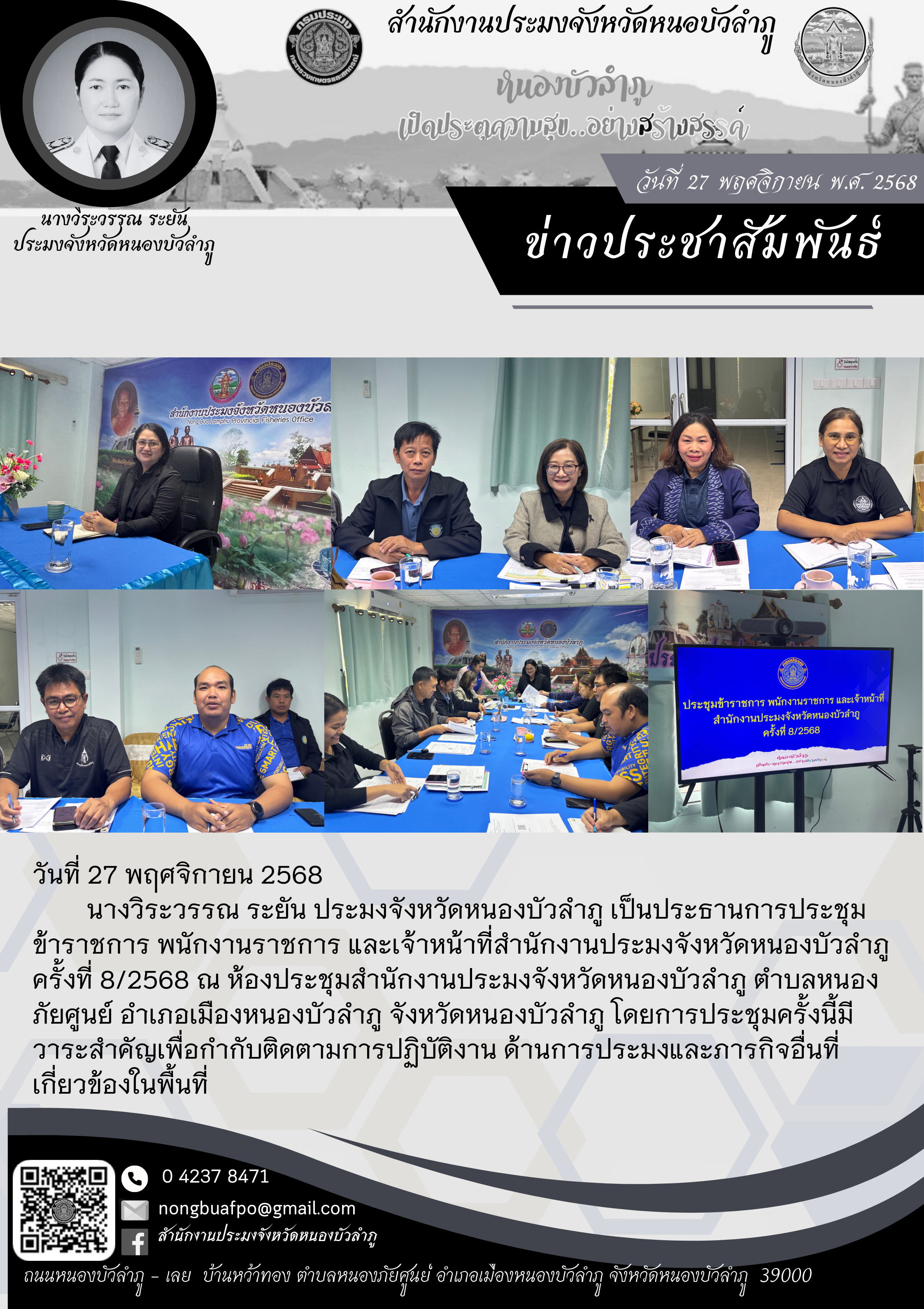 ประชุม ข้าราชการ พนักงานราชการ และเจ้าหน้าที่สำนักงานประมงจังหวัดหนองบัวลำภู ครั้งที่ 8/2568