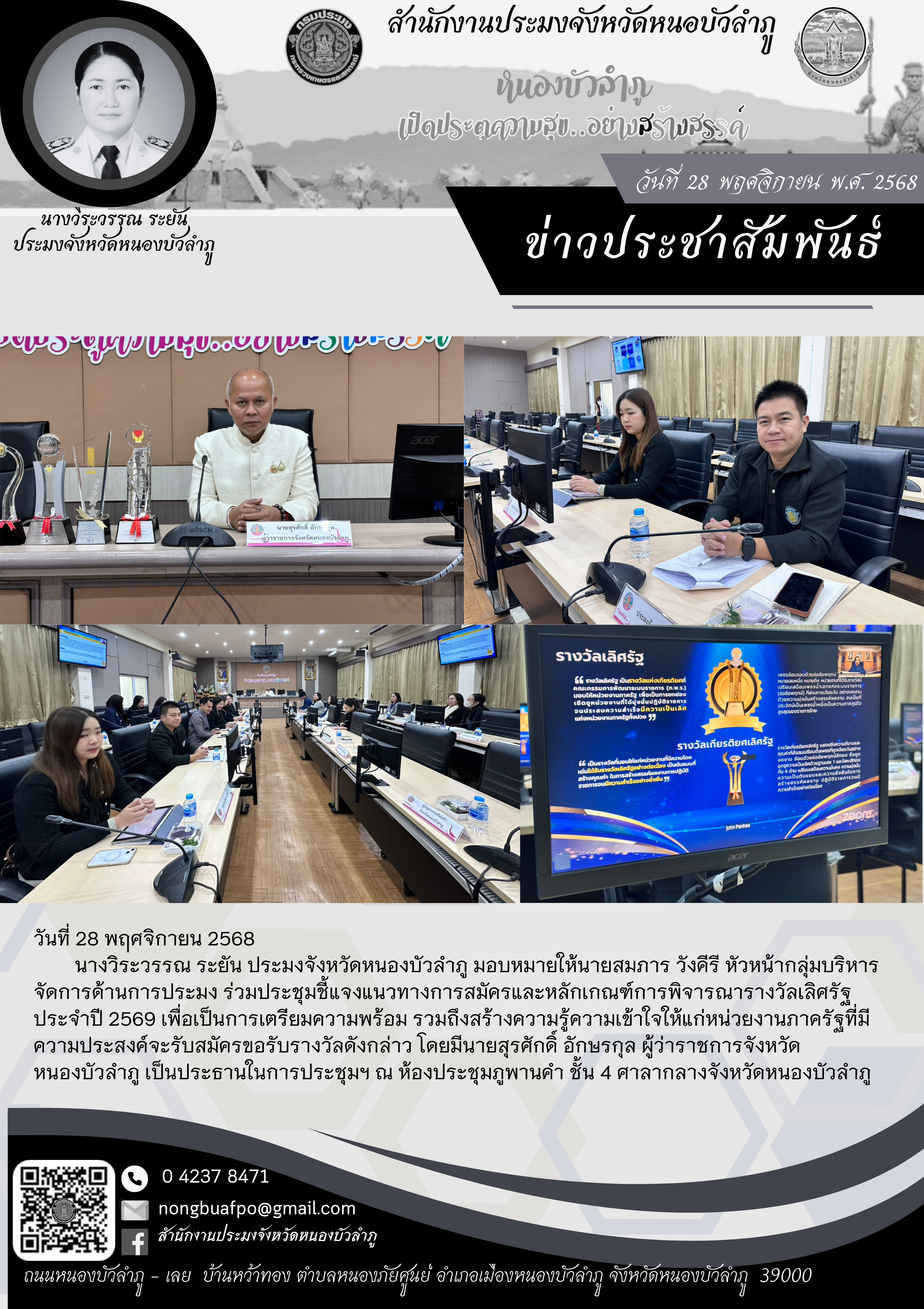 นางวิระวรรณ ระยัน ประมงจังหวัดหนองบัวลำภู มอบหมายให้นายสมภาร วังคีรี หัวหน้ากลุ่มบริหารจัดการด้านการประมง ร่วมประชุมชี้แจงแนวทางการสมัครและหลักเกณฑ์การพิจารณารางวัลเลิศรัฐ ประจำปี 2569 เพื่อเป็นการเตรียมความพร้อม รวมถึงสร้างความรู้ความเข้าใจให้แก่หน่วยงานภาครัฐที่มีความประสงค์จะรับสมัครขอรับรางวัลดังกล่าว โดยมีนายสุรศักดิ์ อักษรกุล ผู้ว่าราชการจังหวัดหนองบัวลำภู เป็นประธานในการประชุมฯ ณ ห้องประชุมภูพานคำ ชั้น 4 ศาลากลางจังหวัดหนองบัวลำภู