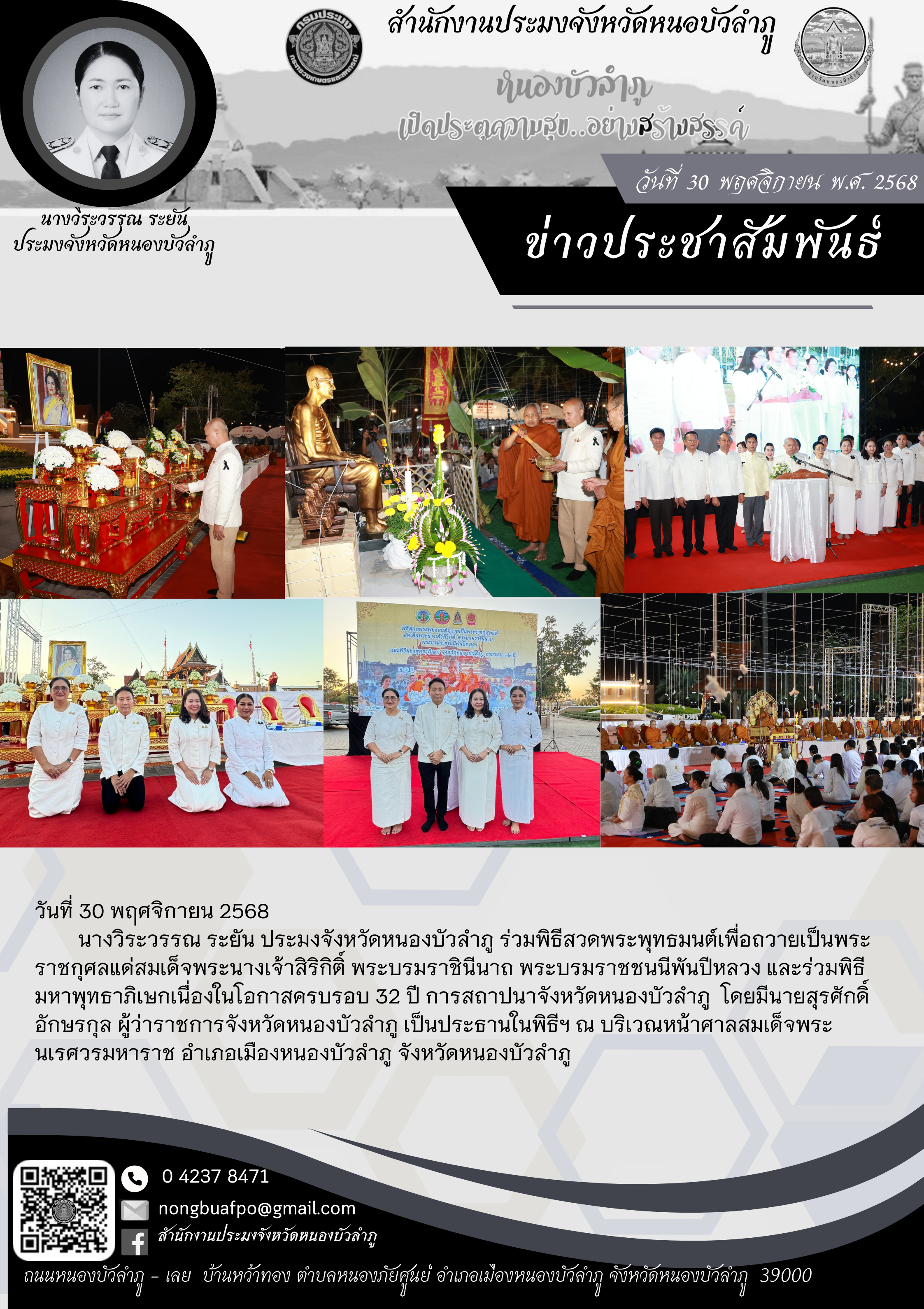 ร่วมพิธีสวดพระพุทธมนต์เพื่อถวายเป็นพระราชกุศลแด่สมเด็จพระนางเจ้าสิริกิติ์ พระบรมราชินีนาถ พระบรมราชชนนีพันปีหลวง และร่วมพิธีมหาพุทธาภิเษกเนื่องในโอกาสครบรอบ 32 ปี การสถาปนาจังหวัดหนองบัวลำภู