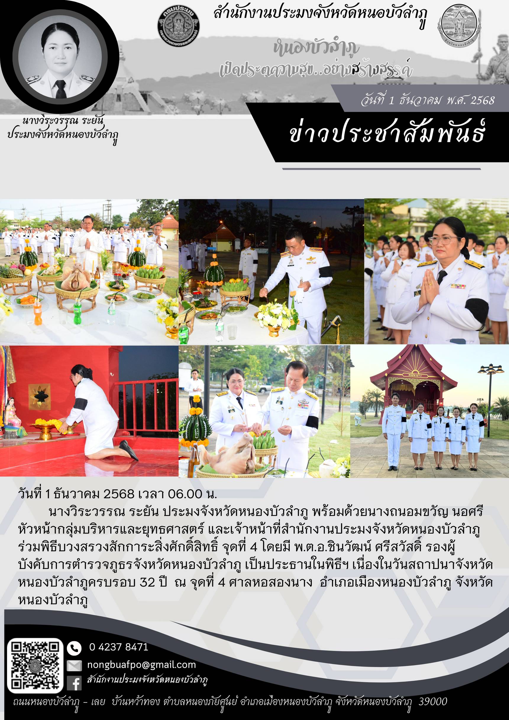 นางวิระวรรณ ระยัน ประมงจังหวัดหนองบัวลำภู พร้อมด้วยนางถนอมขวัญ นอศรี หัวหน้ากลุ่มบริหารและยุทธศาสตร์ และเจ้าหน้าที่สำนักงานประมงจังหวัดหนองบัวลำภู ร่วมพิธีบวงสรวงสักการะสิ่งศักดิ์สิทธิ์ จุดที่ 4 โดยมี พ.ต.อ.ชินวัฒน์ ศรีสวัสดิ์ รองผู้บังคับการตำรวจภูธรจังหวัดหนองบัวลำภู เป็นประธานในพิธีฯ เนื่องในวันสถาปนาจังหวัดหนองบัวลำภูครบรอบ 32 ปี ณ จุดที่ 4 ศาลหอสองนาง อำเภอเมืองหนองบัวลำภู จังหวัดหนองบัวลำภู