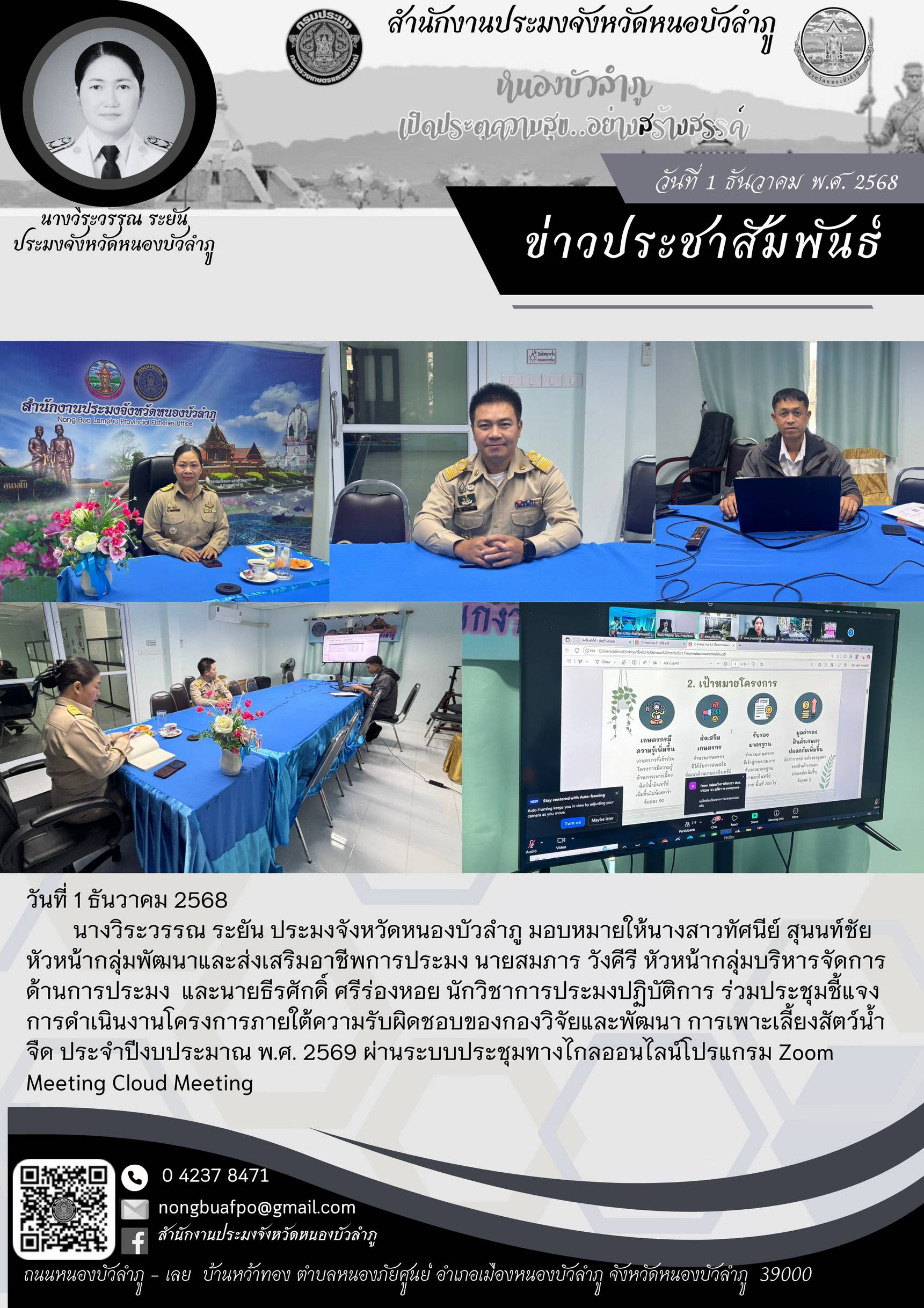 นางวิระวรรณ ระยัน ประมงจังหวัดหนองบัวลำภู มอบหมายให้นางสาวทัศนีย์ สุนนท์ชัย หัวหน้ากลุ่มพัฒนาและส่งเสริมอาชีพการประมง นายสมภาร วังคีรี หัวหน้ากลุ่มบริหารจัดการด้านการประมง และนายธีรศักดิ์ ศรีร่องหอย นักวิชาการประมงปฏิบัติการ ร่วมประชุมชี้แจงการดำเนินงานโครงการภายใต้ความรับผิดชอบของกองวิจัยและพัฒนา การเพาะเลี้ยงสัตว์น้ำจืด ประจำปีงบประมาณ พ.ศ. 2569 ผ่านระบบประชุมทางไกลออนไลน์โปรแกรม Zoom Meeting Cloud Meeting