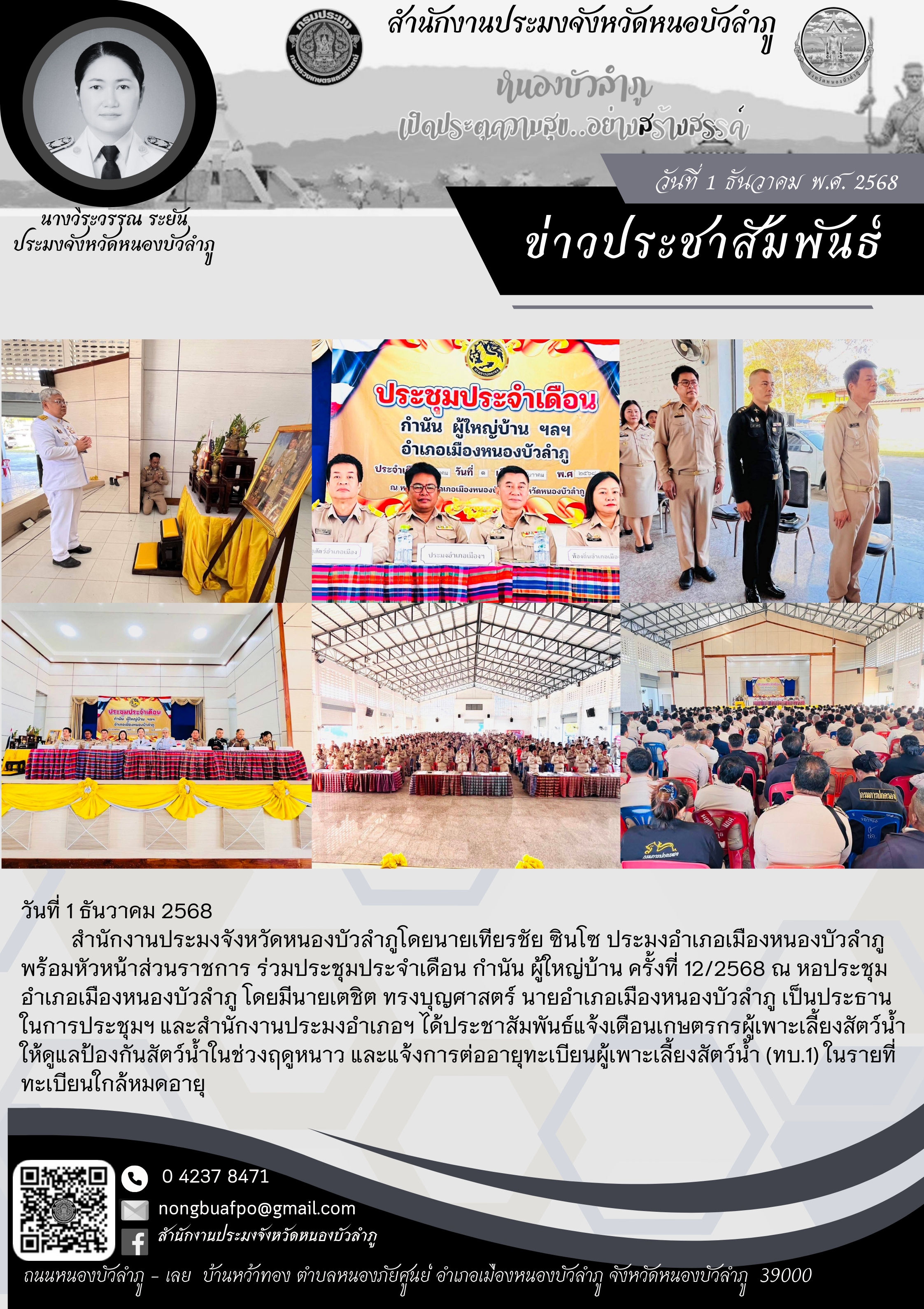 สำนักงานประมงจังหวัดหนองบัวลำภูโดยนายเทียรชัย ซินโซ ประมงอำเภอเมืองหนองบัวลำภู พร้อมหัวหน้าส่วนราชการ ร่วมประชุมประจำเดือน กำนัน ผู้ใหญ่บ้าน ครั้งที่ 12/2568 ณ หอประชุมอำเภอเมืองหนองบัวลำภู โดยมีนายเตชิต ทรงบุญศาสตร์ นายอำเภอเมืองหนองบัวลำภู เป็นประธาน ในการประชุมฯ และสำนักงานประมงอำเภอฯ ได้ประชาสัมพันธ์แจ้งเตือนเกษตรกรผู้เพาะเลี้ยงสัตว์น้ำให้ดูแลป้องกันสัตว์น้ำในช่วงฤดูหนาว และแจ้งการต่ออายุทะเบียนผู้เพาะเลี้ยงสัตว์น้ำ (ทบ.1) ในรายที่ทะเบียนใกล้หมดอายุ