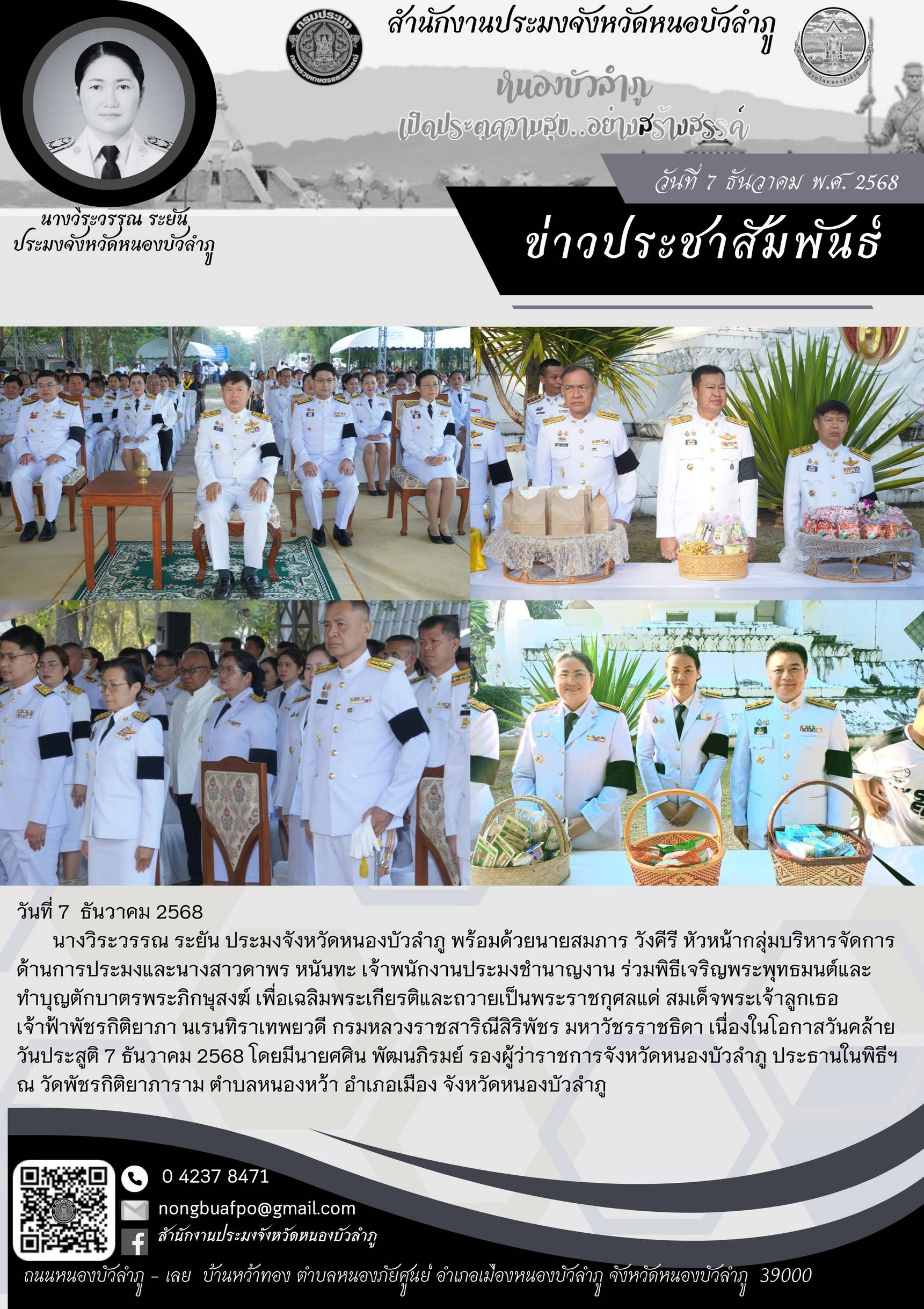 นางวิระวรรณ ระยัน ประมงจังหวัดหนองบัวลำภู พร้อมด้วยนายสมภาร วังคีรี หัวหน้ากลุ่มบริหารจัดการด้านการประมงและนางสาวดาพร หนันทะ เจ้าพนักงานประมงชำนาญงาน ร่วมพิธีเจริญพระพุทธมนต์และทำบุญตักบาตรพระภิกษุสงฆ์ เพื่อเฉลิมพระเกียรติและถวายเป็นพระราชกุศลแด่ สมเด็จพระเจ้าลูกเธอ เจ้าฟ้าพัชรกิติยาภา นเรนทิราเทพยวดี กรมหลวงราชสาริณีสิริพัชร มหาวัชรราชธิดา เนื่องในโอกาสวันคล้ายวันประสูติ 7 ธันวาคม 2568 โดยมีนายศศิน พัฒนภิรมย์ รองผู้ว่าราชการจังหวัดหนองบัวลำภู ประธานในพิธีฯ ณ วัดพัชรกิติยาภาราม ตำบลหนองหว้า อำเภอเมือง จังหวัดหนองบัวลำภู