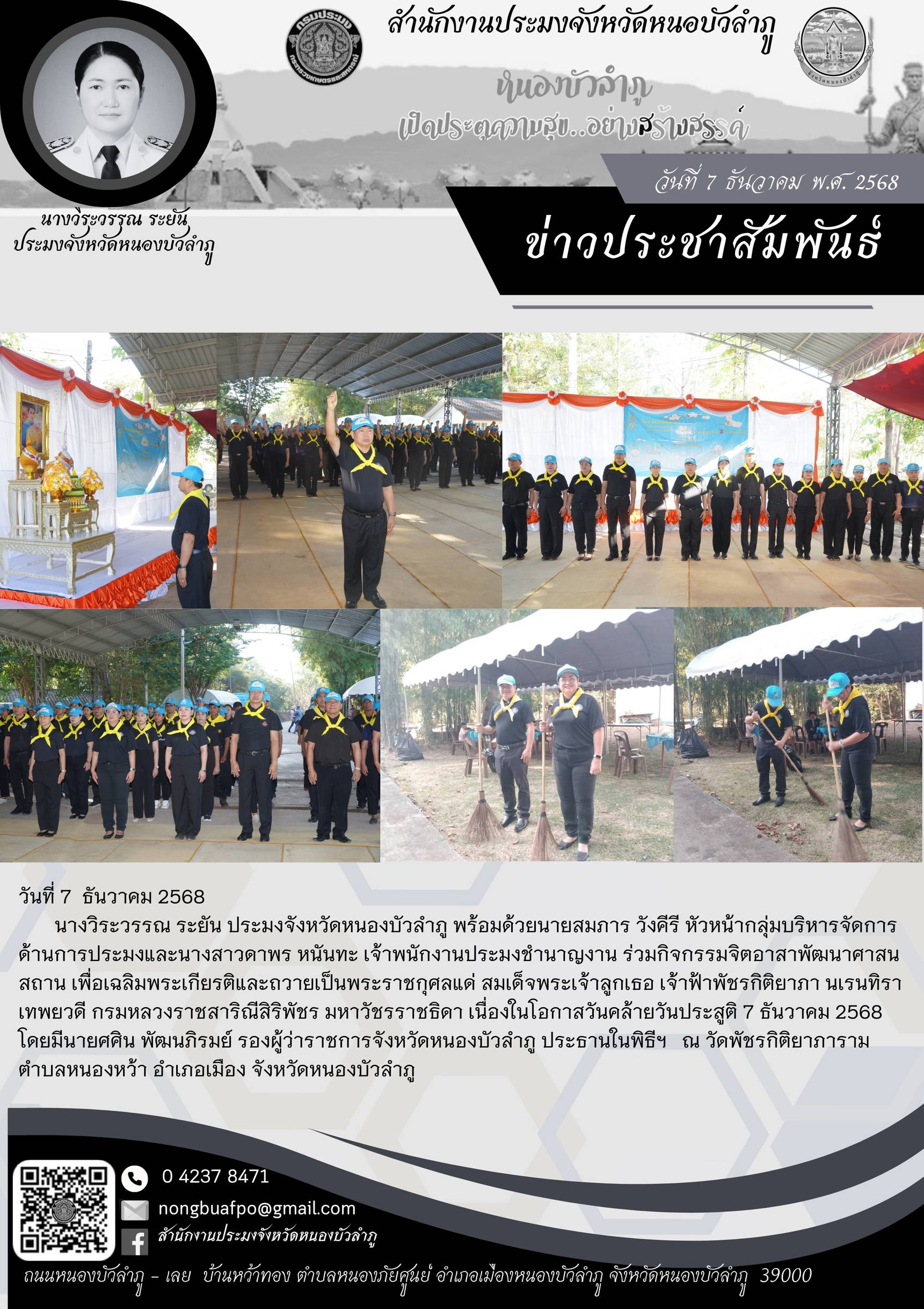 นางวิระวรรณ ระยัน ประมงจังหวัดหนองบัวลำภู พร้อมด้วยนายสมภาร วังคีรี หัวหน้ากลุ่มบริหารจัดการด้านการประมงและนางสาวดาพร หนันทะ เจ้าพนักงานประมงชำนาญงาน ร่วมกิจกรรมจิตอาสาพัฒนาศาสนสถาน เพื่อเฉลิมพระเกียรติและถวายเป็นพระราชกุศลแด่ สมเด็จพระเจ้าลูกเธอ เจ้าฟ้าพัชรกิติยาภา นเรนทิราเทพยวดี กรมหลวงราชสาริณีสิริพัชร มหาวัชรราชธิดา เนื่องในโอกาสวันคล้ายวันประสูติ 7 ธันวาคม 2568 โดยมีนายศศิน พัฒนภิรมย์ รองผู้ว่าราชการจังหวัดหนองบัวลำภู ประธานในพิธีฯ ณ วัดพัชรกิติยาภาราม ตำบลหนองหว้า อำเภอเมือง จังหวัดหนองบัวลำภู