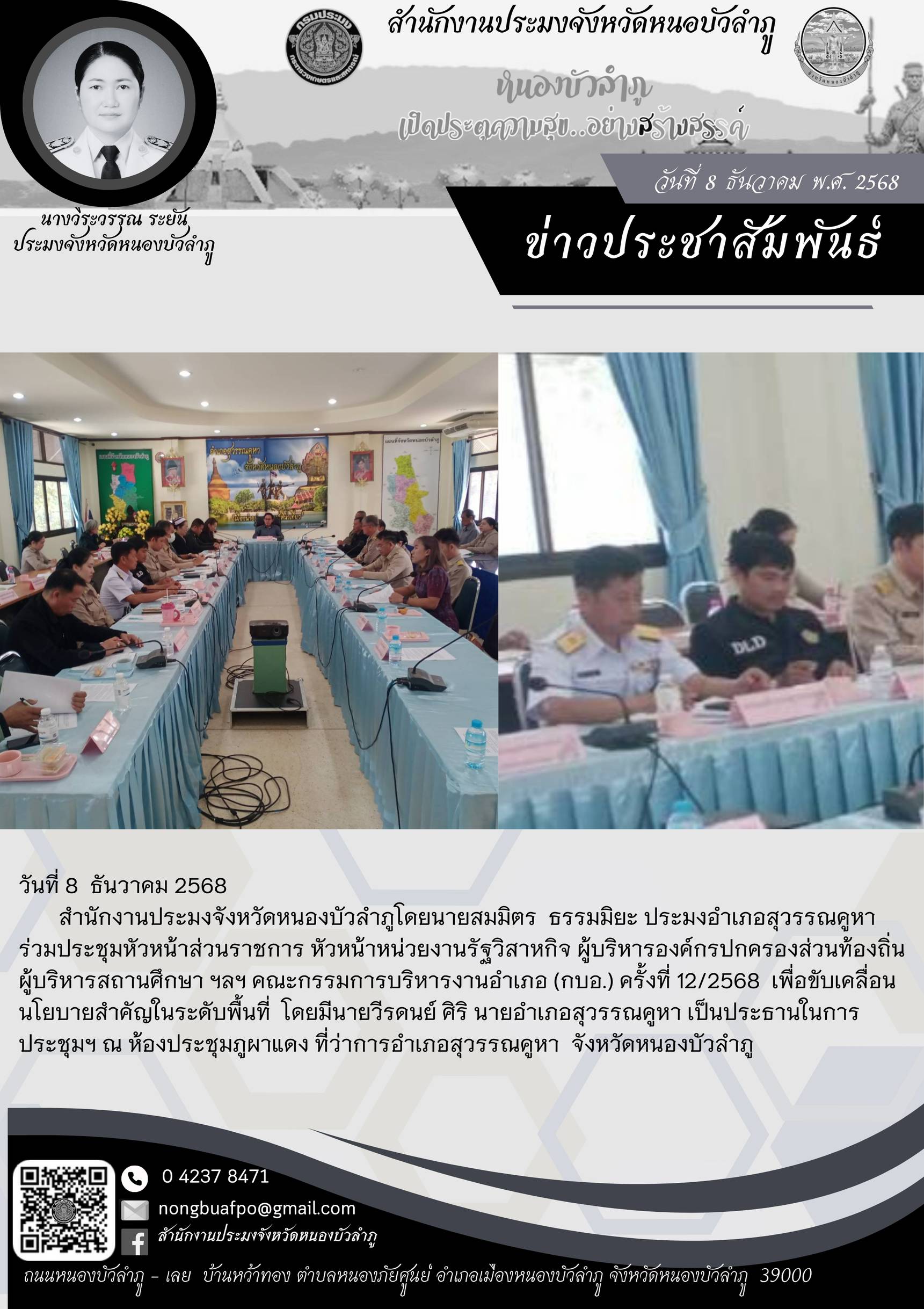 สำนักงานประมงจังหวัดหนองบัวลำภูโดยนายสมมิตร ธรรมมิยะ ประมงอำเภอสุวรรณคูหา ร่วมประชุมหัวหน้าส่วนราชการ หัวหน้าหน่วยงานรัฐวิสาหกิจ ผู้บริหารองค์กรปกครองส่วนท้องถิ่น ผู้บริหารสถานศึกษา ฯลฯ คณะกรรมการบริหารงานอำเภอ (กบอ.) ครั้งที่ 12/2568 เพื่อขับเคลื่อนนโยบายสำคัญในระดับพื้นที่ โดยมีนายวีรดนย์ ศิริ นายอำเภอสุวรรณคูหา เป็นประธานในการประชุมฯ ณ ห้องประชุมภูผาแดง ที่ว่าการอำเภอสุวรรณคูหา จังหวัดหนองบัวลำภู