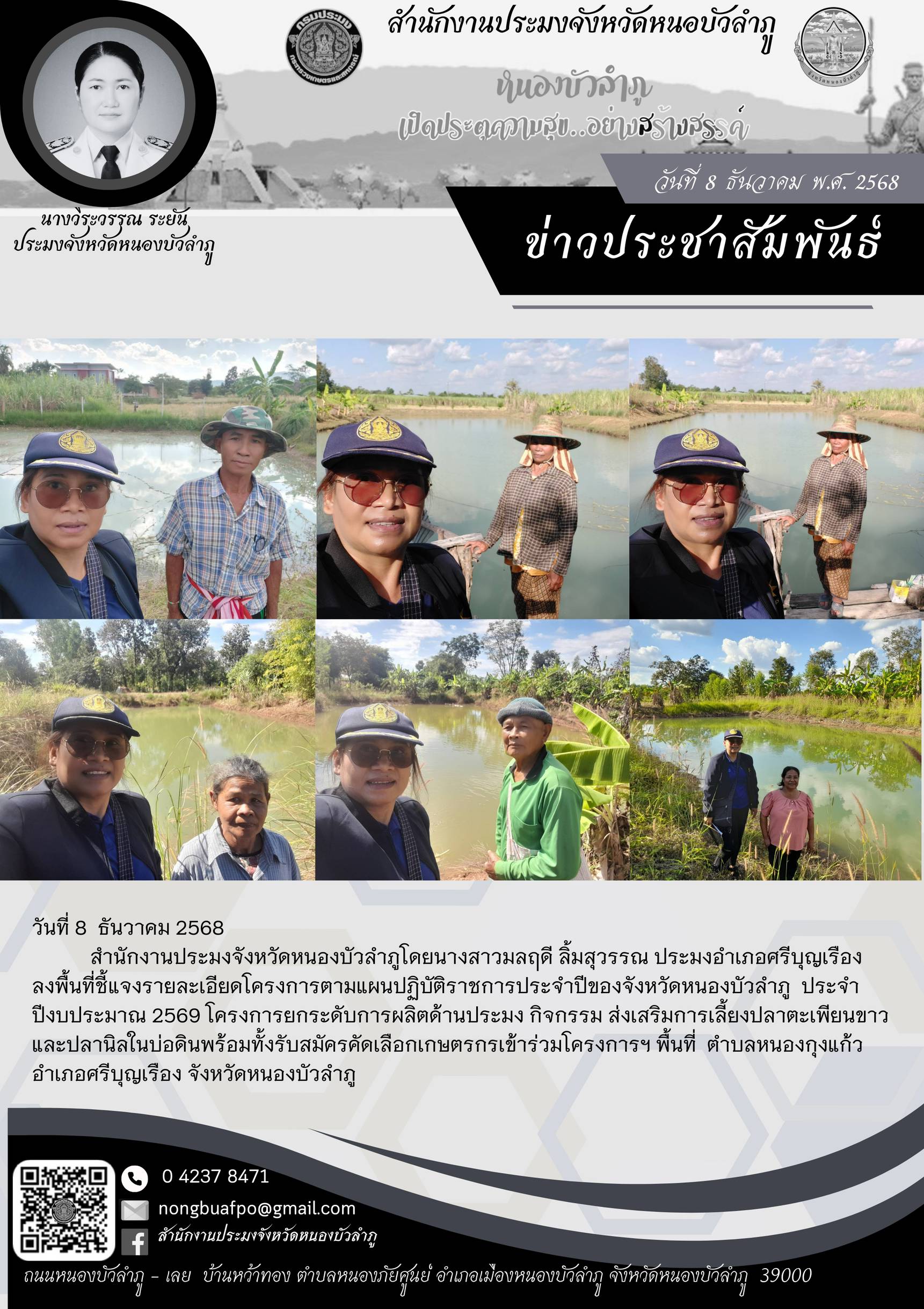 ลงพื้นที่ชี้แจงรายละเอียดโครงการตามแผนปฏิบัติราชการประจำปีของจังหวัดหนองบัวลำภู ประจำปีงบประมาณ 2569 โครงการยกระดับการผลิตด้านประมง กิจกรรม ส่งเสริมการเลี้ยงปลาตะเพียนขาวและปลานิลในบ่อดิน