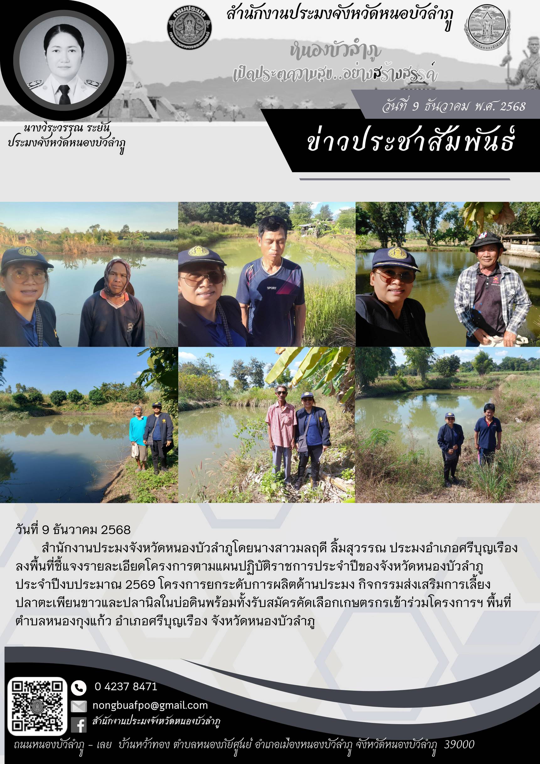 สำนักงานประมงจังหวัดหนองบัวลำภูโดยนางสาวมลฤดี ลิ้มสุวรรณ ประมงอำเภอศรีบุญเรือง ลงพื้นที่ชี้แจงรายละเอียดโครงการตามแผนปฏิบัติราชการประจำปีของจังหวัดหนองบัวลำภู ประจำปีงบประมาณ 2569 โครงการยกระดับการผลิตด้านประมง กิจกรรมส่งเสริมการเลี้ยง ปลาตะเพียนขาวและปลานิลในบ่อดินพร้อมทั้งรับสมัครคัดเลือกเกษตรกรเข้าร่วมโครงการฯ พื้นที่ ตำบลหนองกุงแก้ว อำเภอศรีบุญเรือง จังหวัดหนองบัวลำภู