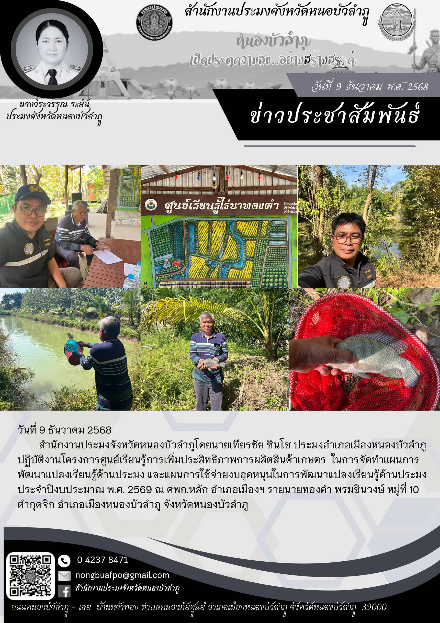 สำนักงานประมงจังหวัดหนองบัวลำภูโดยนายเทียรชัย ซินโซ ประมงอำเภอเมืองหนองบัวลำภู ปฏิบัติงานโครงการศูนย์เรียนรู้การเพิ่มประสิทธิภาพการผลิตสินค้าเกษตร ในการจัดทำแผนการพัฒนาแปลงเรียนรู้ด้านประมง และแผนการใช้จ่ายงบอุดหนุนในการพัฒนาแปลงเรียนรู้ด้านประมง ประจำปีงบประมาณ พ.ศ. 2569 ณ ศพก.หลัก อำเภอเมืองฯ รายนายทองคำ พรมชินวงษ์ หมู่ที่ 10 ตำกุดจิก อำเภอเมืองหนองบัวลำภู จังหวัดหนองบัวลำภู
