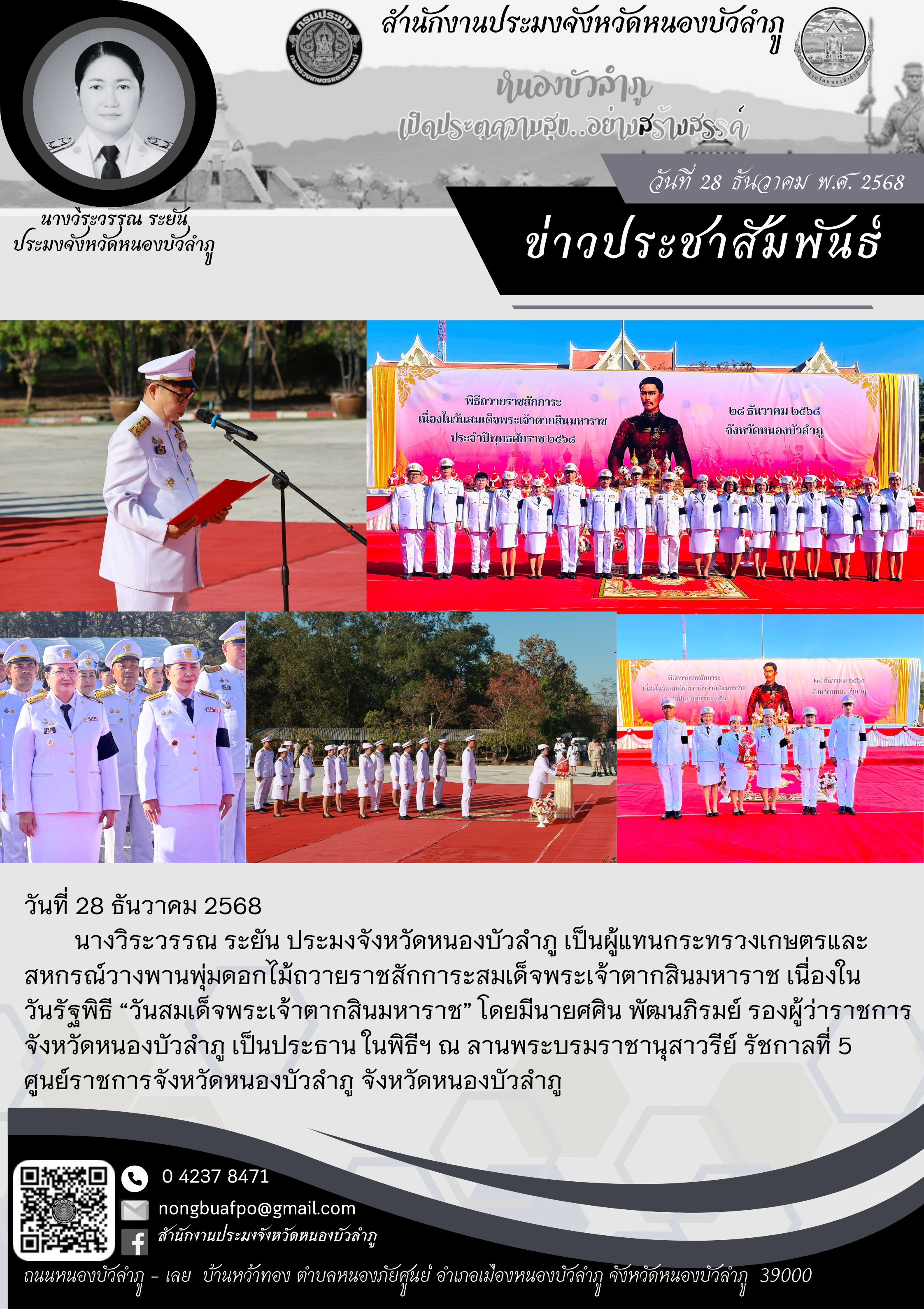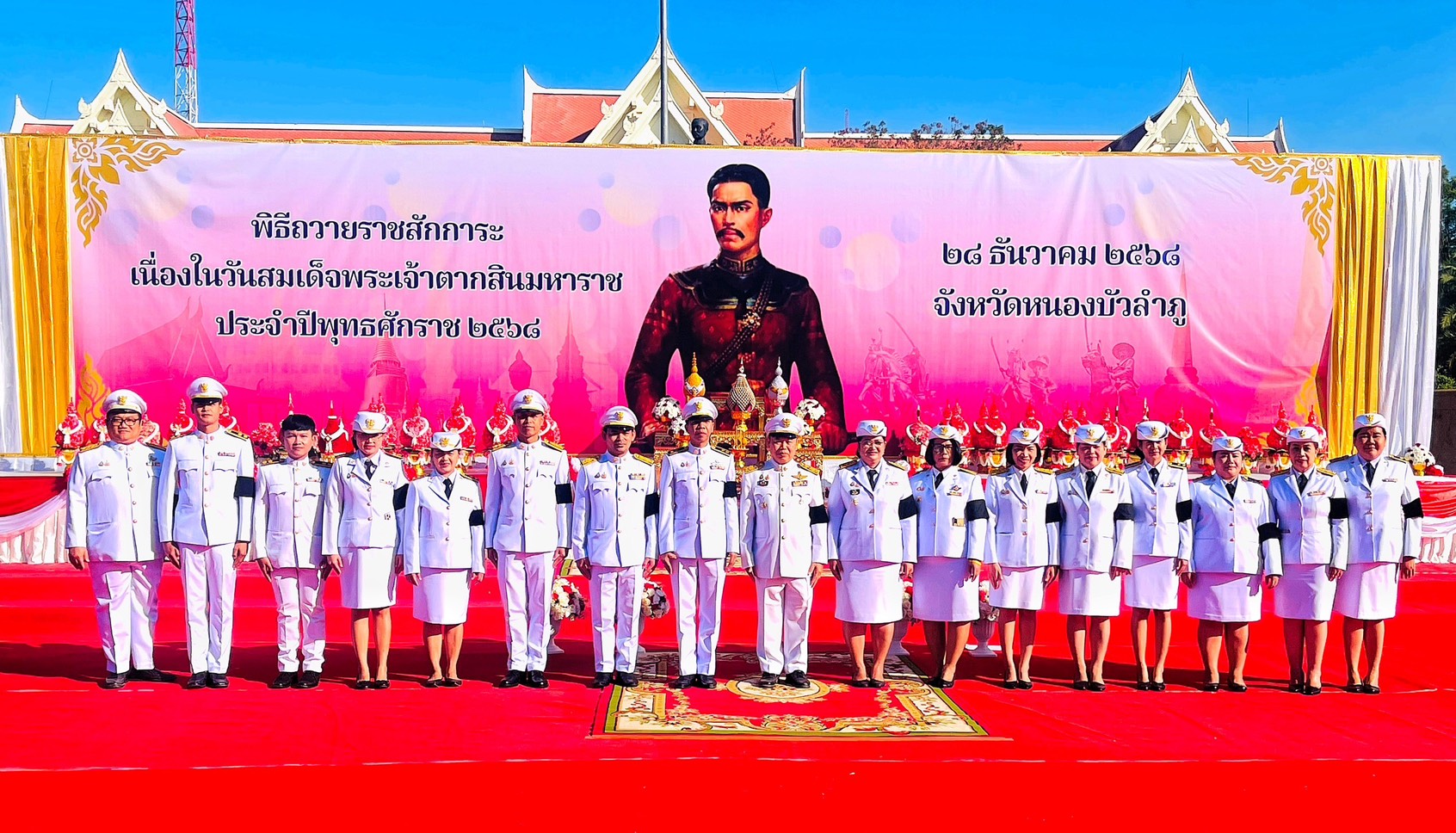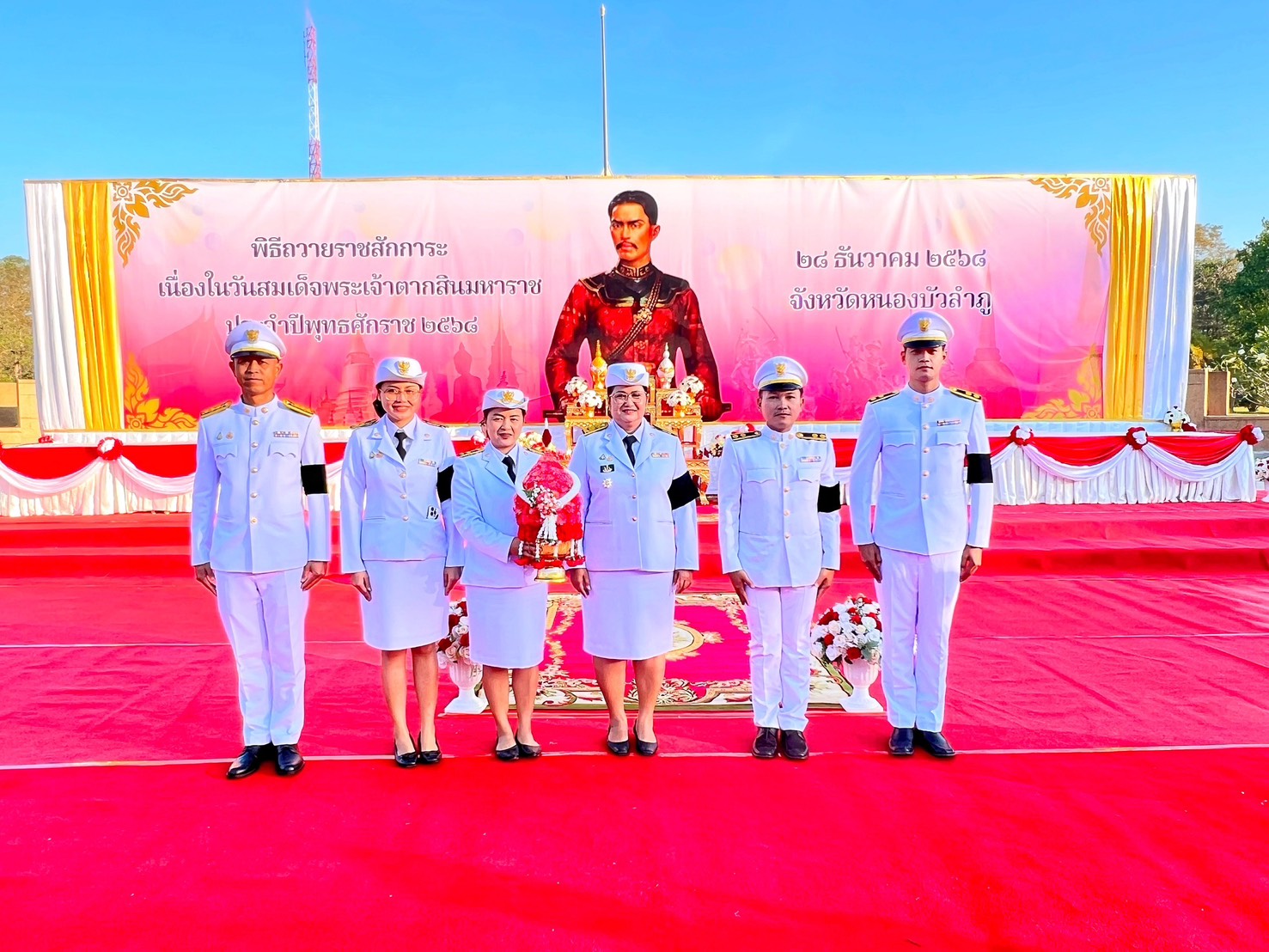 นางวิระวรรณ ระยัน ประมงจังหวัดหนองบัวลำภู เป็นผู้แทนกระทรวงเกษตรและสหกรณ์วางพานพุ่มดอกไม้ถวายราชสักการะสมเด็จพระเจ้าตากสินมหาราช เนื่องในวันรัฐพิธี “วันสมเด็จพระเจ้าตากสินมหาราช” โดยมีนายศศิน พัฒนภิรมย์ รองผู้ว่าราชการจังหวัดหนองบัวลำภู เป็นประธาน ในพิธีฯ ณ ลานพระบรมราชานุสาวรีย์ รัชกาลที่ 5 ศูนย์ราชการจังหวัดหนองบัวลำภู จังหวัดหนองบัวลำภู