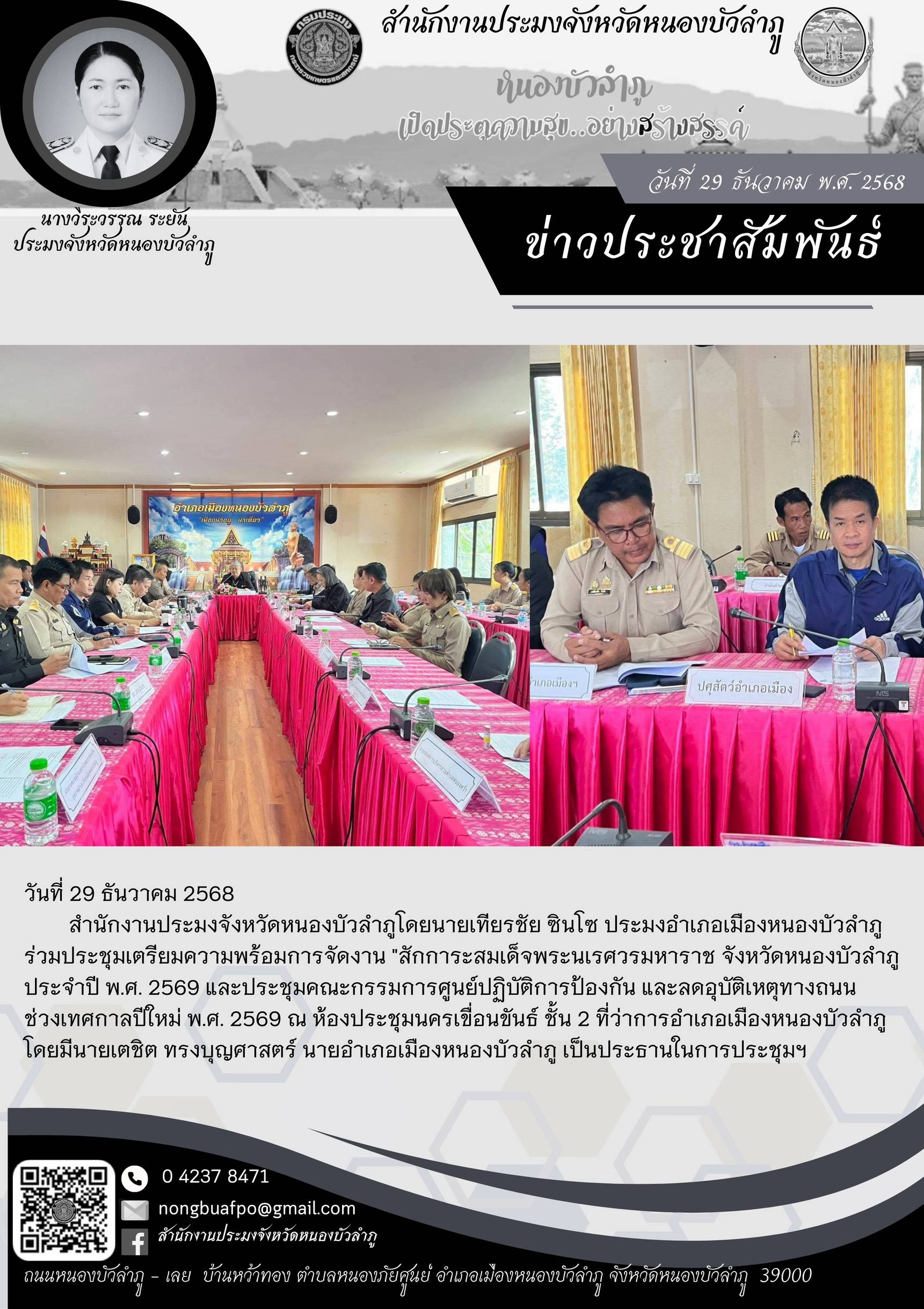 สำนักงานประมงจังหวัดหนองบัวลำภูโดยนายเทียรชัย ซินโซ ประมงอำเภอเมืองหนองบัวลำภู ร่วมประชุมเตรียมความพร้อมการจัดงาน "สักการะสมเด็จพระนเรศวรมหาราช จังหวัดหนองบัวลำภู ประจำปี พ.ศ. 2569 และประชุมคณะกรรมการศูนย์ปฏิบัติการป้องกัน และลดอุบัติเหตุทางถนน ช่วงเทศกาลปีใหม่ พ.ศ. 2569 ณ ห้องประชุมนครเขื่อนขันธ์ ชั้น 2 ที่ว่าการอำเภอเมืองหนองบัวลำภู โดยมีนายเตชิต ทรงบุญศาสตร์ นายอำเภอเมืองหนองบัวลำภู เป็นประธานในการประชุมฯ