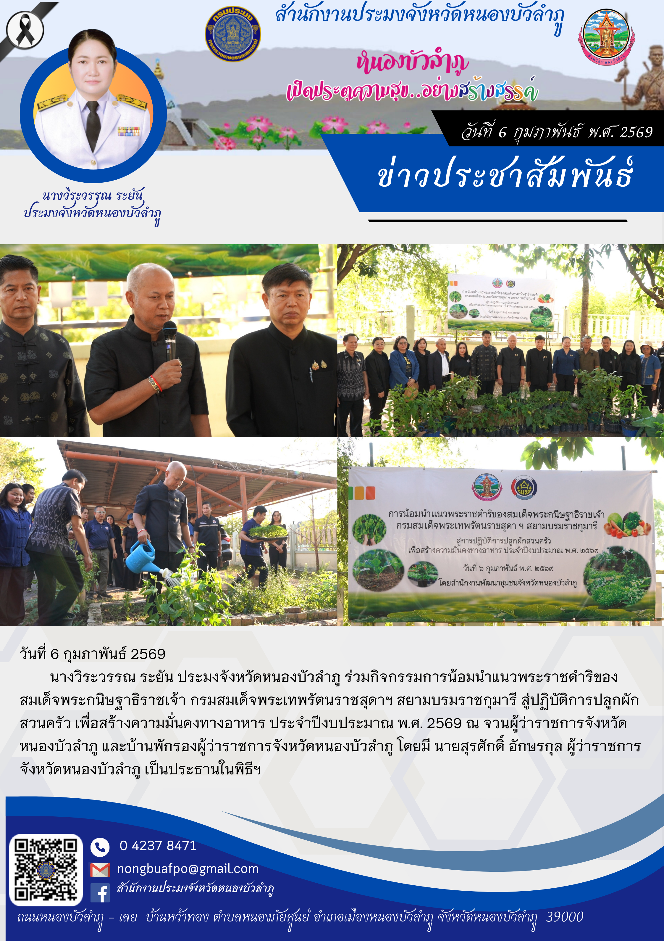นางวิระวรรณ ระยัน ประมงจังหวัดหนองบัวลำภู ร่วมกิจกรรมการน้อมนำแนวพระราชดำริของสมเด็จพระกนิษฐาธิราชเจ้า กรมสมเด็จพระเทพรัตนราชสุดาฯ สยามบรมราชกุมารี สู่ปฏิบัติการปลูกผักสวนครัว เพื่อสร้างความมั่นคงทางอาหาร ประจำปีงบประมาณ พ.ศ. 2569 ณ จวนผู้ว่าราชการจังหวัดหนองบัวลำภู และบ้านพักรองผู้ว่าราชการจังหวัดหนองบัวลำภู โดยมี นายสุรศักดิ์ อักษรกุล ผู้ว่าราชการจังหวัดหนองบัวลำภู เป็นประธานในพิธีฯ