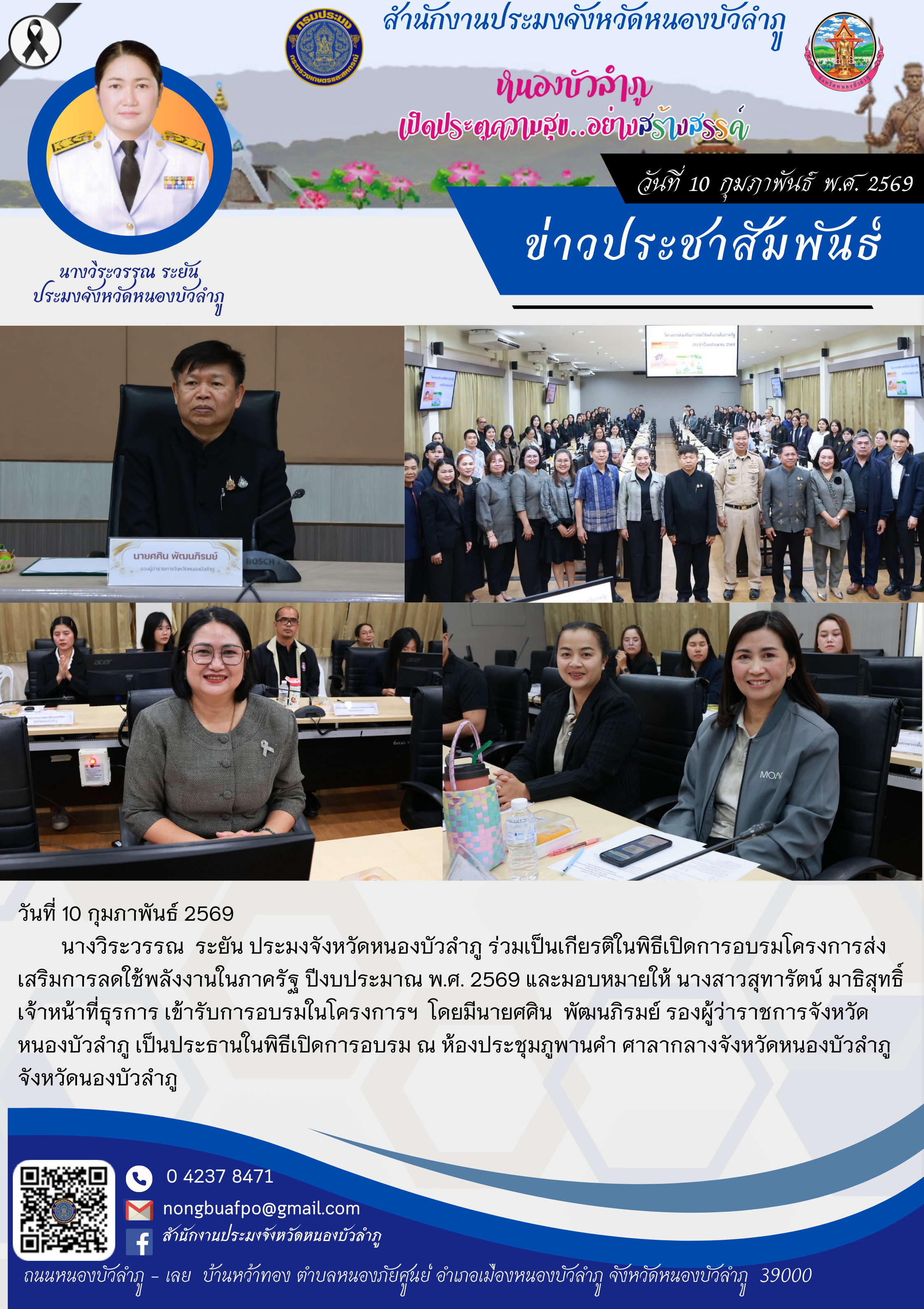 นางวิระวรรณ ระยัน ประมงจังหวัดหนองบัวลำภู ร่วมเป็นเกียรติในพิธีเปิดการอบรมโครงการส่งเสริมการลดใช้พลังงานในภาครัฐ ปีงบประมาณ พ.ศ. 2569 และมอบหมายให้ นางสาวสุทารัตน์ มาธิสุทธิ์ เจ้าหน้าที่ธุรการ เข้ารับการอบรมในโครงการฯ โดยมีนายศศิน พัฒนภิรมย์ รองผู้ว่าราชการจังหวัดหนองบัวลำภู เป็นประธานในพิธีเปิดการอบรม ณ ห้องประชุมภูพานคำ ศาลากลางจังหวัดหนองบัวลำภู จังหวัดนองบัวลำภูวันที่ 10 กุมภาพันธ์ 2569