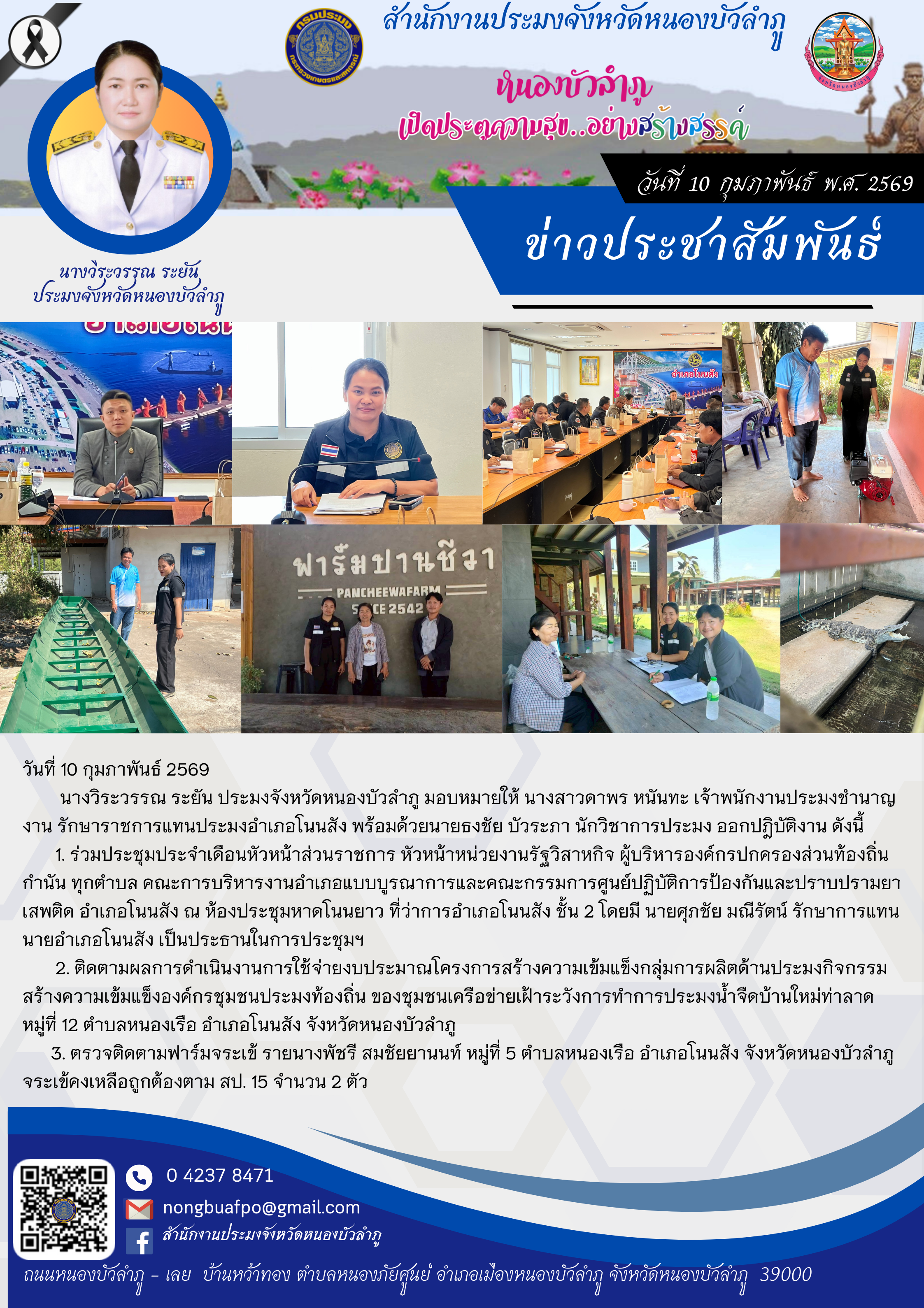 นางวิระวรรณ ระยัน ประมงจังหวัดหนองบัวลำภู มอบหมายให้ นางสาวดาพร หนันทะ เจ้าพนักงานประมงชำนาญงาน รักษาราชการแทนประมงอำเภอโนนสัง พร้อมด้วยนายธงชัย บัวระภา นักวิชาการประมง ออกปฎิบัติงาน ดังนี้