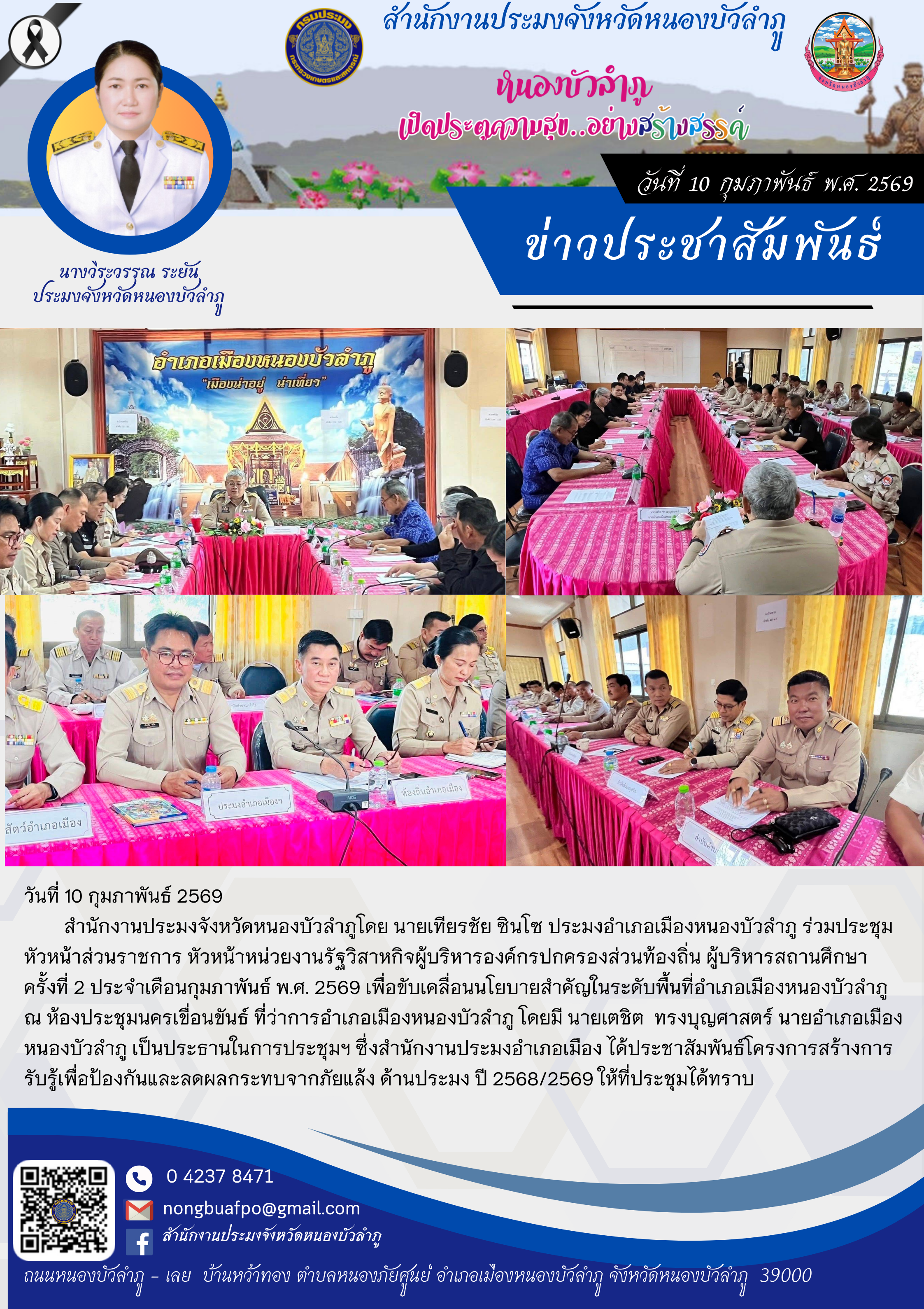 สำนักงานประมงจังหวัดหนองบัวลำภูโดย นายเทียรชัย ซินโซ ประมงอำเภอเมืองหนองบัวลำภู ร่วมประชุมหัวหน้าส่วนราชการ หัวหน้าหน่วยงานรัฐวิสาหกิจผู้บริหารองค์กรปกครองส่วนท้องถิ่น ผู้บริหารสถานศึกษา ครั้งที่ 2 ประจำเดือนกุมภาพันธ์ พ.ศ. 2569 เพื่อขับเคลื่อนนโยบายสำคัญในระดับพื้นที่อำเภอเมืองหนองบัวลำภู ณ ห้องประชุมนครเขื่อนขันธ์ ที่ว่าการอำเภอเมืองหนองบัวลำภู โดยมี นายเตชิต ทรงบุญศาสตร์ นายอำเภอเมืองหนองบัวลำภู เป็นประธานในการประชุมฯ ซึ่งสำนักงานประมงอำเภอเมือง ได้ประชาสัมพันธ์โครงการสร้างการรับรู้เพื่อป้องกันและลดผลกระทบจากภัยแล้ง ด้านประมง ปี 2568/2569 ให้ที่ประชุมได้ทราบ